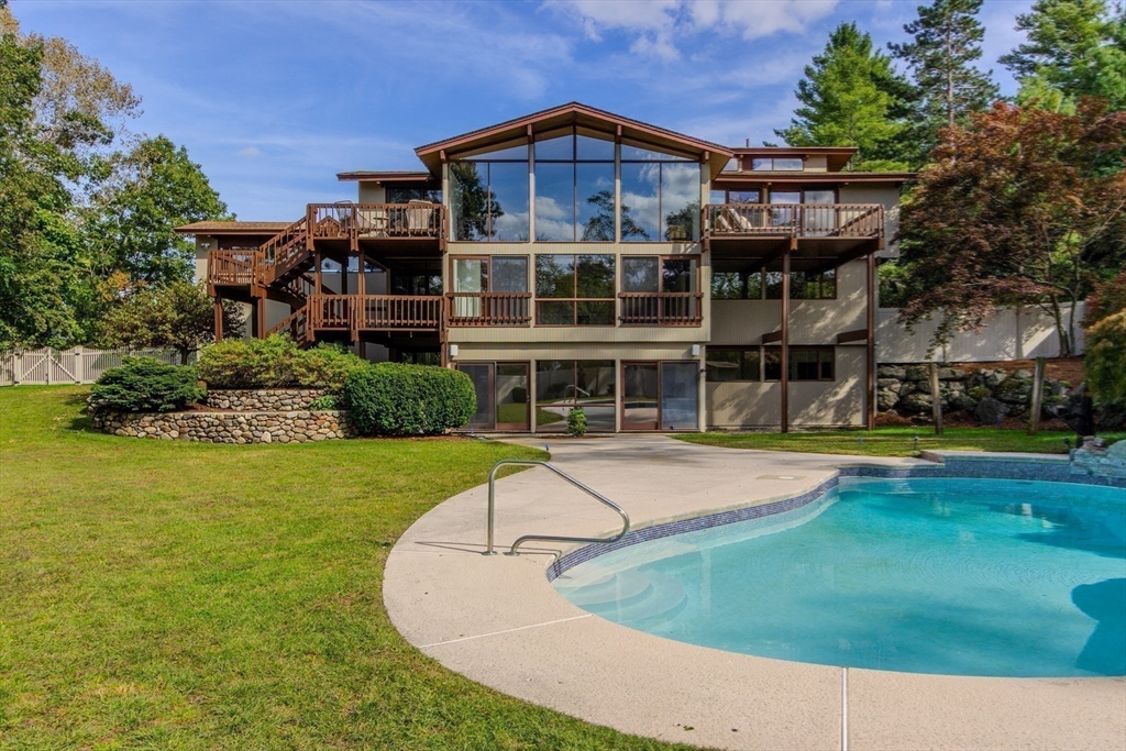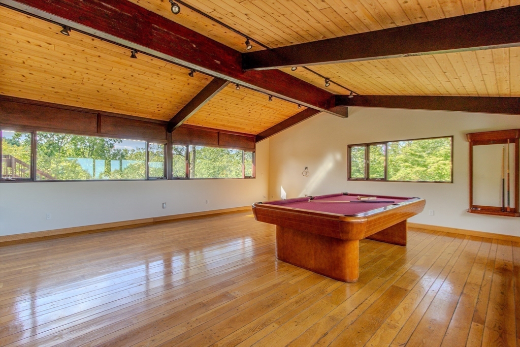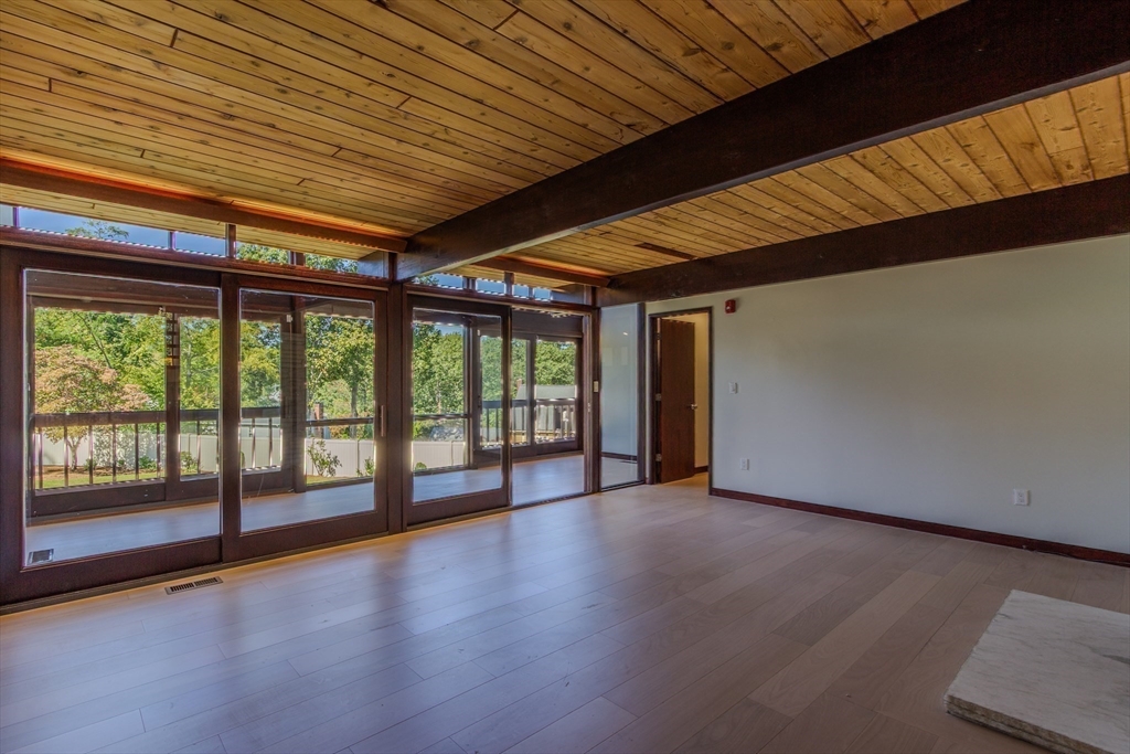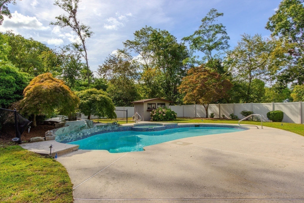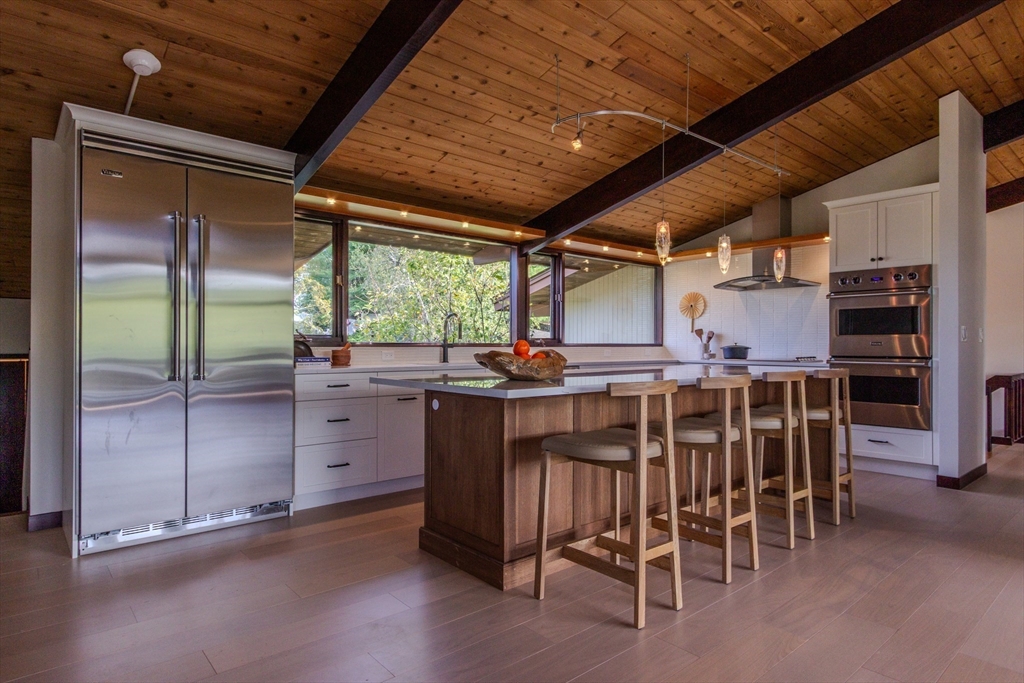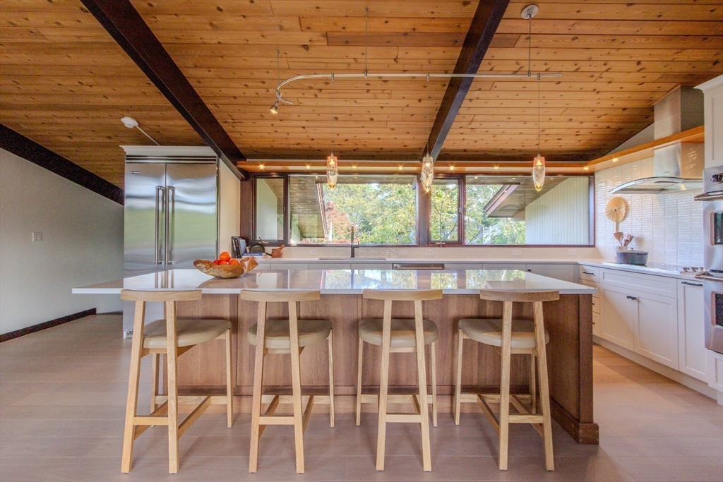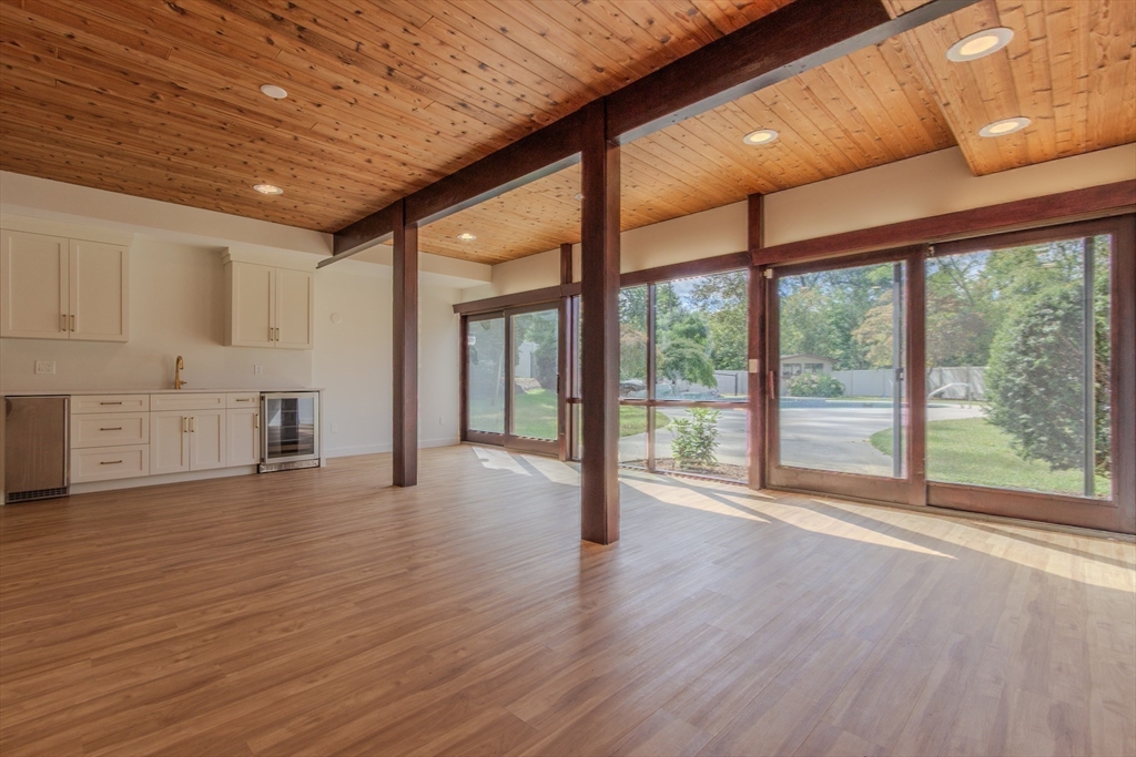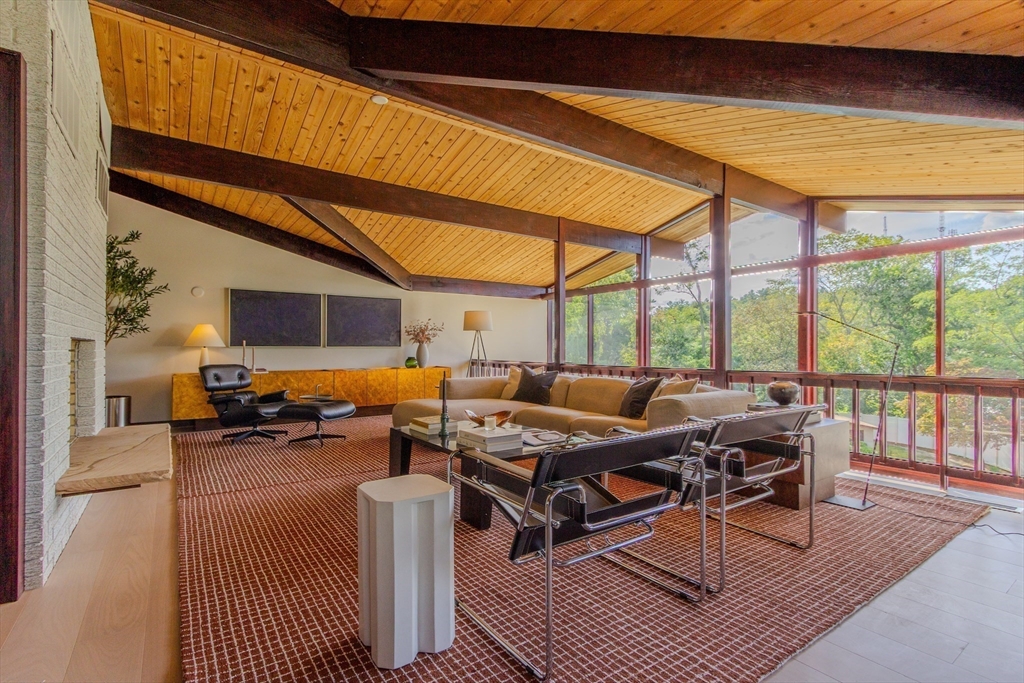 Spectacular new renovation by noted builder. This multi-level contemporary home features vaulted ceilings and an open-concept main floor. The updated Viking kitchen with large breakfast island, flows into the living and dining rooms, offering floor-to-ceiling views of the pool, jacuzzi, and fenced yard. A large bonus room, currently a library/game room. The primary suite is open and airy, with a slider to a private deck and a spa-like marble bath with a separate soaking tub, large shower, and double vanity. This floor also includes an additional home office and guest bath. A second family room, three additional bedrooms, a full bath, laundry, and a glass-enclosed sun room complete this level. The walk-out lower level offers an in-law suite or recreation space with a large bedroom, full bath, living area and prep/wet bar built ins, with direct access to the in-ground Gunite pool and yard. Two car garage under.