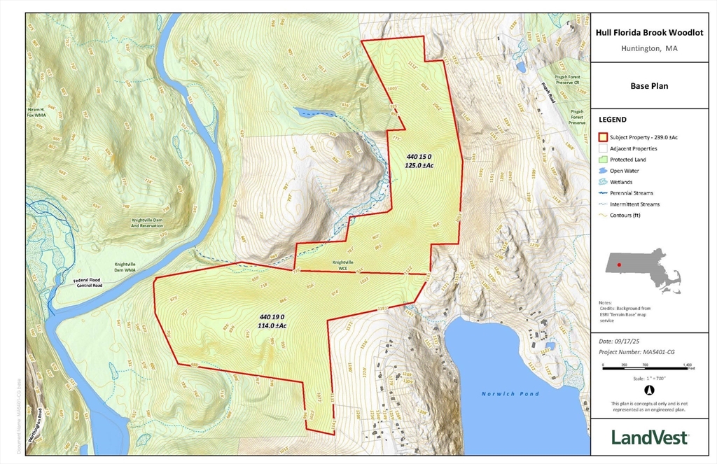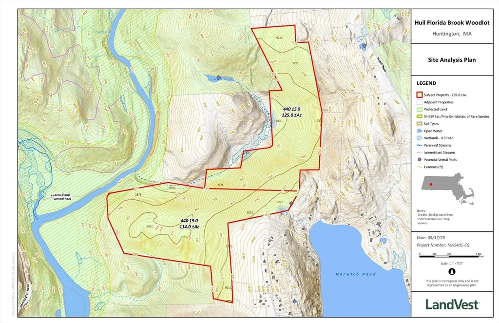 Known as the Florida Brook Lot this is 239 acres of forest land off Pond Hill Road Huntington, MA. The property is subject to a permanent Conservation Restriction held by the Mass Div Fisheries and Wildlife, which allows public access.  The property has been managed by professional foresters for over 50 years and supports a forest of red oak, red maple, birch, white pine and hemlock.  A recent timber inventory identified a total volume of 1,290 Mbdft of timber and  2226 cords with an estimated value of approximately $130,000.   Property is classified under Chapter 61 for reduced property assessment.  Deeded access is through a house and barn, so owners allow access a bit south through their fields.  Gates must be closed as you pass through to prohibit the cows from getting out. CR is in Book 5971 Page 126.  Forest management plan and recent timber inventory are in the documents section.