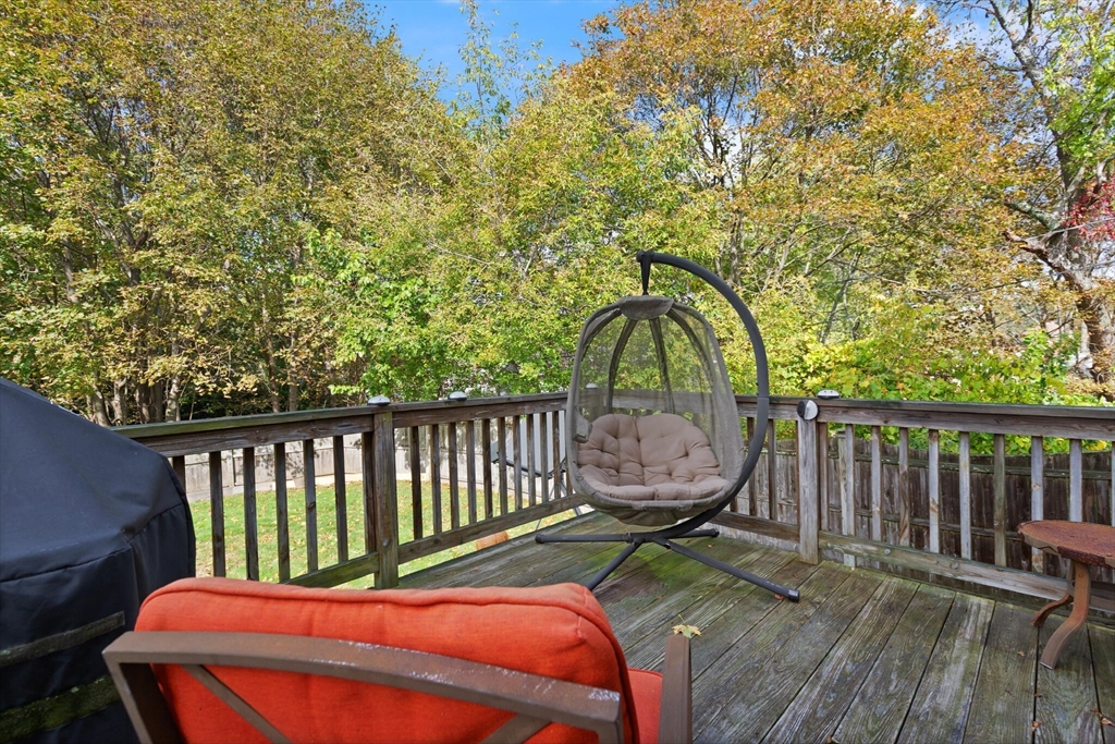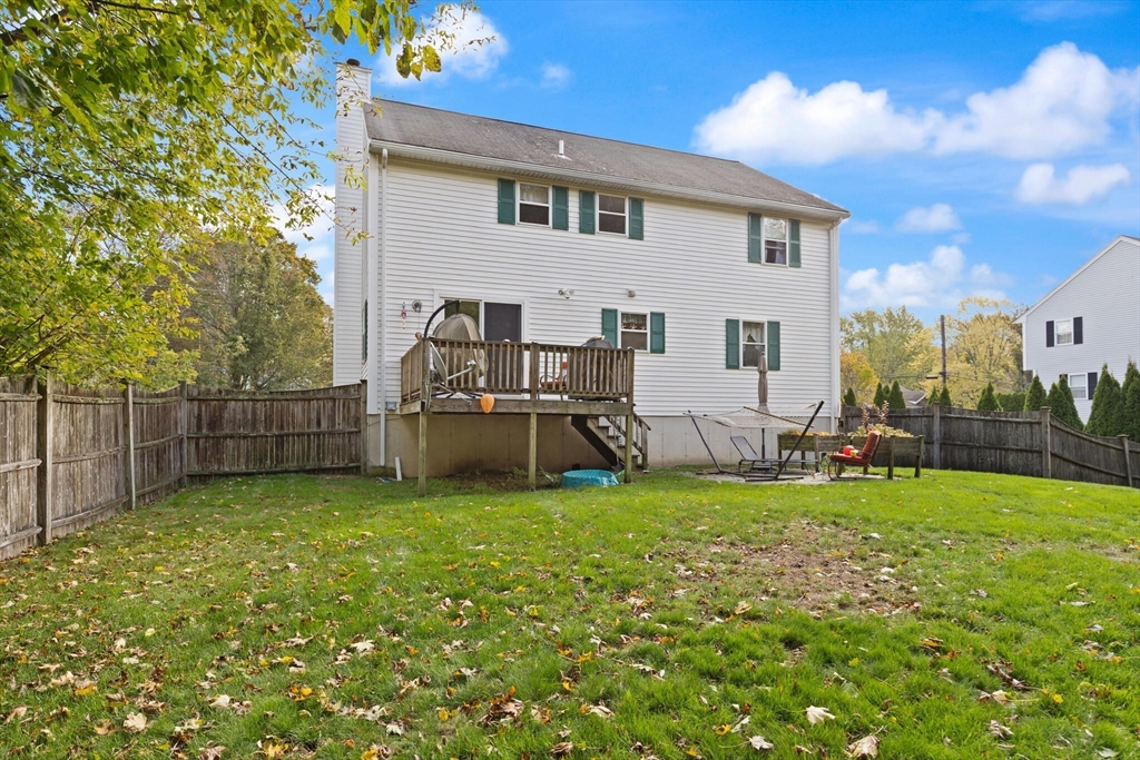 Built in 1999 on an expansive 25,000+ sq. ft. lot, this spacious Colonial sits in a well-located neighborhood close to schools, shopping, and restaurants. A long driveway leads to a 2-car garage and a fully fenced backyard—ideal for pets, play, and outdoor gatherings. The home features 4 bedrooms, 2.5 baths, and a traditional, inviting layout. The fireplaced front-to-back family room opens through glass doors to a deck overlooking a private yard with wooded views. The sunny eat-in kitchen is perfect for everyday meals, while the living room and half bath complete the first floor. Upstairs are 4 comfortable bedrooms, including a generous Primary Suite with a full bath. The unfinished basement offers great ceiling height and potential for future living space, gym, or playroom. A wonderful opportunity for anyone seeking space and convenience in a beautiful setting.