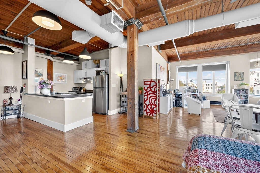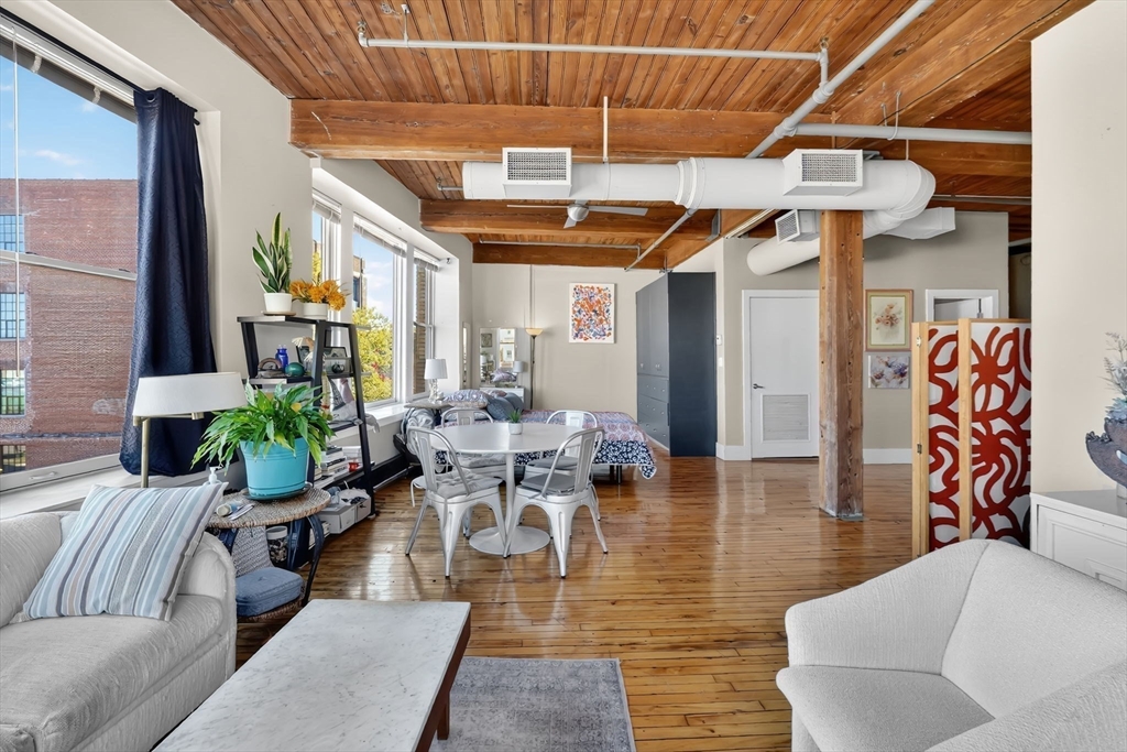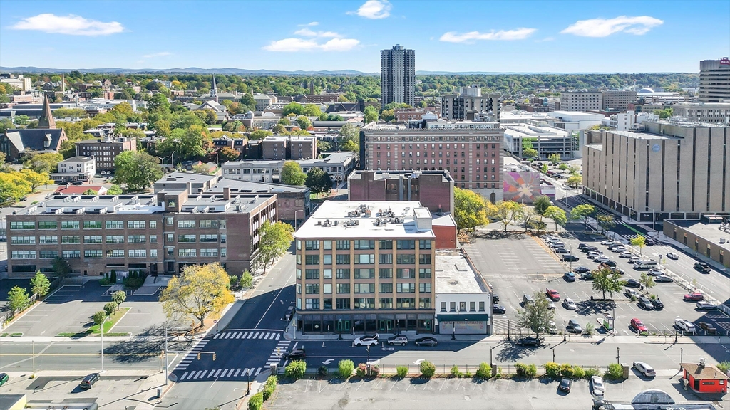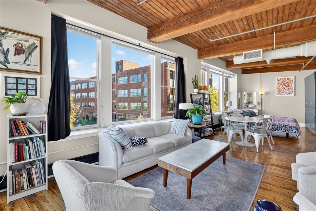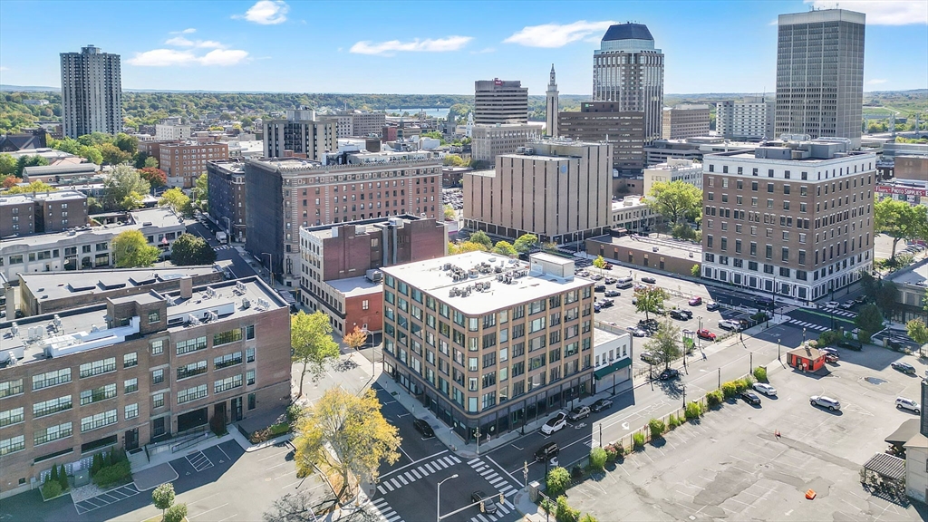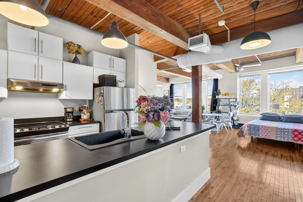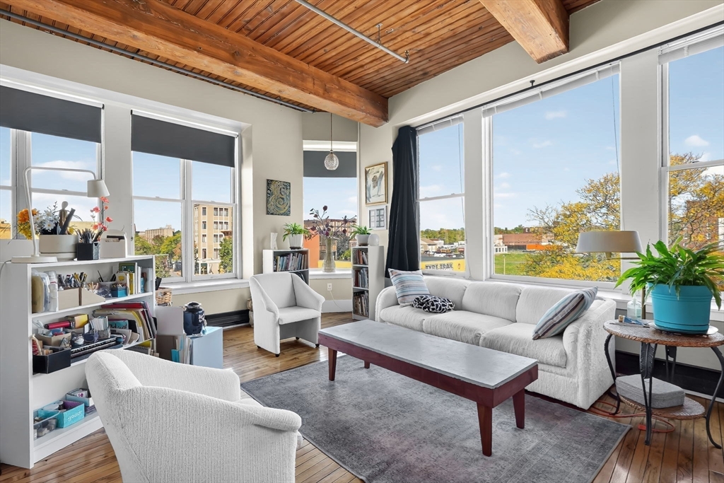 Experience city living at its finest in this one-of-a-kind condo at the iconic McIntosh Building in the heart of Downtown Springfield! The city is in the midst of an incredible renaissance—a short walk from MGM Casino, new restaurants, cafés, music venues, and the soon-to-come new courthouse. This unit is truly the coolest condo in Western Mass—offering a Boston vibe without the Boston price tag. Enjoy stunning city views from two walls of oversized windows, soaring timber wood-beam ceilings, and an open floor plan that blends warmth and style. The updated kitchen shines with stainless steel appliances and modern finishes, while the hardwood floors and abundant natural light create a welcoming urban retreat. Perfect for anyone seeking a vibrant, walkable downtown lifestyle close to everything Springfield has to offer.