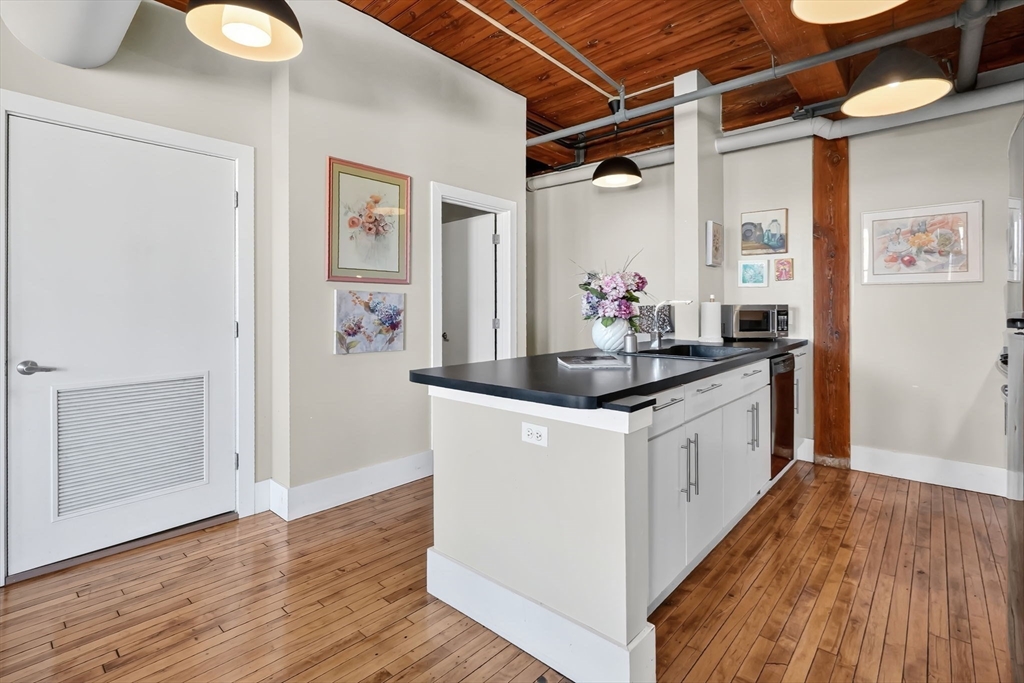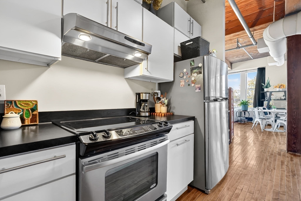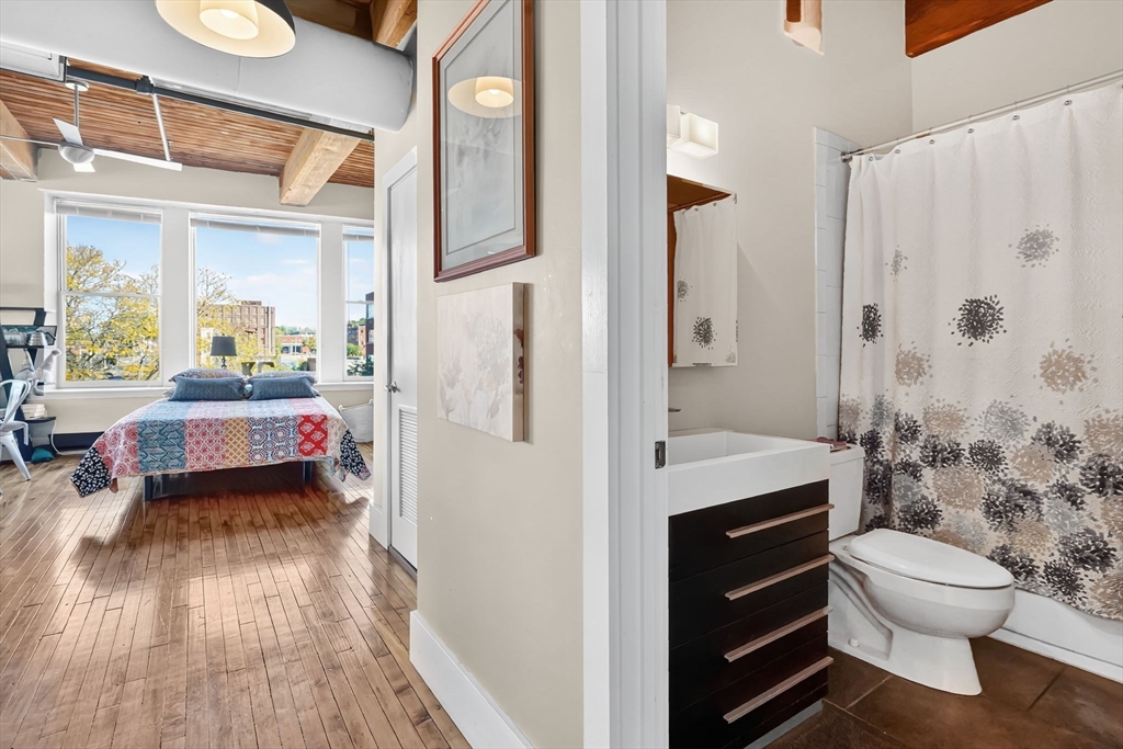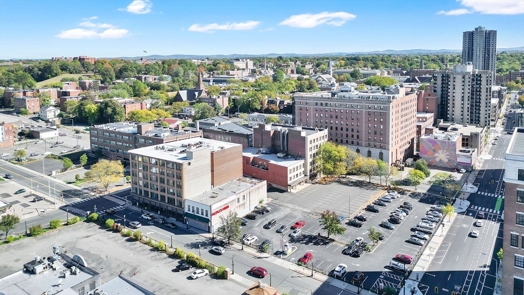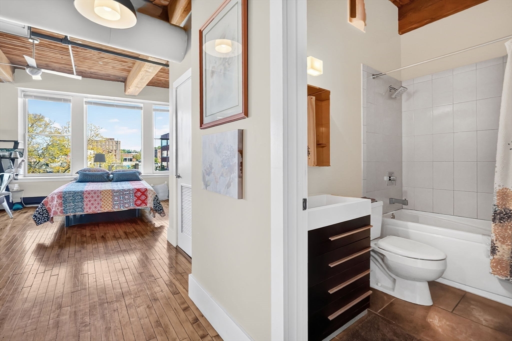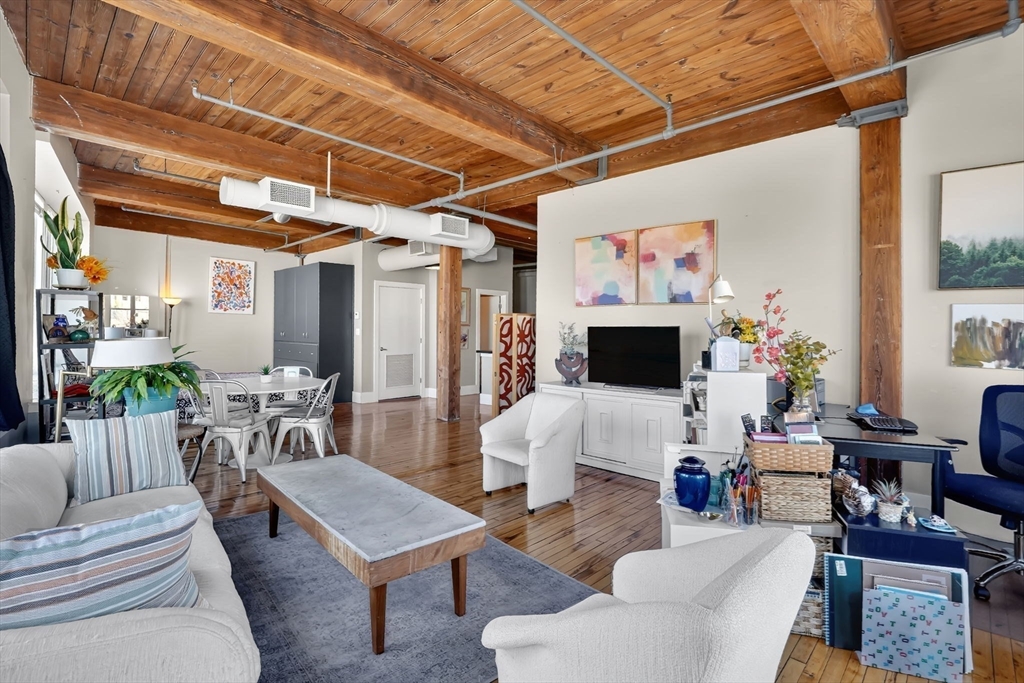 Experience city living at its finest in this one-of-a-kind condo at the iconic McIntosh Building in the heart of Downtown Springfield! The city is in the midst of an incredible renaissance—a short walk from MGM Casino, new restaurants, cafés, music venues, and the soon-to-come new courthouse. This unit is truly the coolest condo in Western Mass—offering a Boston vibe without the Boston price tag. Enjoy stunning city views from two walls of oversized windows, soaring timber wood-beam ceilings, and an open floor plan that blends warmth and style. The updated kitchen shines with stainless steel appliances and modern finishes, while the hardwood floors and abundant natural light create a welcoming urban retreat. Perfect for anyone seeking a vibrant, walkable downtown lifestyle close to everything Springfield has to offer.