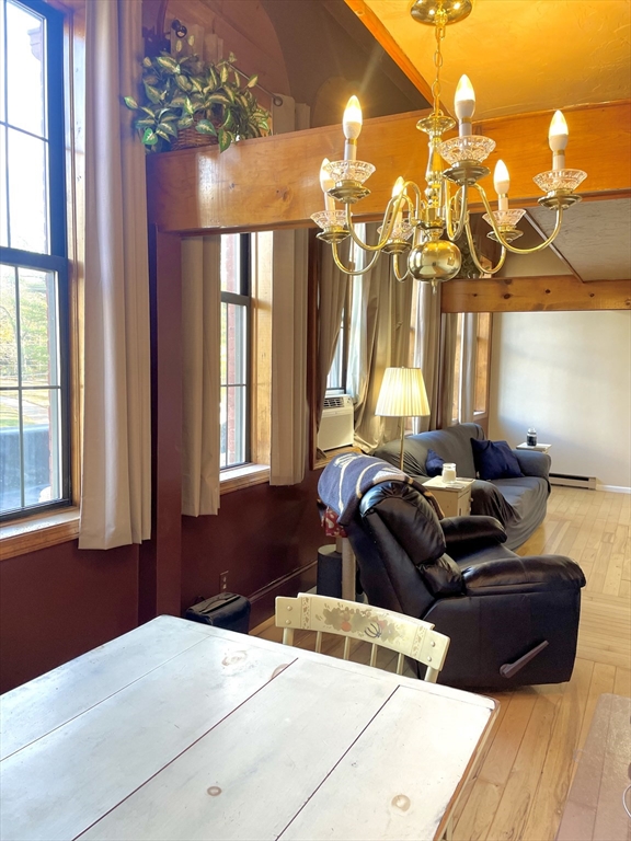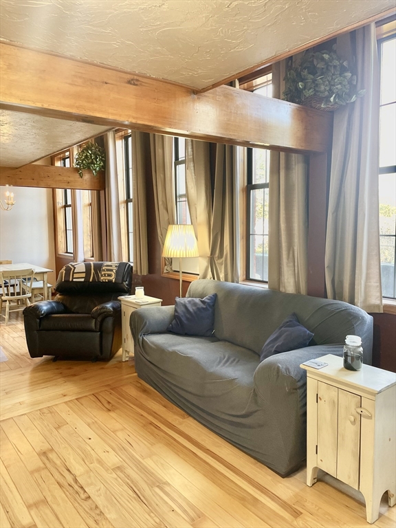 Loft-style living meets classic comfort in this two bedroom condo with rich hardwood floors and exposed beams that add architectural flair. The open design creates a bright, spacious feel-ideal for entertaining or unwinding. Upstairs is airy and light as it opens to the first floor. The main bedroom is spacious and includes two side by side closets with a dual entry to the full bathroom. The second bedroom has an extra walk-in closet for plenty of storage. Additional Keyed Storage in Lower Level. Enjoy the perfect balance of character, convenience, and contemporary living in a prime location. *Please note showings will begin at our Open House, Saturday, October 25, 2025.