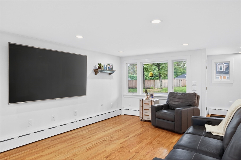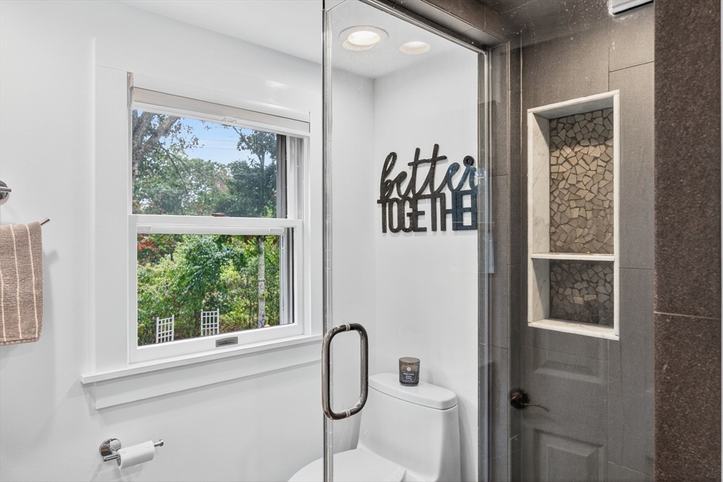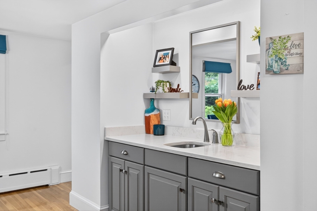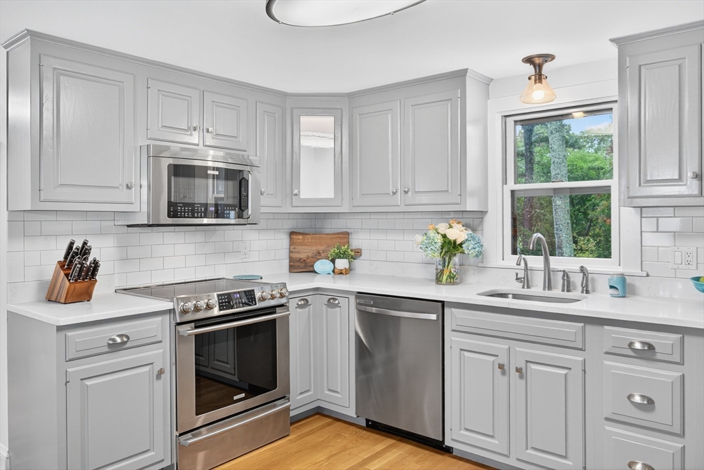 Charming Cape in Cotuit! Fall in love the moment you arrive at this beautifully updated home nestled in one of Cape Cod's most desirable villages. Step into a bright and welcoming living room featuring gleaming wood floors and a cozy fireplace, seamlessly flowing into a dining area with a built-in wet bar perfect for entertaining. The open-concept kitchen boasts quartz countertops, stainless steel appliances, and warm wood flooring throughout. A spacious family room offers a built-in breakfast nook and opens to a generous exterior deck, ideal for indoor-outdoor living. The first floor also includes a comfortable bedroom and a full bath, while upstairs you'll find two additional bedrooms and another full bath. Outside, enjoy gatherings around the fire pit, relax on the wood deck, and take advantage of two driveways, a storage shed, and a full-house generator for peace of mind. Conveniently located near local shops, Mashpee Commons, and the beautiful Cotuit beaches!