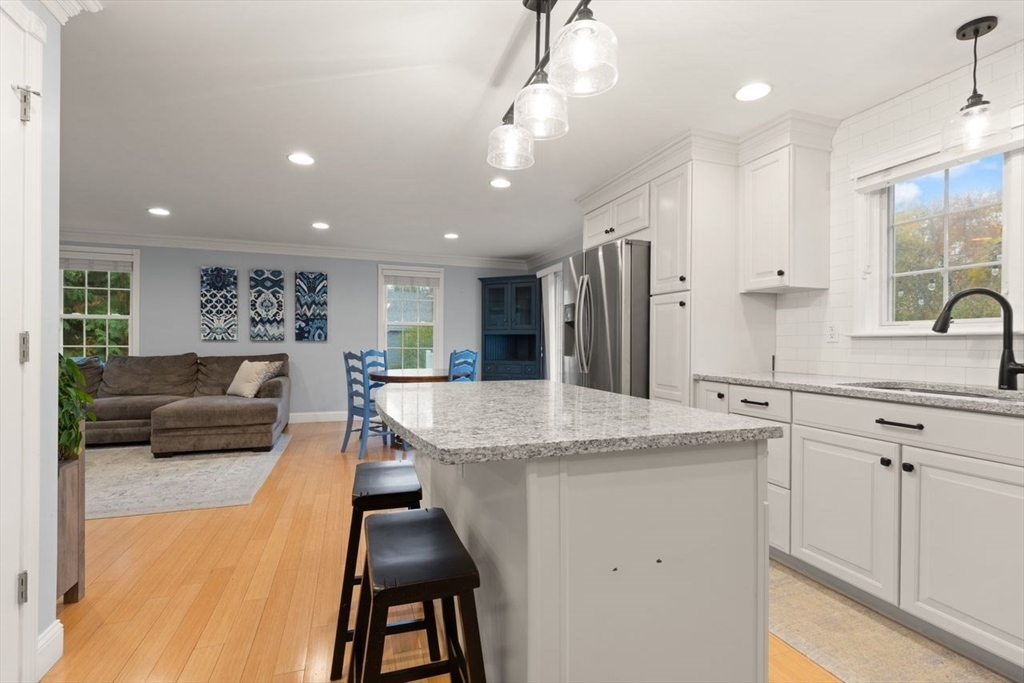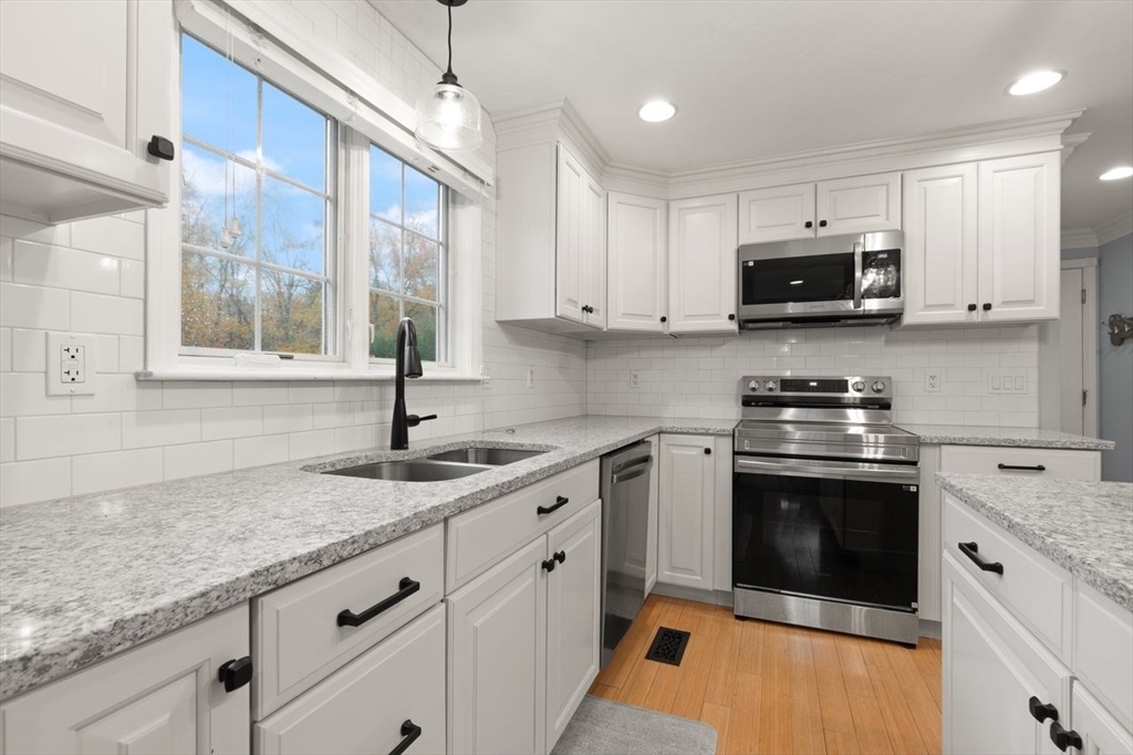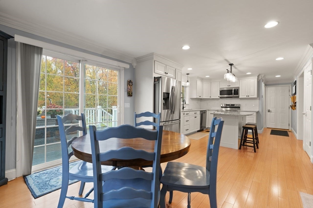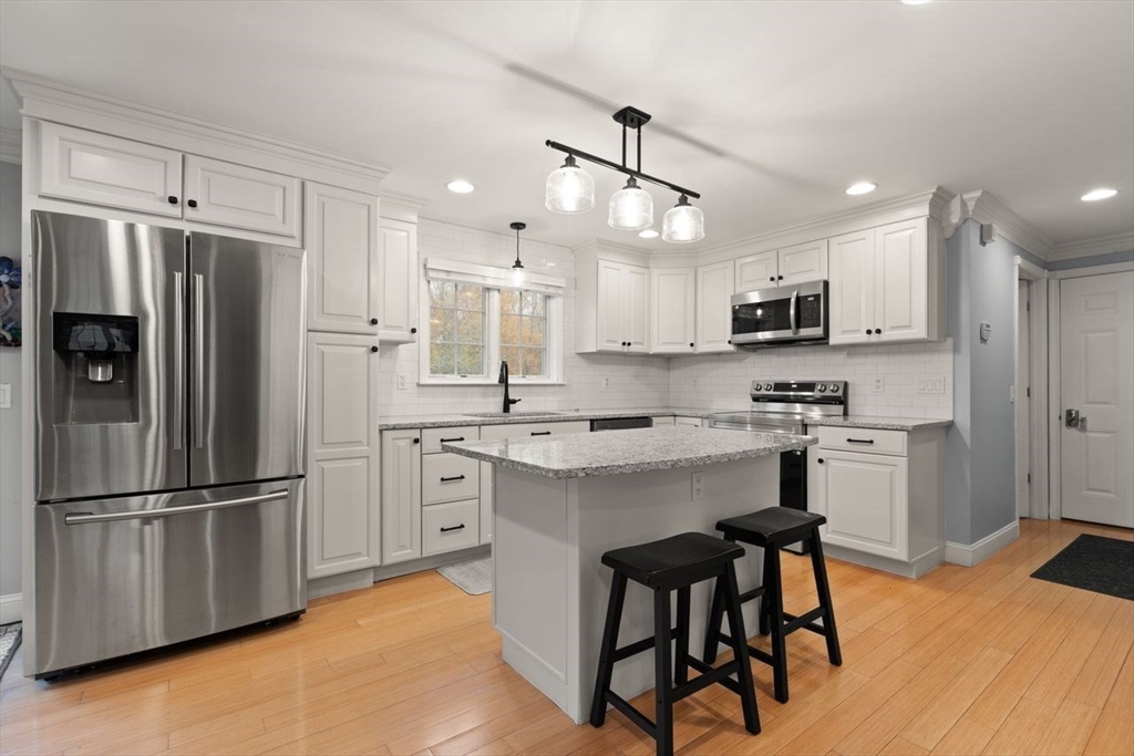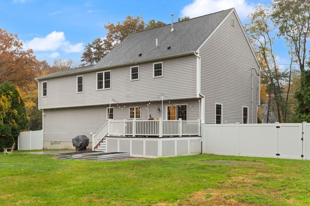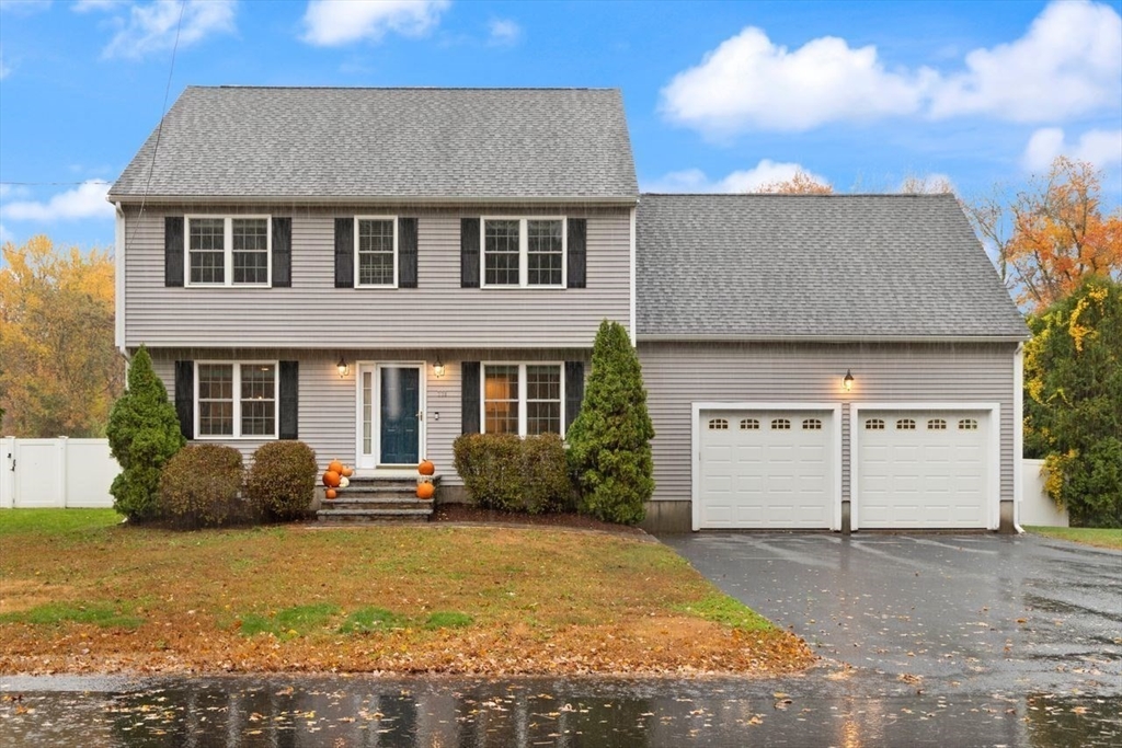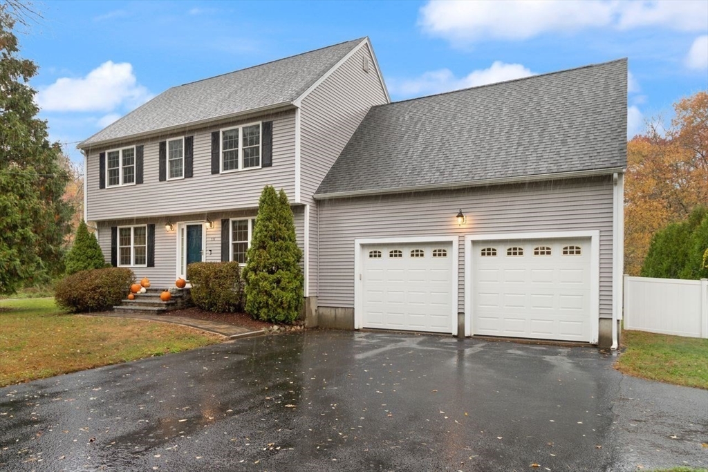 Well-maintained Garrison Colonial offering 3 bedrooms, 2.5 baths, and over 2,200 sq. ft. of finished space, not including a partially finished lower level. Originally built in 1963 and rebuilt in 2007, this home features hardwood floors throughout, crown molding, and detailed woodwork. The kitchen was updated in 2024 with white quartz countertops, new tile backsplash, stainless steel appliances, and modern lighting. A spacious bonus room over the garage offers flexible use as an office, living room, den, with potential to add an in-law suite. Recent upgrades include new garage doors (2023), stair runner (2025), and master bath fixtures (2024). The fenced backyard includes a Trex deck, stone patio, fire pit, and play set, providing a great setup for outdoor enjoyment. Energy improvements made through Mass Save in 2019. Two gas heating systems and two central A/C zones. Septic system installed in 2018. Move-in ready with thoughtful improvements throughout.