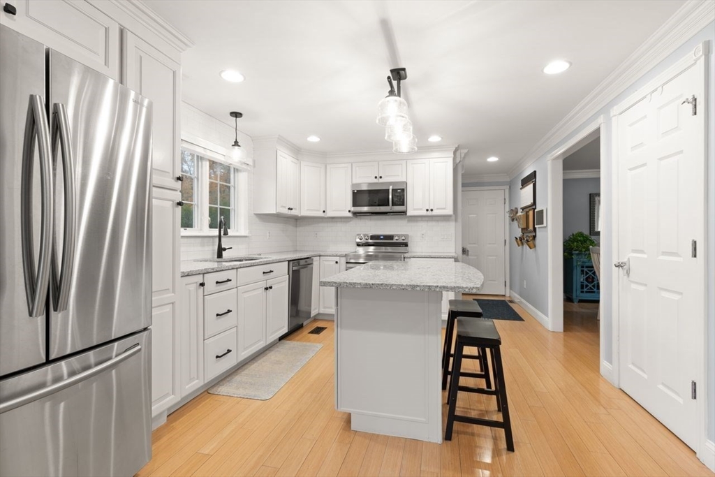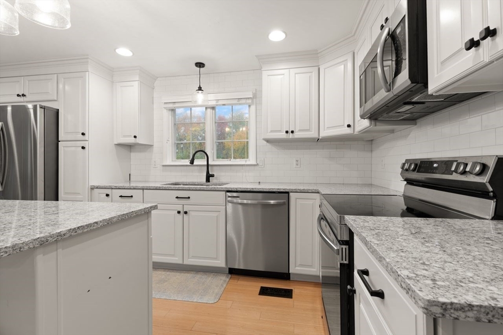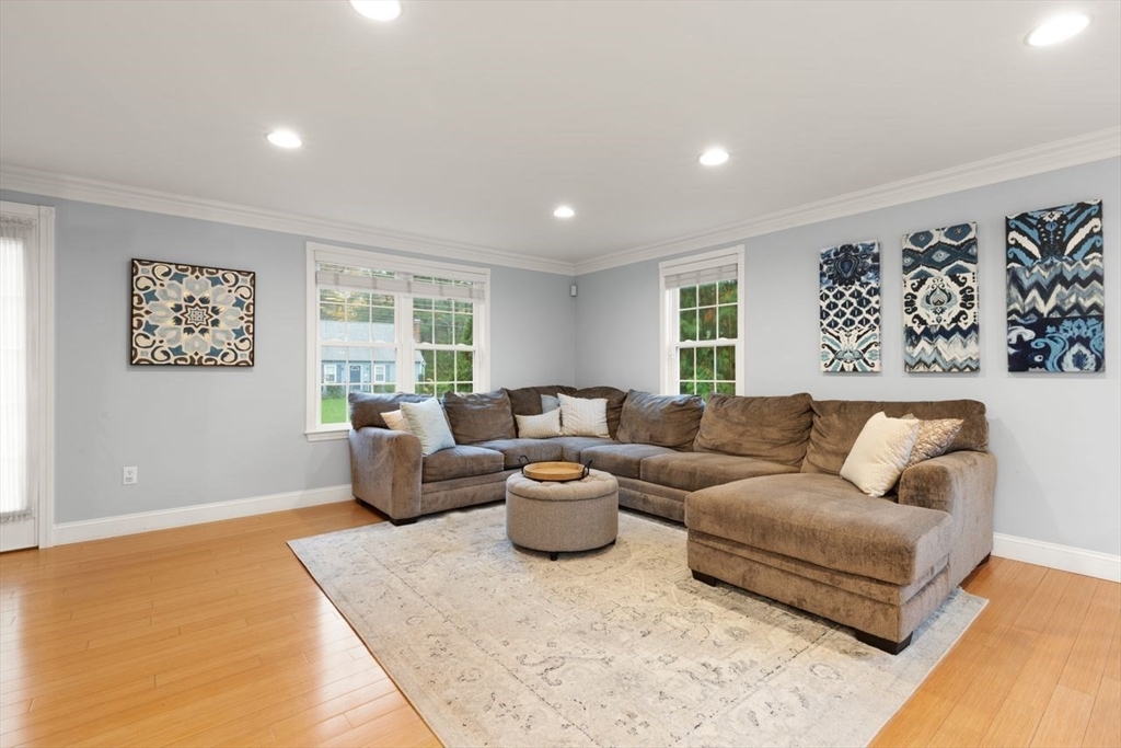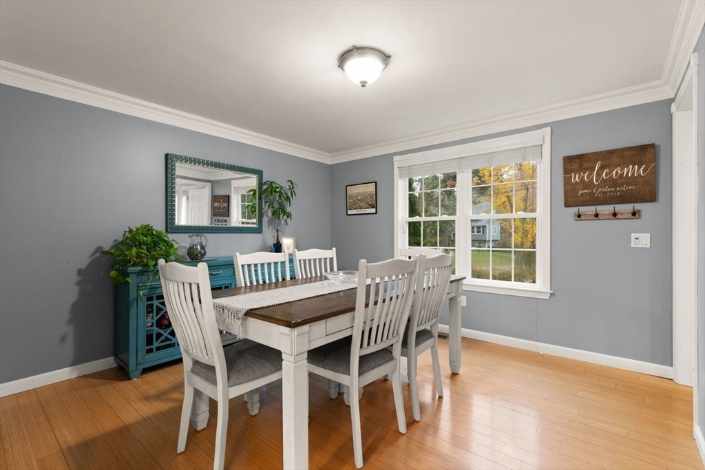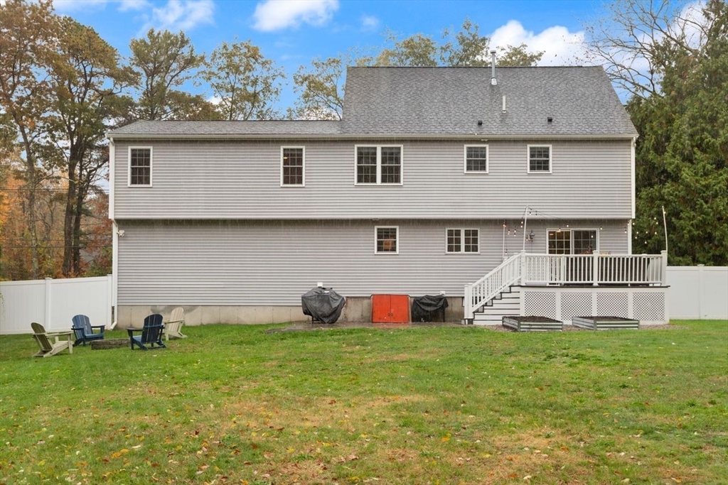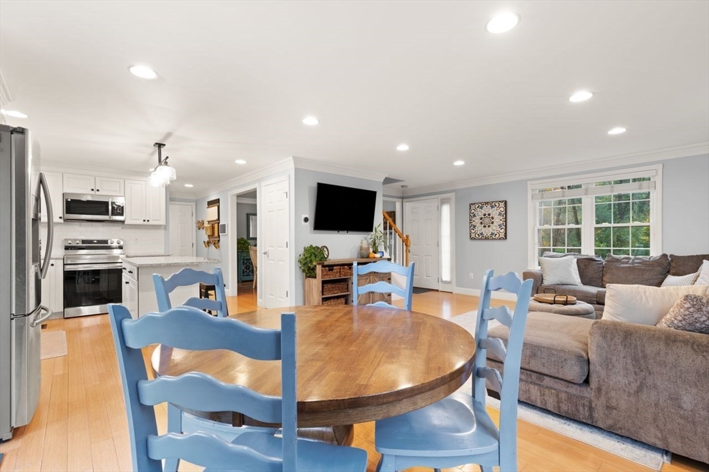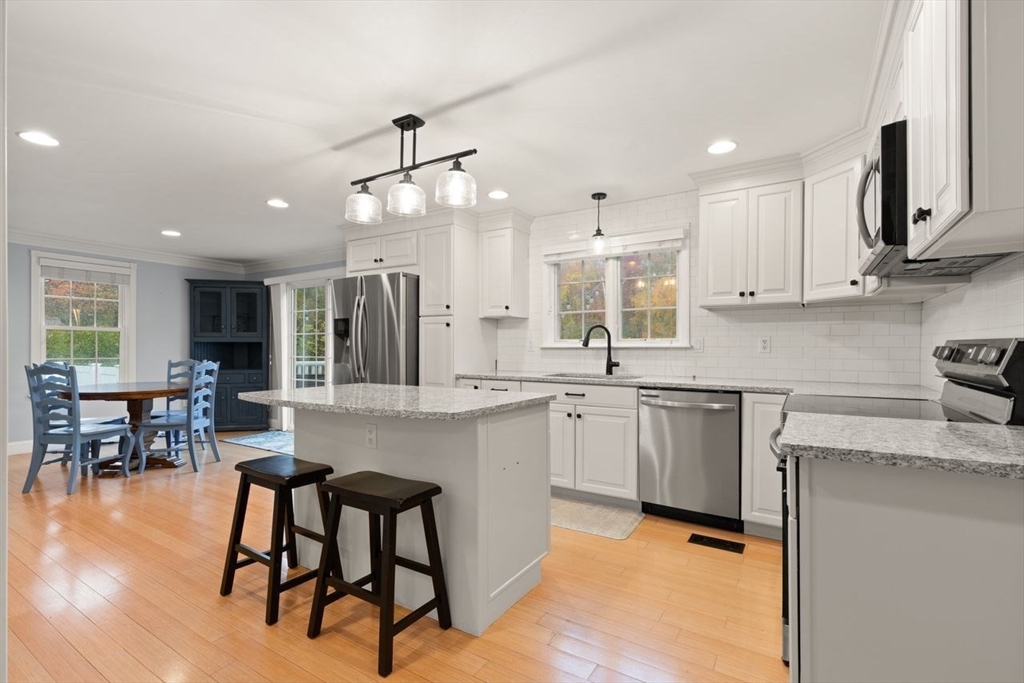 Well-maintained Garrison Colonial offering 3 bedrooms, 2.5 baths, and over 2,200 sq. ft. of finished space, not including a partially finished lower level. Originally built in 1963 and rebuilt in 2007, this home features hardwood floors throughout, crown molding, and detailed woodwork. The kitchen was updated in 2024 with white quartz countertops, new tile backsplash, stainless steel appliances, and modern lighting. A spacious bonus room over the garage offers flexible use as an office, living room, den, with potential to add an in-law suite. Recent upgrades include new garage doors (2023), stair runner (2025), and master bath fixtures (2024). The fenced backyard includes a Trex deck, stone patio, fire pit, and play set, providing a great setup for outdoor enjoyment. Energy improvements made through Mass Save in 2019. Two gas heating systems and two central A/C zones. Septic system installed in 2018. Move-in ready with thoughtful improvements throughout.