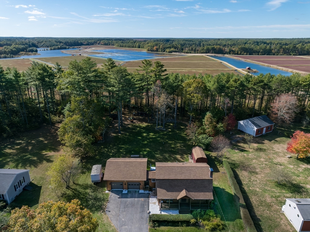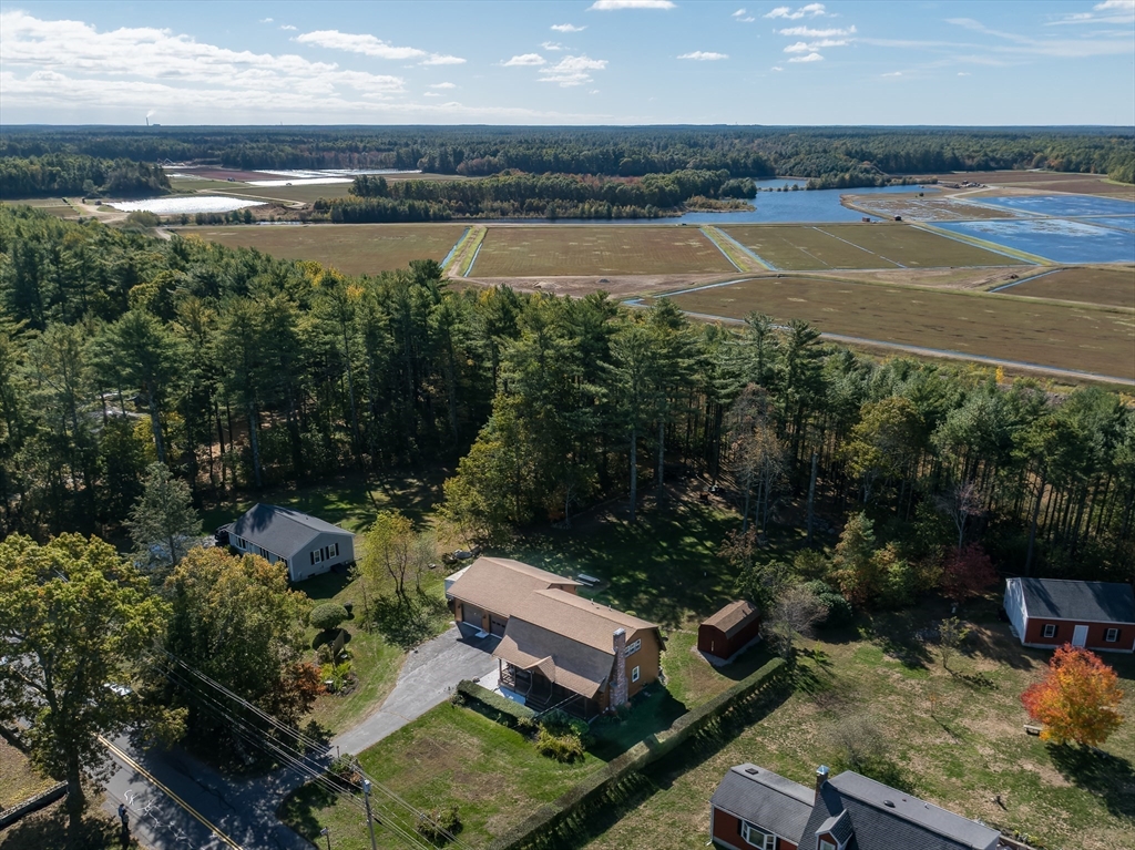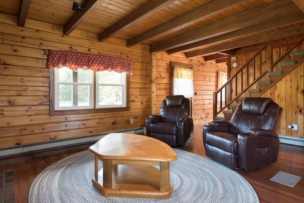 Step inside this classic “Northeastern” log home where rustic character meets timeless craftsmanship. Designed with post-and-beam construction, it welcomes you with a covered front porch perfect for morning coffee and a sun-filled back deck overlooking a private yard abutting cranberry bogs—New England living at its finest. Inside, warm wood tones and natural textures create an inviting atmosphere for comfortable everyday living. The spacious front-to-back living area centers around a wood-burning fireplace, perfect for taking the chill off crisp fall evenings. The kitchen and dining area offer excellent potential to open and modernize for today’s preferred flow (currently being used as a bdrm). Upstairs features two cathedral front-to-back bedrooms, a flex room & full bath. An oversized two-car garage adds versatility for vehicles, hobbies, plus a designed workshop space. Set on a 0.71-acre country lot, surrounded by nature yet close to town conveniences.