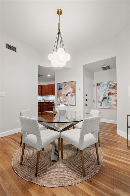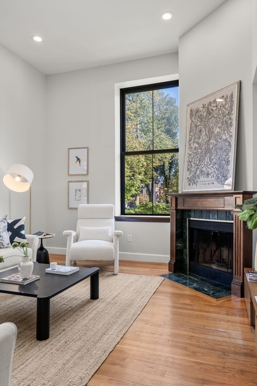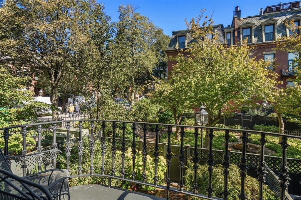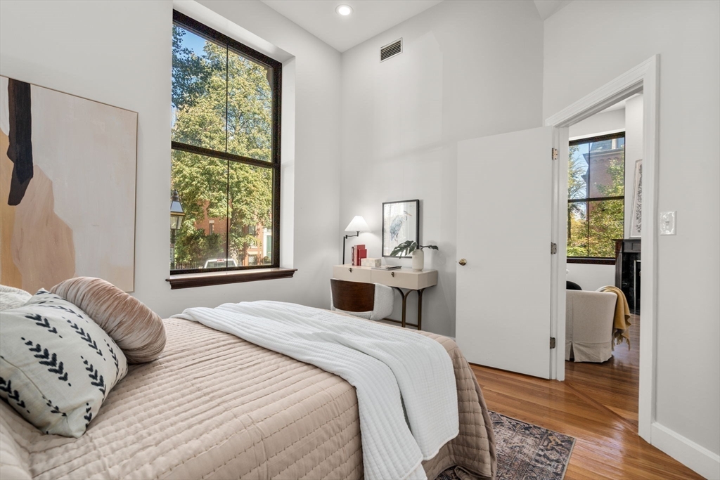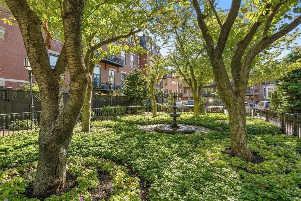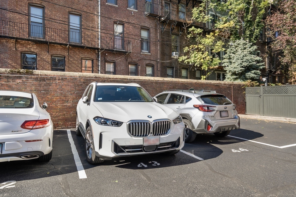 The residences at Dartmouth Square are the pinnacle of convenient living in the South End's coveted 'Golden Triangle' area. Located on the cobblestone block of Appleton St, this former school house building offers twelve foot ceilings, towering windows and dedicated parking, which is so hard to find. The fireplaced living room has corner exposure and overlooks the carefully manicured courtyard which separates these two stunning, historic buildings. Single floor living is possible thanks to a commercial grade elevator which brings residents from their homes to the garden floor for walk-out access to the full parking space in the lot. Both bedrooms in this home are separate and spacious and have exceptional closet space. From your private terrace, you can hear the association's fountain bubbling in the warmer months. Additional amenities include professional management, in unit WD and central air. Home owners are only steps to Greystone Cafe, Newbury St & the restaurants on Tremont St!