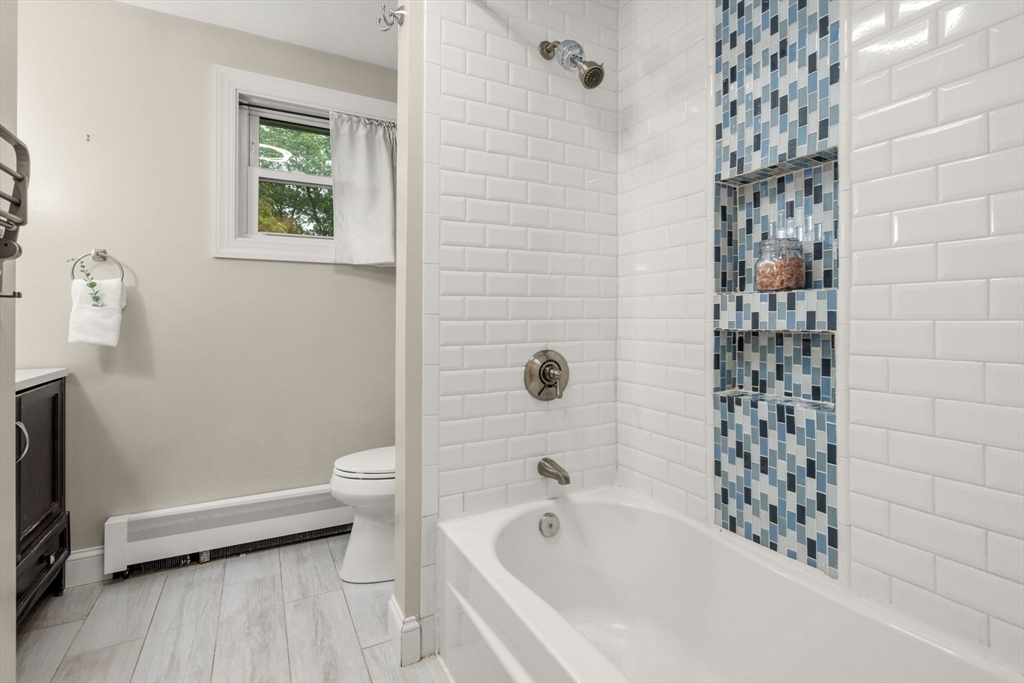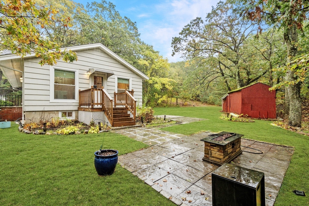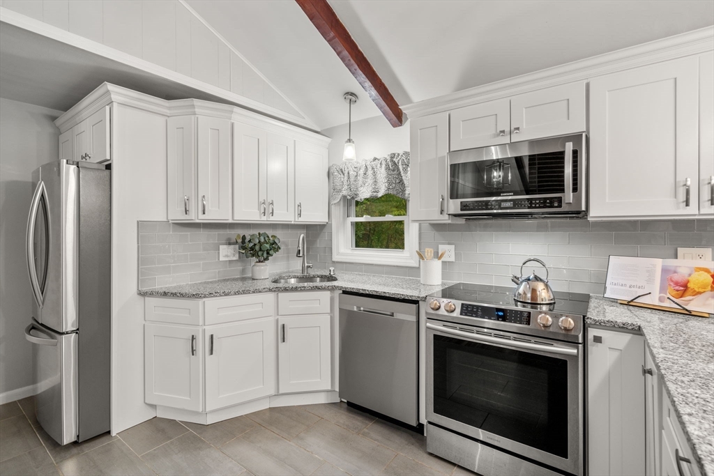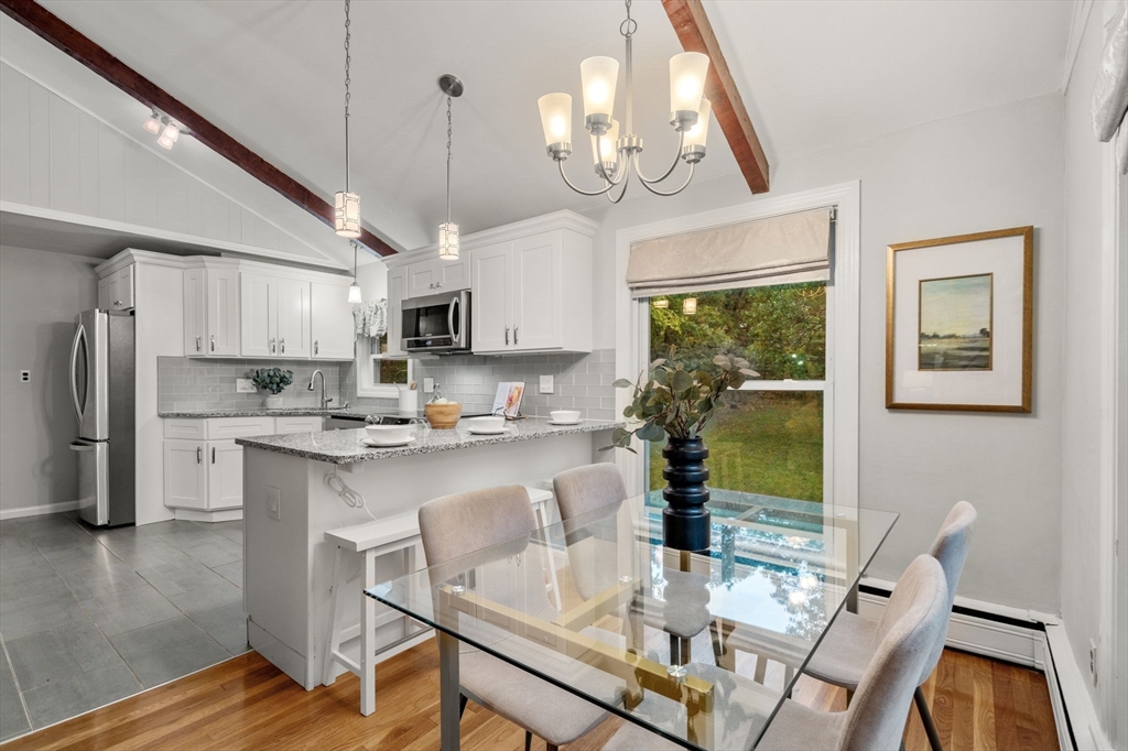 Tucked on a quiet street surrounded by mature trees, this move-in-ready single family offers a rare combination of space, style & privacy with a country feel just minutes from Boston. The 2020 kitchen shines with stainless appliances, granite counters, breakfast bar & open flow to the living & dining areas accented by 12-foot vaulted ceilings, exposed beams & architectural detail that feels like a design magazine spread. Three spacious bedrooms, newer windows & gleaming wood floors complete the main level. The finished lower level adds a fireplace, full bath, office, bedroom & easy potential for an in-law suite or creative studio. Beyond the doors awaits a private 1.29-acre retreat with lush lawn, gardens, stonework, deck & mature landscaping, perfect for summer BBQs, fall fires, or gardening. With two commuter rail stations nearby & quick access to Route 1, this home delivers sophistication, serenity & style, offering a peaceful escape with every modern convenience.