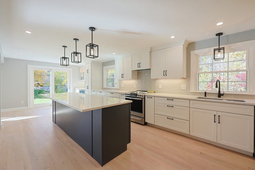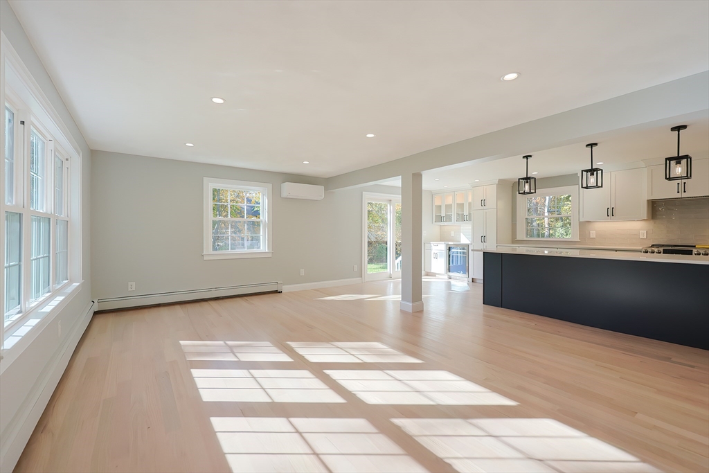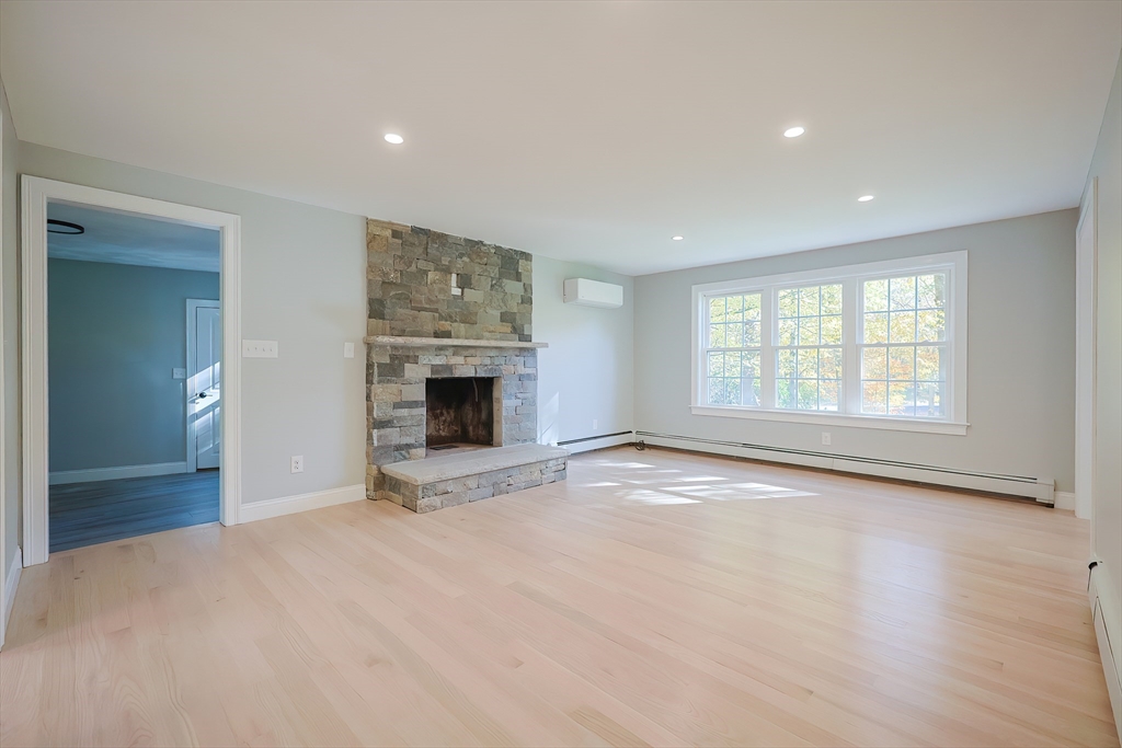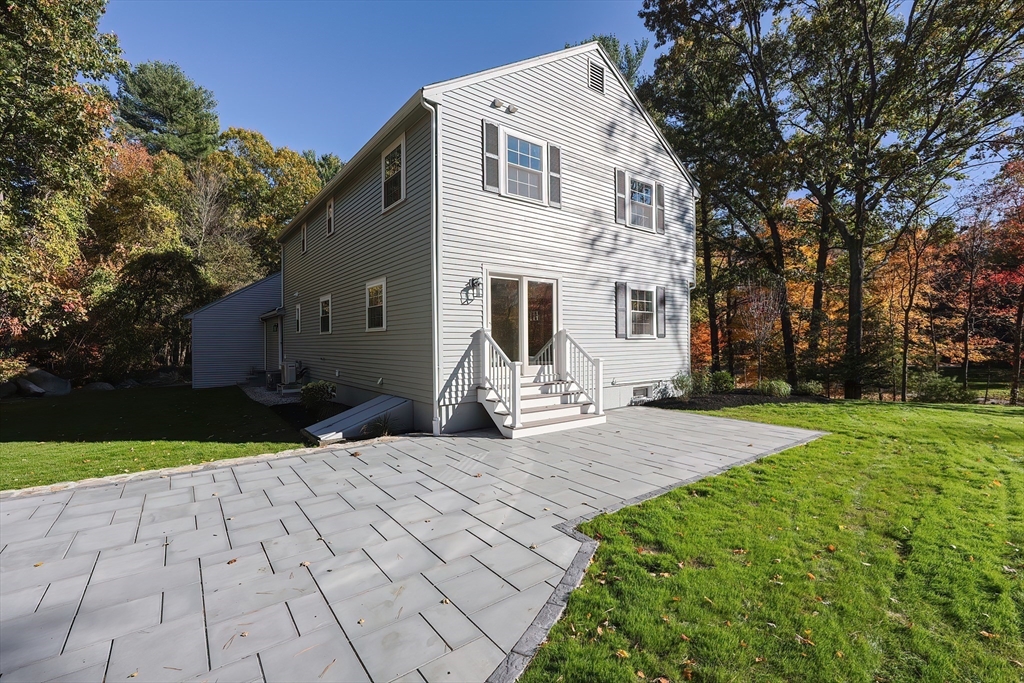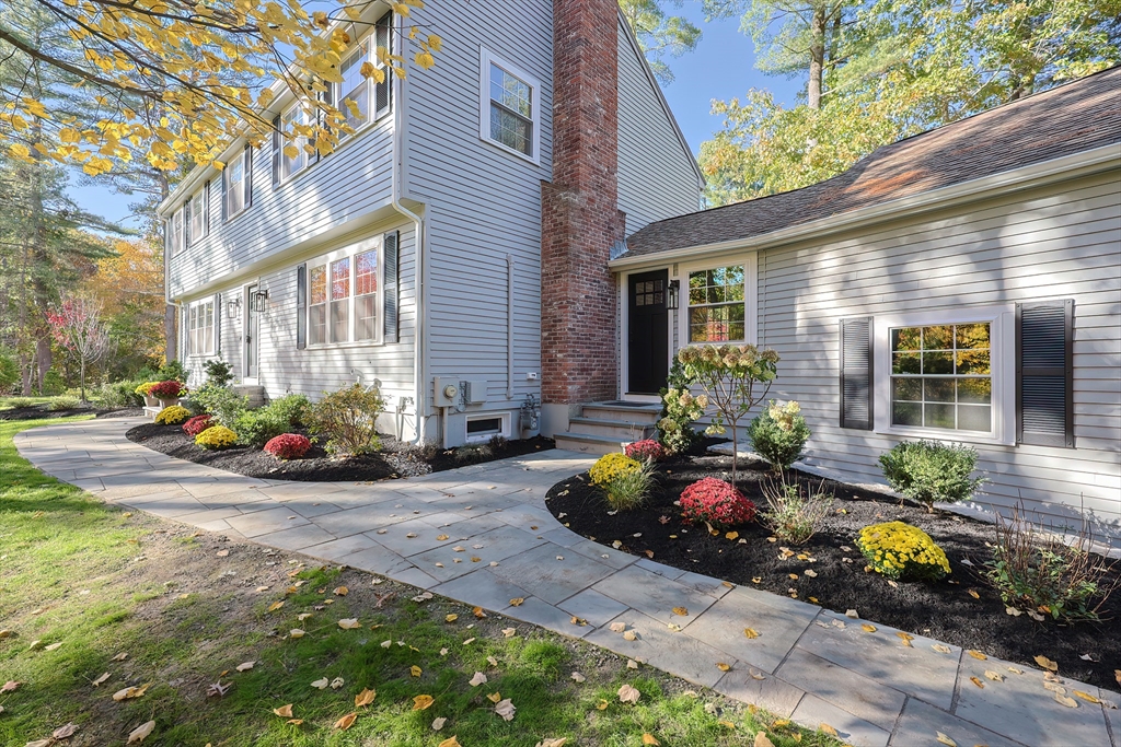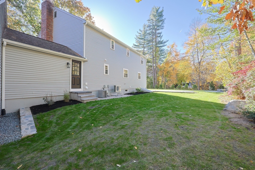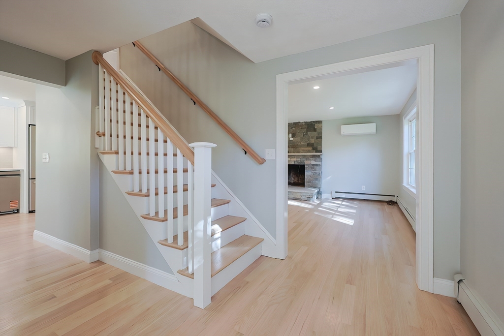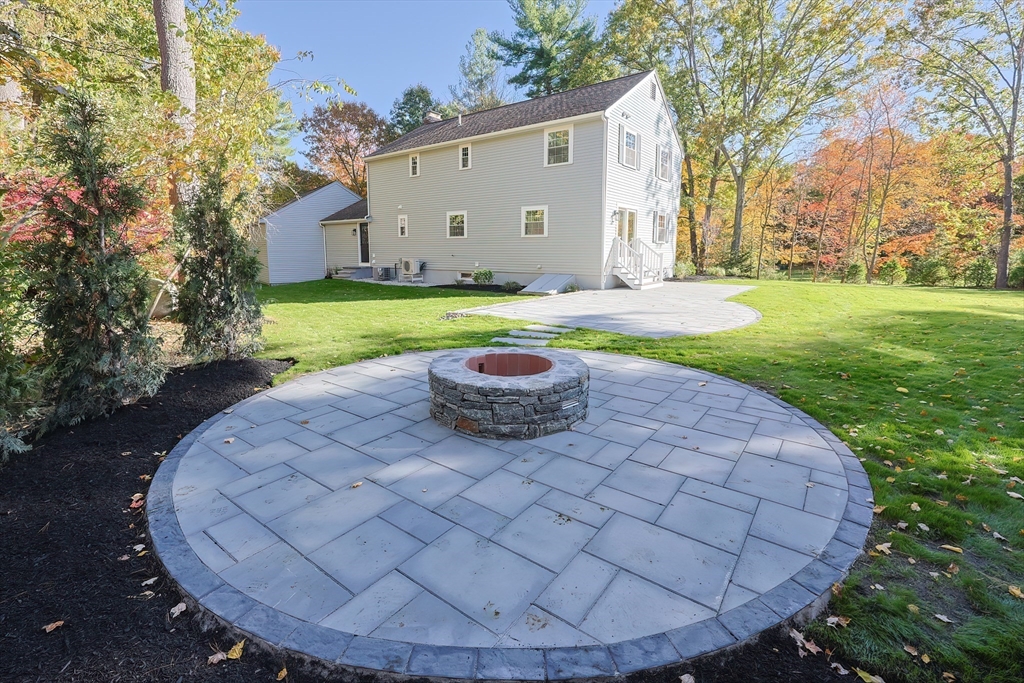Beautifully renovated colonial offers the perfect blend of comfort, style, and convenience near walking trails, the highway, and shopping. Sunny and bright open floor plan blends the dining room and kitchen, creating an ideal space for entertaining and everyday living. The stunning kitchen features an oversized island, updated cabinetry, and sliders leading to a stone patio with a fire pit for relaxing evenings outdoors. Gorgeous floor to ceiling stone fireplace in the living room, half bath with laundry and a finished, heated room connects the garage to the main house, ideal for office/den/playroom and has access to the front and back yards. The second floor features hardwood flooring, spacious bedrooms with ample closet space, recessed lighting and tastefully renovated bathrooms. The nicely finished lower level has laminate flooring, a full bathroom for multi-purpose uses. Furnace ~ 2 years, 200 Amp Electric, New Windows, Doors and Mini-splits