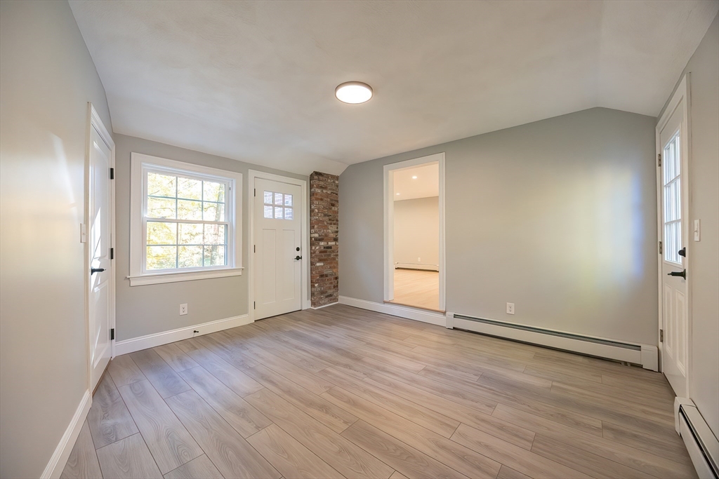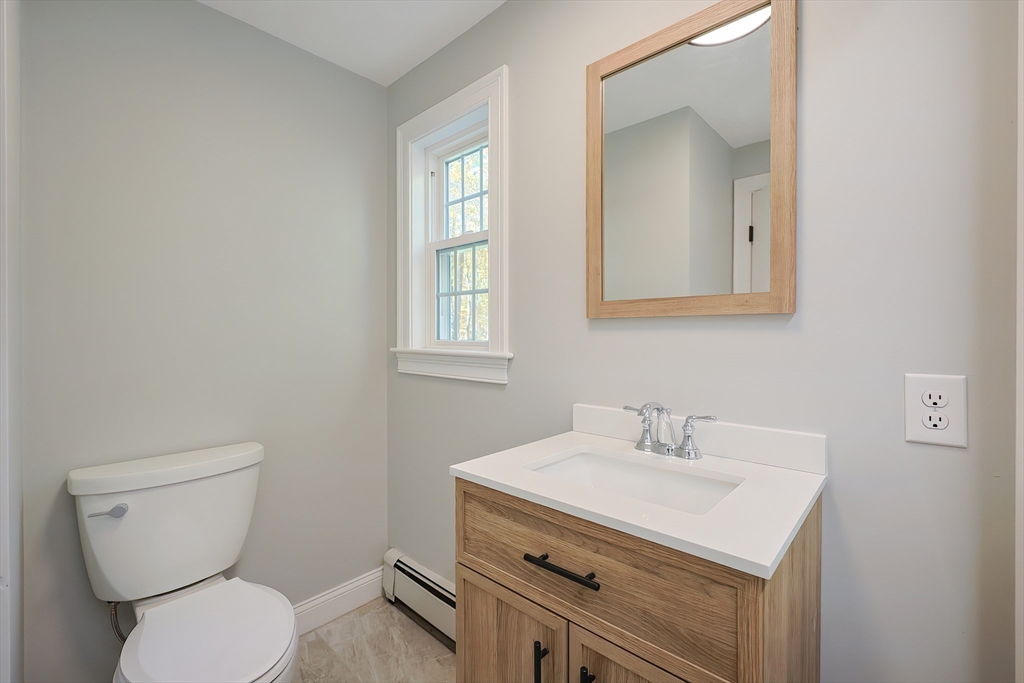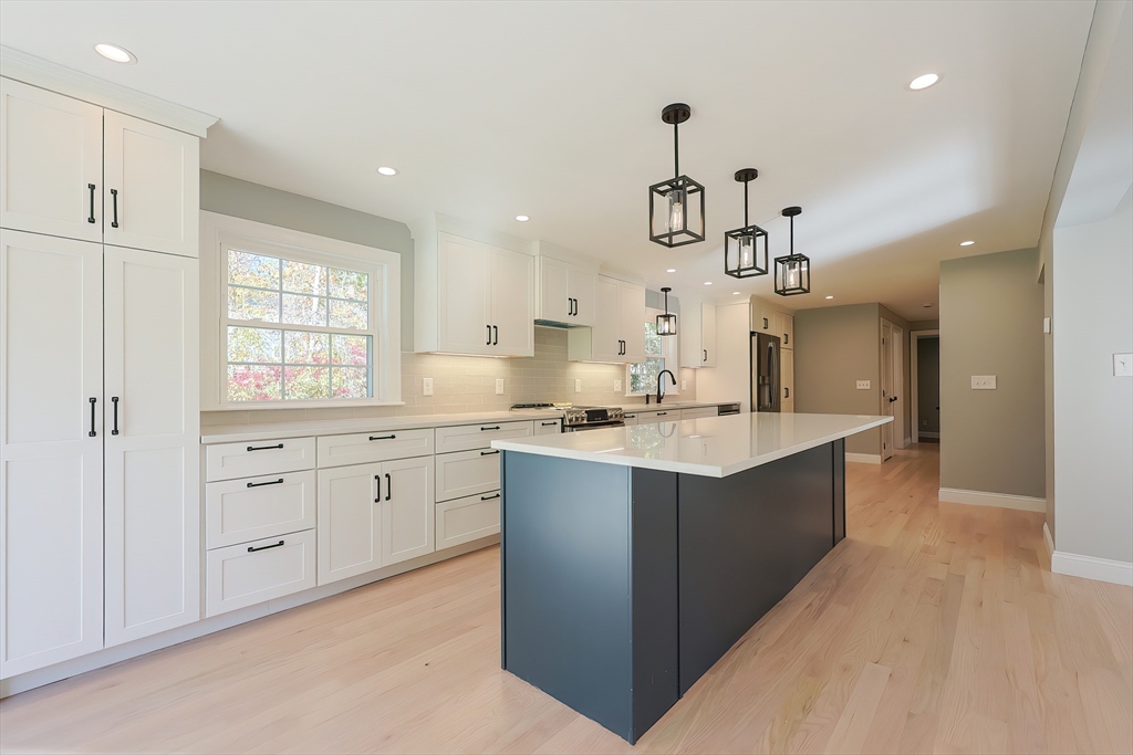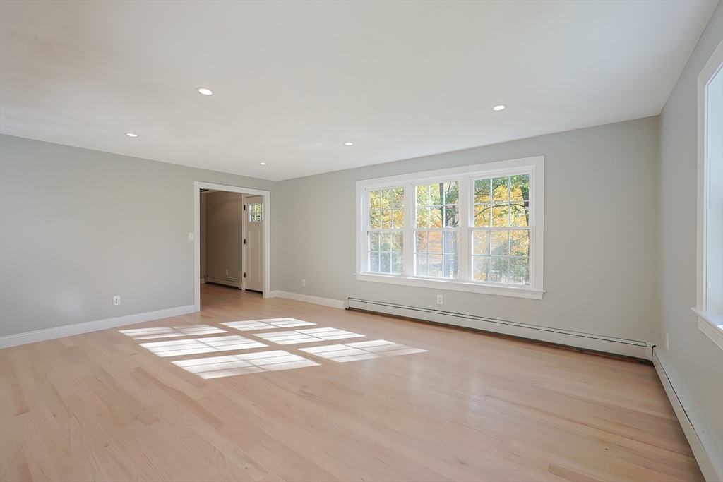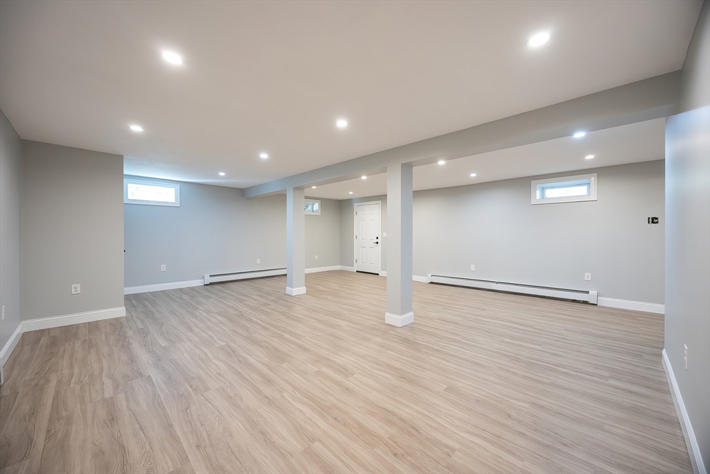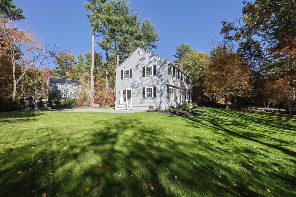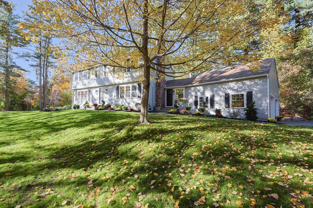 Beautifully renovated colonial offers the perfect blend of comfort, style, and convenience near walking trails, the highway, and shopping. Sunny and bright open floor plan blends the dining room and kitchen, creating an ideal space for entertaining and everyday living. The stunning kitchen features an oversized island, updated cabinetry, and sliders leading to a stone patio with a fire pit for relaxing evenings outdoors. Gorgeous floor to ceiling stone fireplace in the living room, half bath with laundry and a finished, heated room connects the garage to the main house, ideal for office/den/playroom and has access to the front and back yards. The second floor features hardwood flooring, spacious bedrooms with ample closet space, recessed lighting and tastefully renovated bathrooms. The nicely finished lower level has laminate flooring, a full bathroom for multi-purpose uses. Furnace ~ 2 years, 200 Amp Electric, New Windows, Doors and Mini-splits