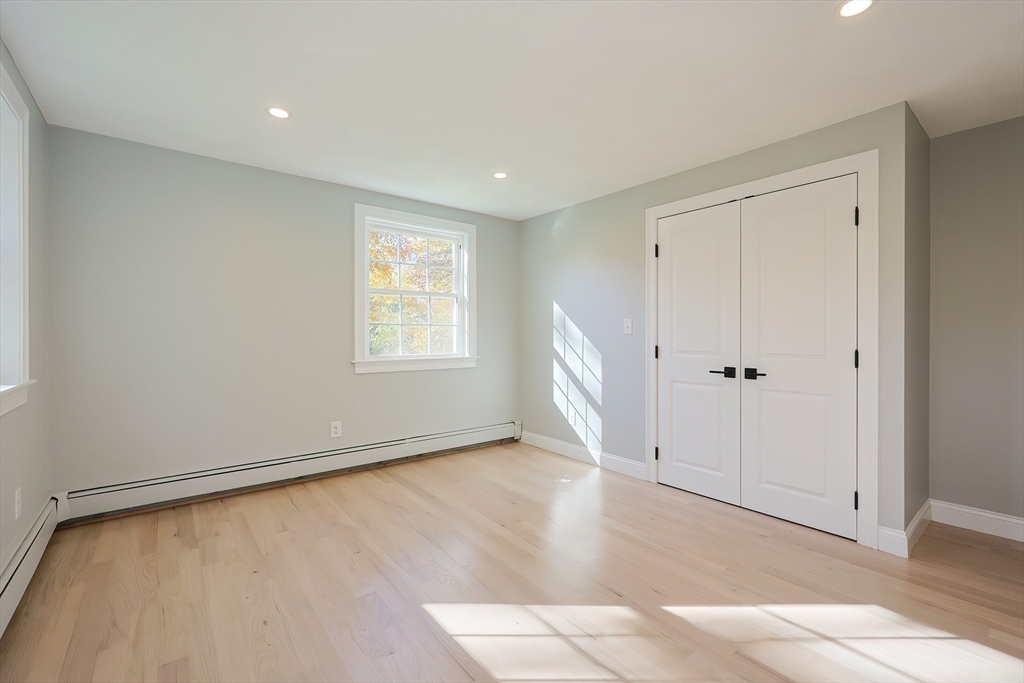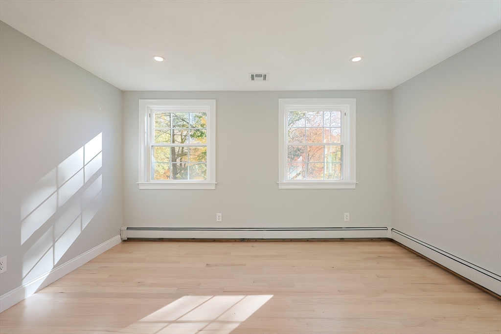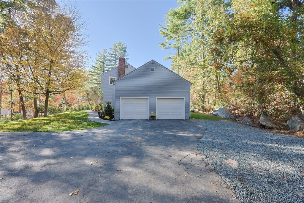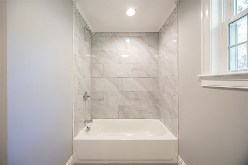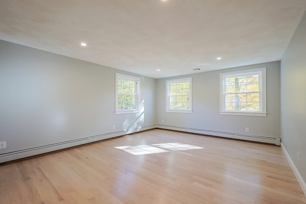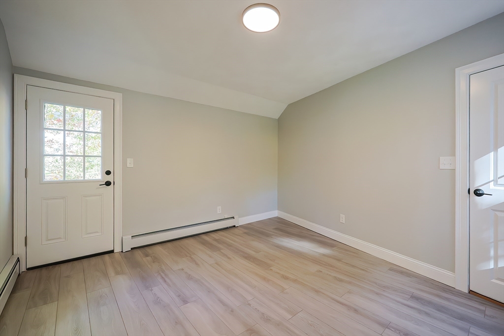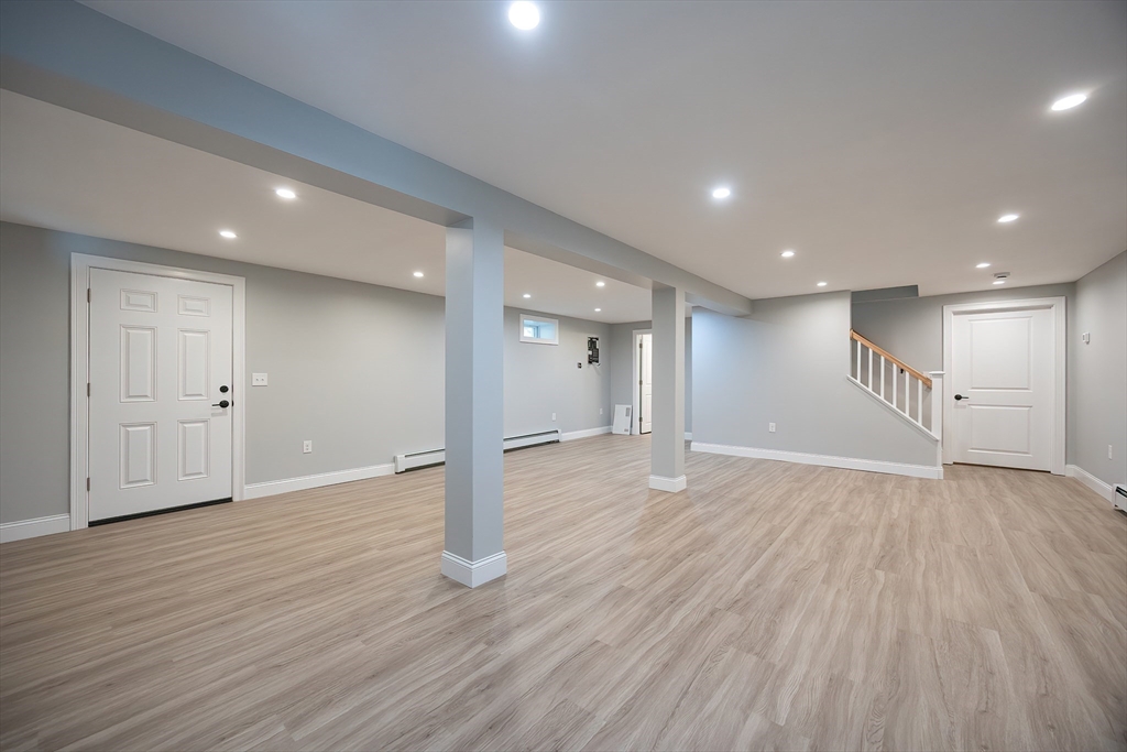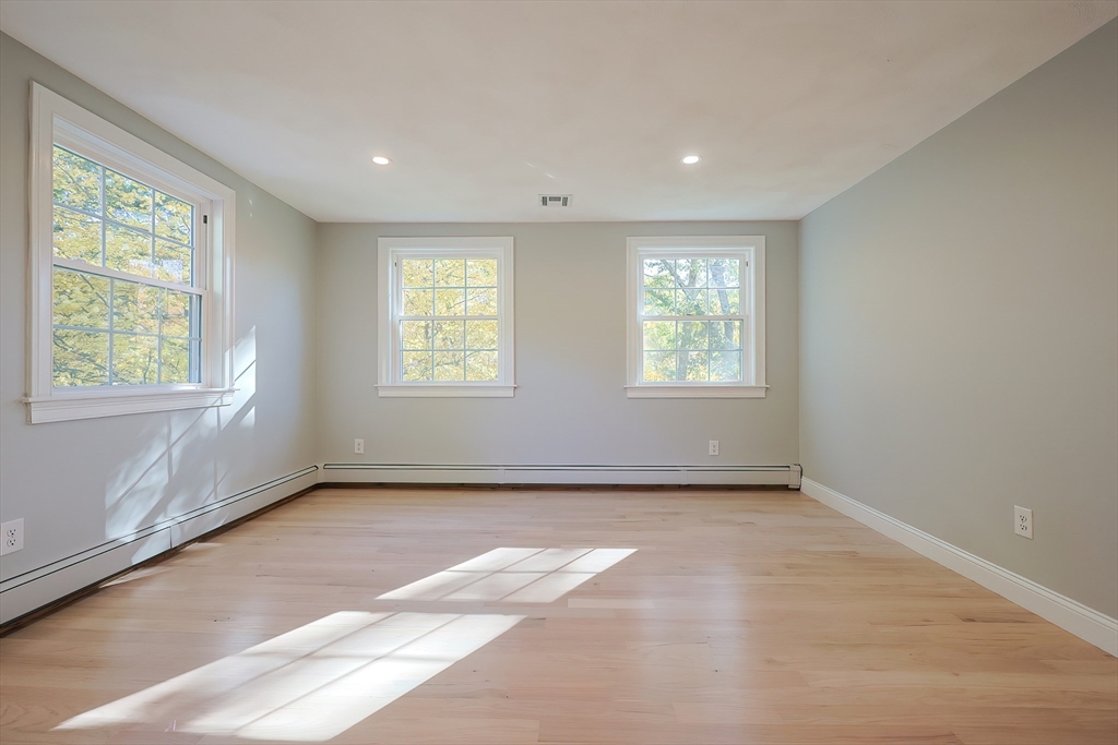 Beautifully renovated colonial offers the perfect blend of comfort, style, and convenience near walking trails, the highway, and shopping. Sunny and bright open floor plan blends the dining room and kitchen, creating an ideal space for entertaining and everyday living. The stunning kitchen features an oversized island, updated cabinetry, and sliders leading to a stone patio with a fire pit for relaxing evenings outdoors. Gorgeous floor to ceiling stone fireplace in the living room, half bath with laundry and a finished, heated room connects the garage to the main house, ideal for office/den/playroom and has access to the front and back yards. The second floor features hardwood flooring, spacious bedrooms with ample closet space, recessed lighting and tastefully renovated bathrooms. The nicely finished lower level has laminate flooring, a full bathroom for multi-purpose uses. Furnace ~ 2 years, 200 Amp Electric, New Windows, Doors and Mini-splits