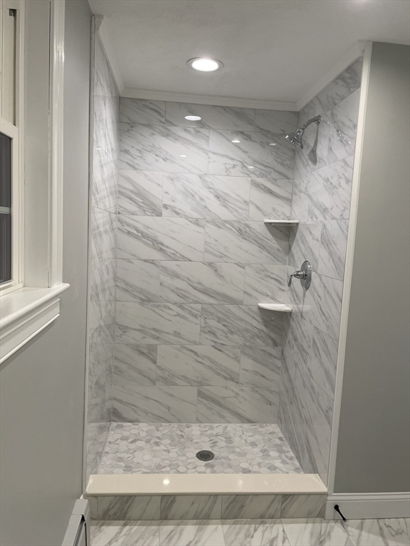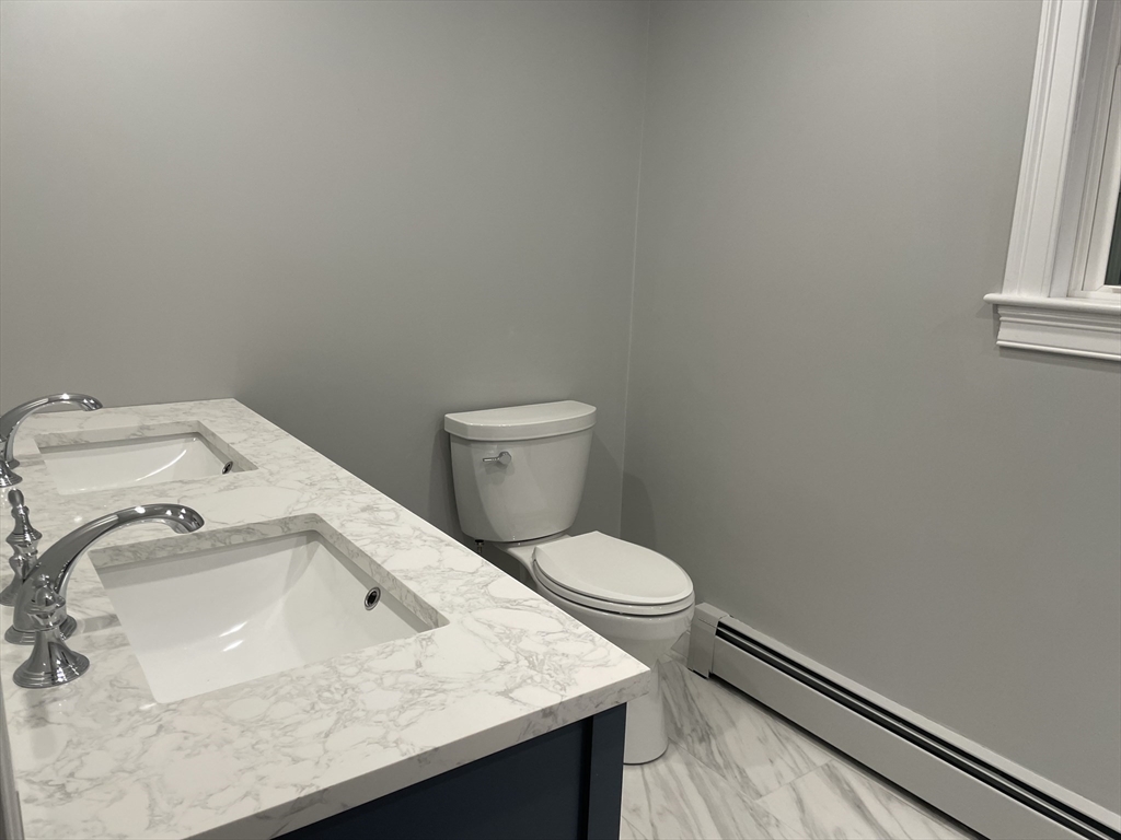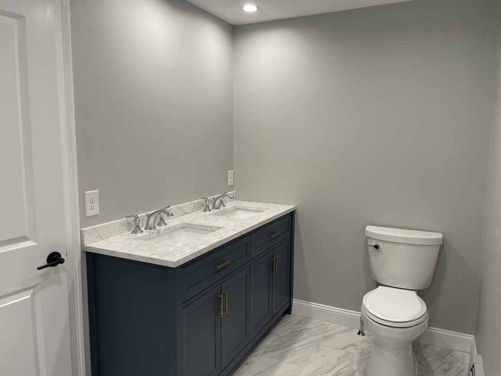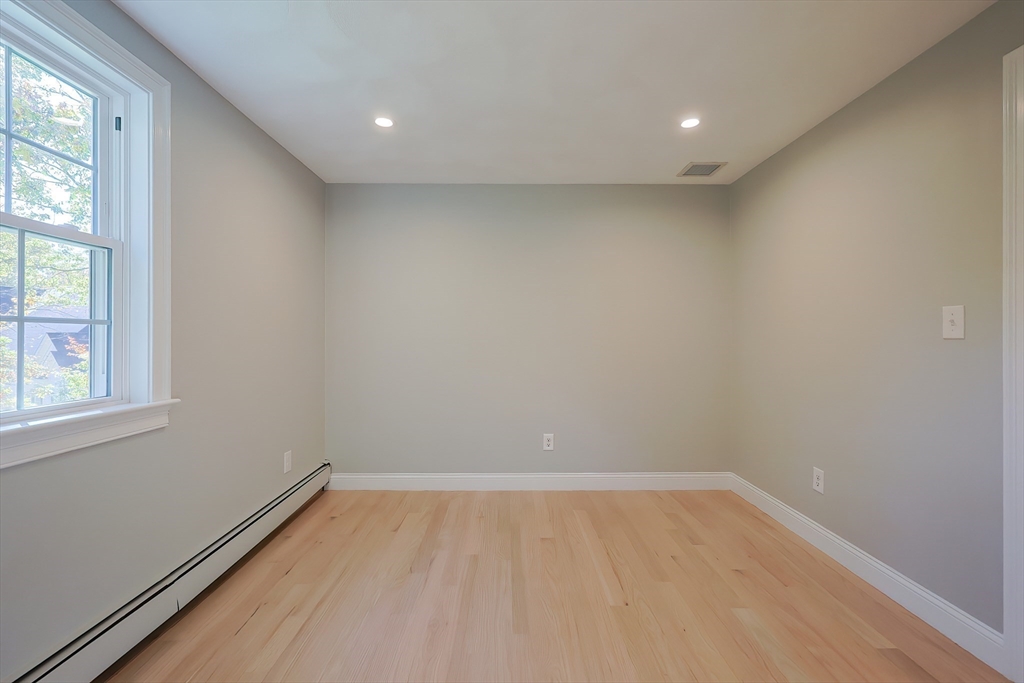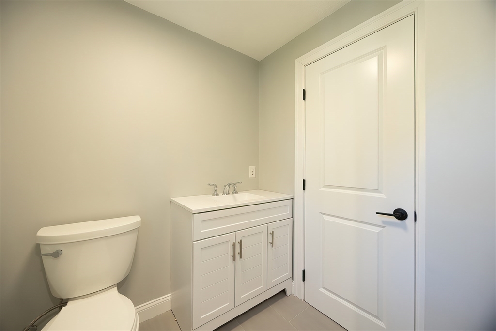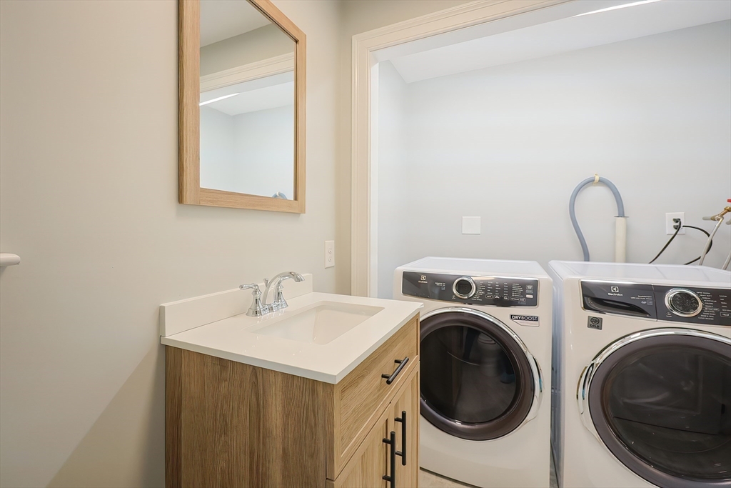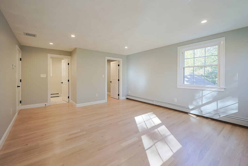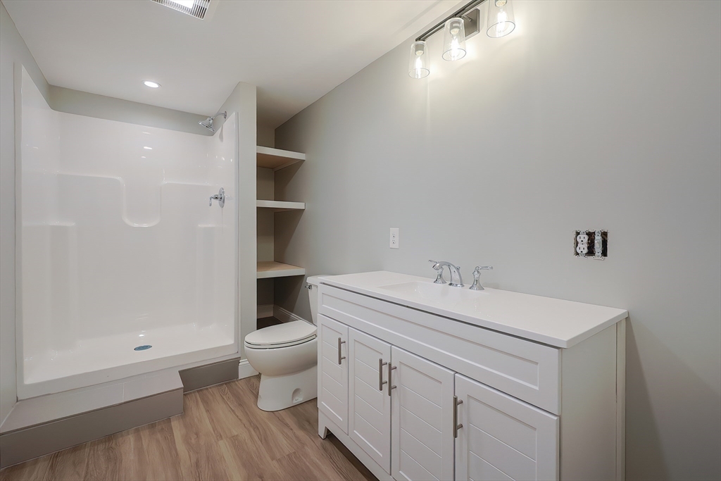 Beautifully renovated colonial offers the perfect blend of comfort, style, and convenience near walking trails, the highway, and shopping. Sunny and bright open floor plan blends the dining room and kitchen, creating an ideal space for entertaining and everyday living. The stunning kitchen features an oversized island, updated cabinetry, and sliders leading to a stone patio with a fire pit for relaxing evenings outdoors. Gorgeous floor to ceiling stone fireplace in the living room, half bath with laundry and a finished, heated room connects the garage to the main house, ideal for office/den/playroom and has access to the front and back yards. The second floor features hardwood flooring, spacious bedrooms with ample closet space, recessed lighting and tastefully renovated bathrooms. The nicely finished lower level has laminate flooring, a full bathroom for multi-purpose uses. Furnace ~ 2 years, 200 Amp Electric, New Windows, Doors and Mini-splits