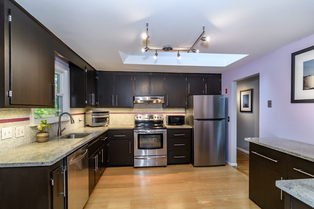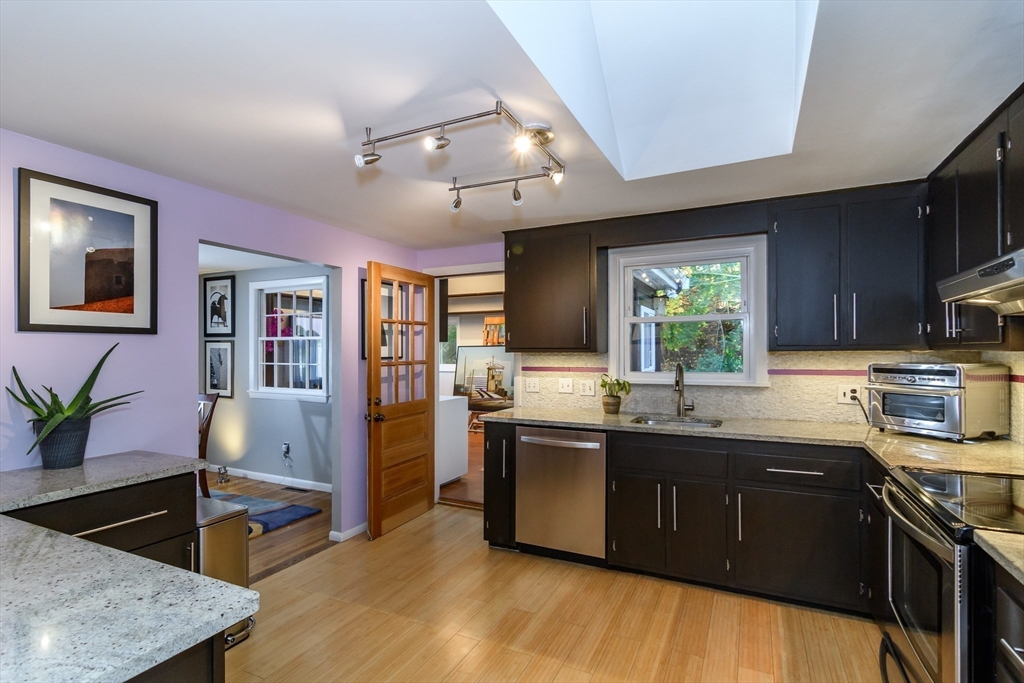 Looking for a turn key home mere minutes from both Natick & Wellesley Centers at an unbeatable price? Look no further than 191 East Central Street! This beautiful, modern 3 bed/2 bath raised ranch home has been fully updated & meticulously maintained so its new owners can move right in! Enter through a spacious foyer into the remodeled first level w/family room w/wood-burning fireplace, built-ins & large picture window, the perfect cozy retreat. There is also an office, full bath, laundry/exercise room & storage area. Make your way up the turned staircase w/sun shining through the multiple skylights to a living room, dining room & modern, updated kitchen w/bamboo flooring. Three bedrooms & 2nd full bath complete this main level, along with a 4-season room off of the kitchen, perfect as a studio space, playroom etc. Step outside to a hidden gem of a backyard complete with a large stone patio and mature trees. Central air, 1-car garage, newer systems & just 1 mile to Wellesley College!