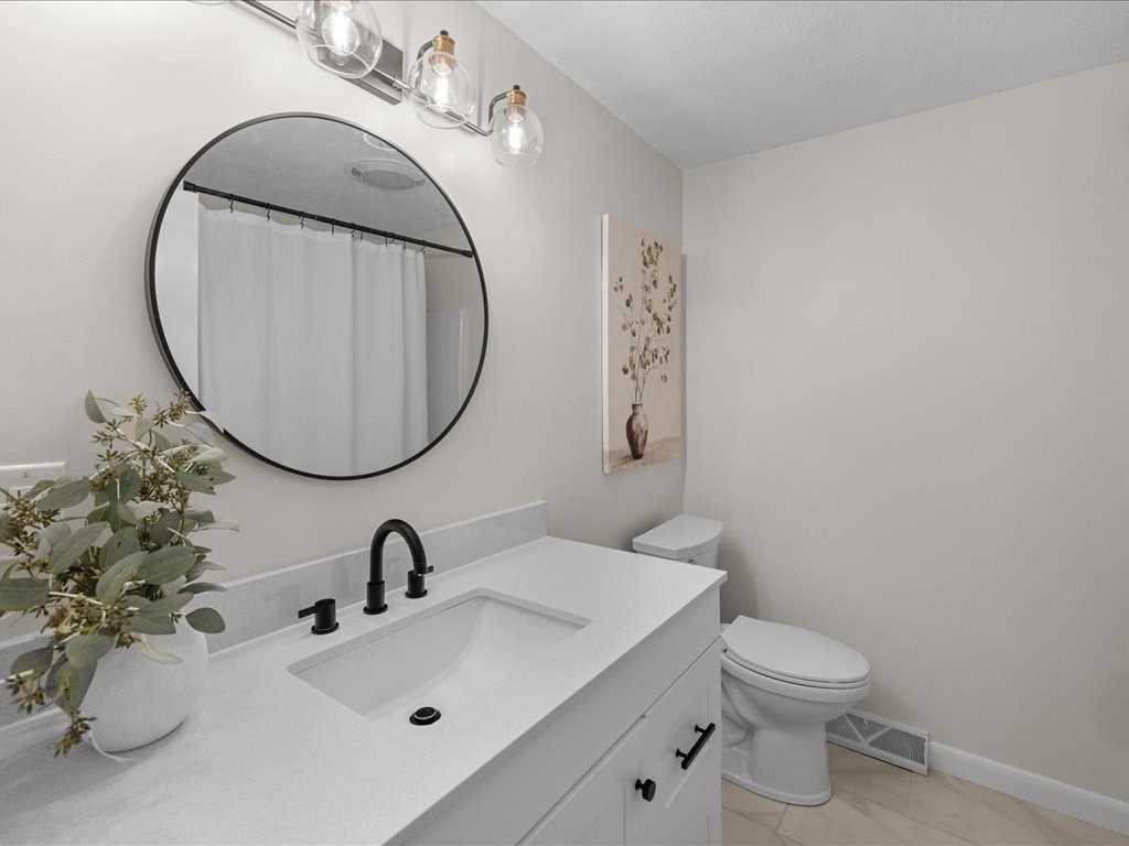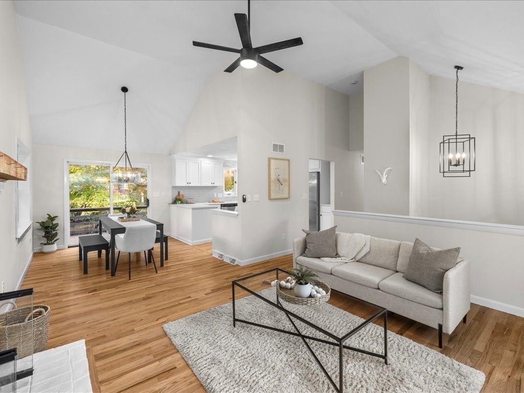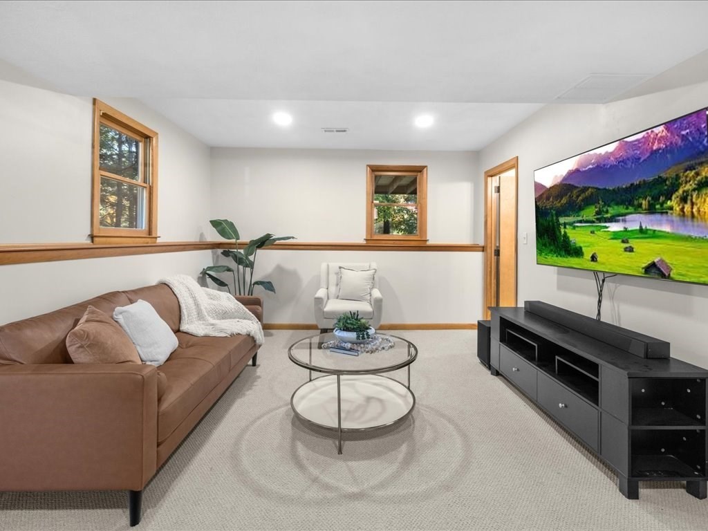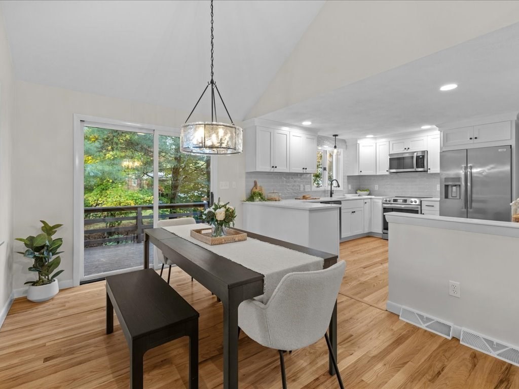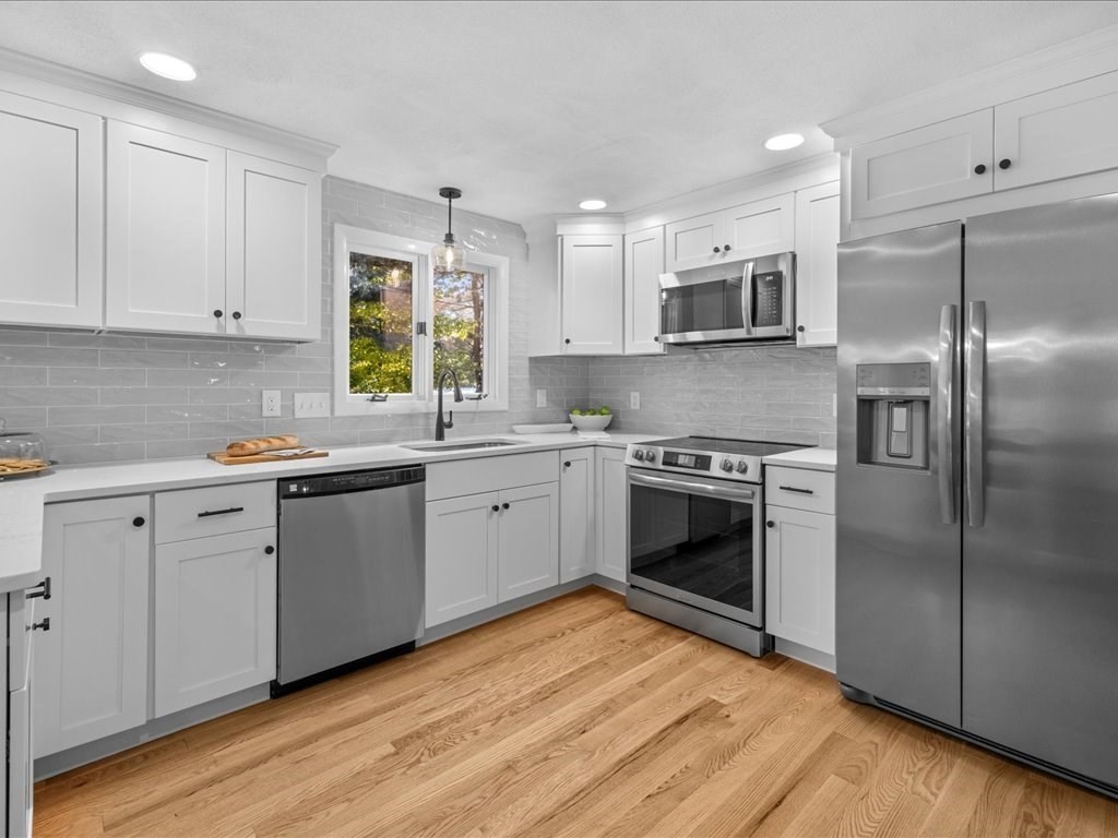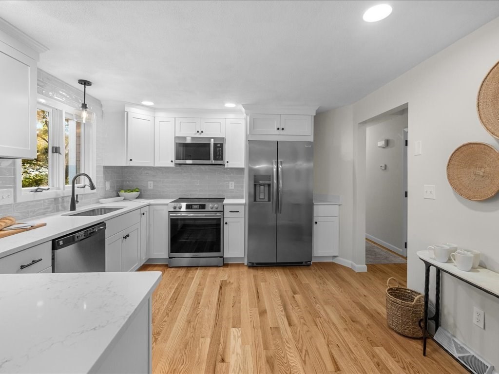 Don't miss this fully renovated, move-in ready 3/4 bedroom, 3 full bath home in a prime Framingham location—just minutes from shopping, dining, Framingham State University, and highway access. This move-in ready home features a new kitchen with white cabinets, quartz countertops, new flooring, and stainless steel appliances. Freshly painted throughout with refinished hardwoods, new carpet, updated bath tile, and modern lighting. The vaulted living room with bay windows and a wood-burning fireplace opens to a spacious dining area and new deck overlooking a private, hydro-seeded backyard. The lower level includes a large living room with full bath, its own hearth that is wood burning stove ready —perfect as a fourth bedroom, guest suite, or playroom. An attached garage connects to a mudroom. Fresh, clean laundry room. Exterior has been resided with durable, pest-resistant Hardie Board siding. Thoughtfully updated for comfort, style, & easy living in an unbeatable, convenient location.
