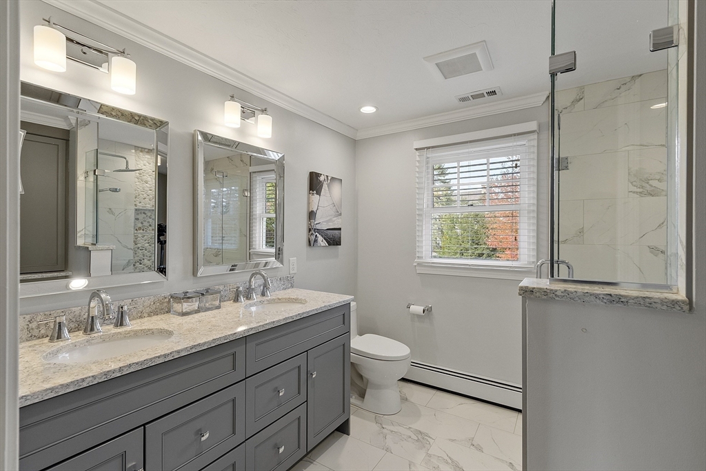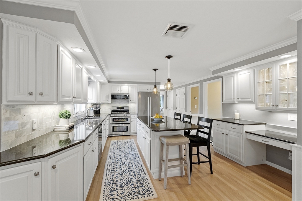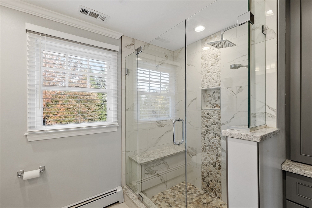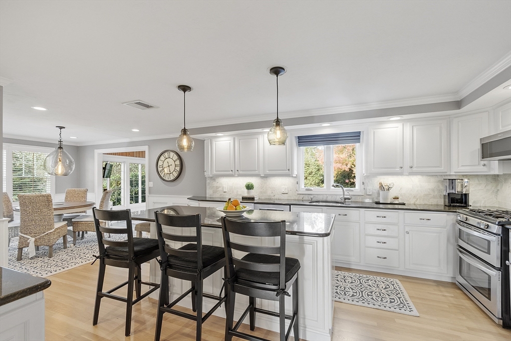 Rare offering in PRESTIGIOUS neighborhood w/ sidewalk & no thru traffic! PRIDE OF OWNERSHIP includes remodeled kitchen w/ granite counters, tiled backsplash & under-cabinet lighting, gas cooking, external ventilation & 2 pantries. OPEN FLOOR PLAN into heated sunroom w/ door to expanded AZEK deck creates entertaining flow. More gathering space in front-to-back family room w/ gas FP. Main suite presents spacious bedroom, spa-like bath featuring granite double vanity, HEATED TILE FLOOR & custom cabinetry + expanded walk-in closet & 2nd closet. Additional bedrooms share updated bath w/ deep soaking tub, granite double vanity & shiplap walls. Finished lower level hosts mudroom & flex space for gym/office/toys. Outdoor living delights in large backyard w/ fire pit area & space for pool (front yard septic). Updates: windows, roof, boiler, water heater, heat pump, deck, flooring, paint, lighting, fencing & more at this TURNKEY home ~ what a gem! *OFFERS DUE 11/3 @ 12*