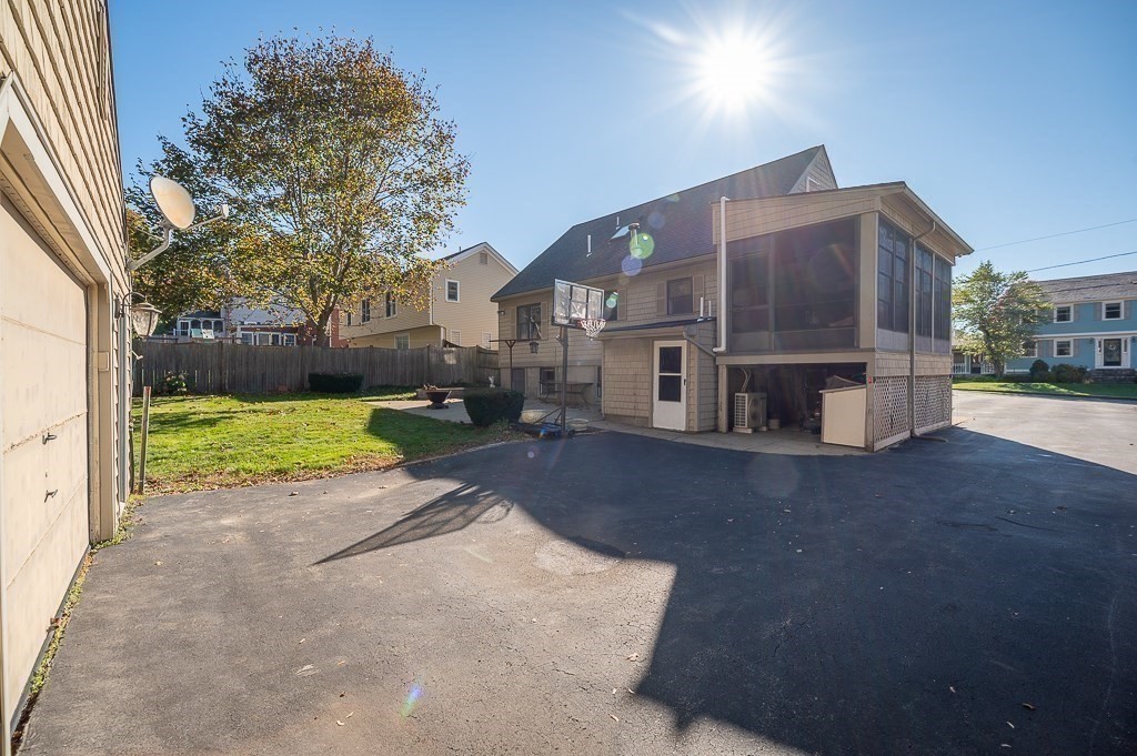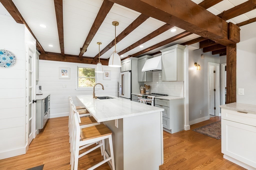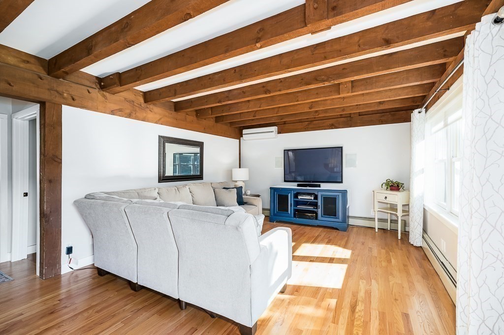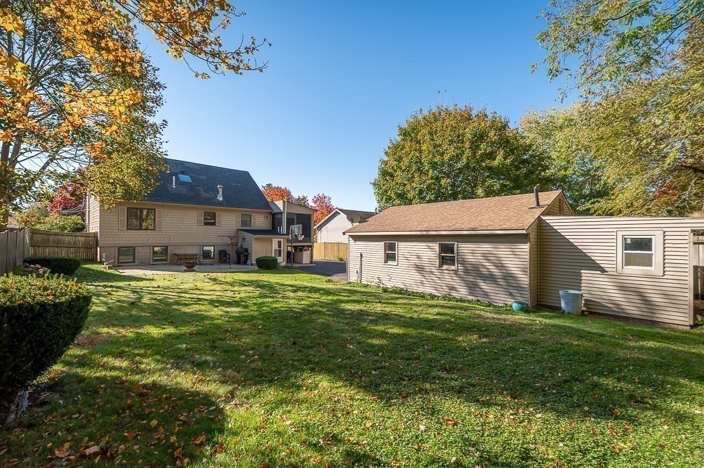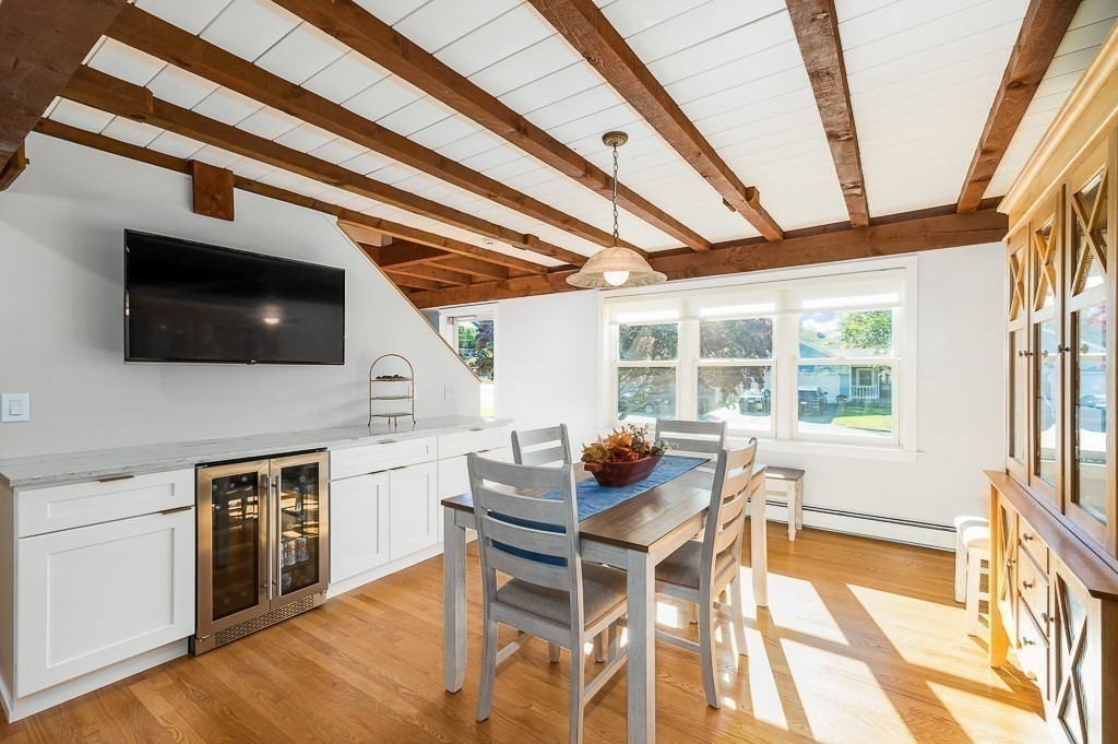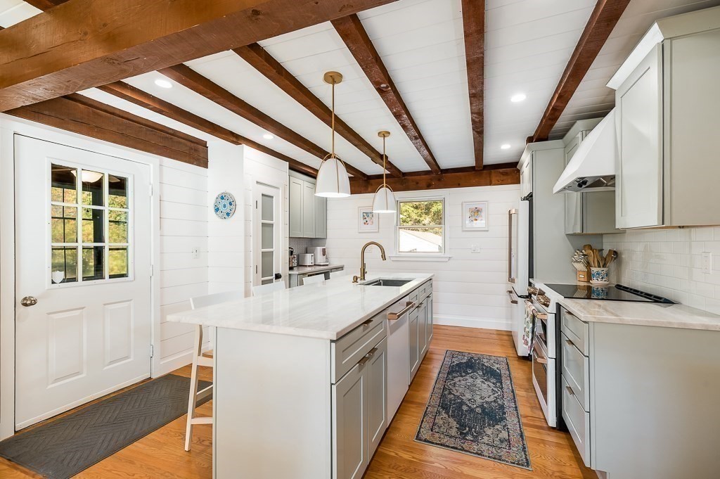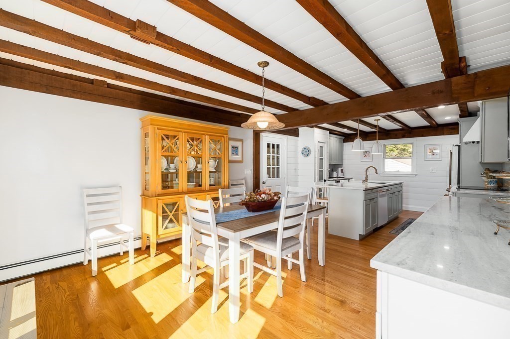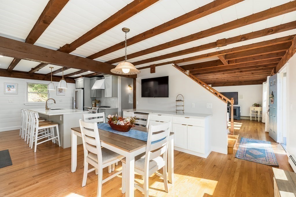 Nestled in a highly sought-after neighborhood, this charming post-and-beam home, built by Maine Post & Beam in 1980, combines timeless design with modern updates. The home features a beautifully remodeled kitchen/dining complete with a center island and contemporary finishes including quartzite counters and high-end appliances.. The open floor plan, hardwood floors and exposed beams create a warm and inviting atmosphere, perfect for both relaxation and entertaining! The main floor offers a spacious bedroom, a renovated full bath, & a welcoming living room. Upstairs, you'll find two generous bedrooms with soaring cathedral ceilings and a renovated full bath! The lower level offers a unique in law space including a kitchen, full bath, bedroom & spacious living room or family room! Bonuses: Detached large garage and shed, 3 season sunroom/enclosed porch, loads of off street parking, amazing front and back yard, and just steps to the gorgeous and scenic reservoir. Classic & Timeless!