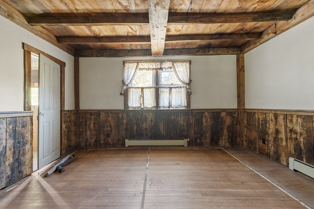 Full of character and ready for new life, this antique farmhouse offers endless potential on a beautiful country lot. The large eat-in kitchen serves as the heart of the home, while the cozy living room with a wood stove adds warmth for the winter months. A dining room with exposed beams provides rustic appeal and easy access to the outdoors, complemented by a bright sun room connecting to both the kitchen and yard. With three bedrooms, a laundry room, and a sauna with a shower, there’s space and comfort throughout. The oversized attached garage offers plenty of room for storage, projects, or a workshop. Outside, enjoy the field-like backyard with mature blueberry bushes. Bring your ideas and make this timeless farmhouse shine again!