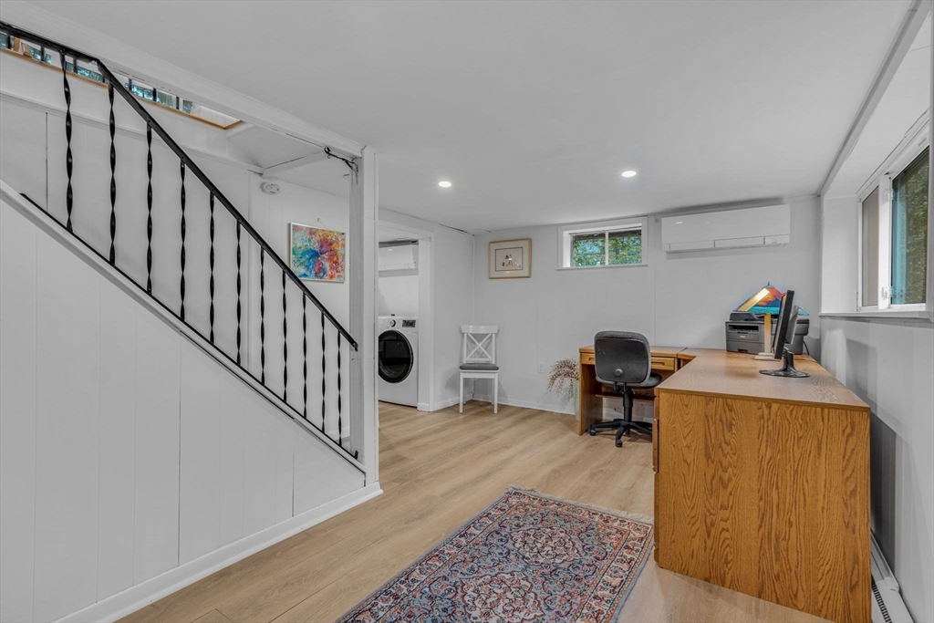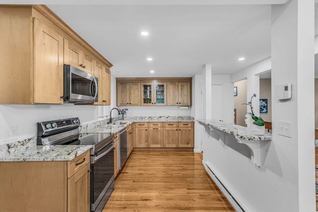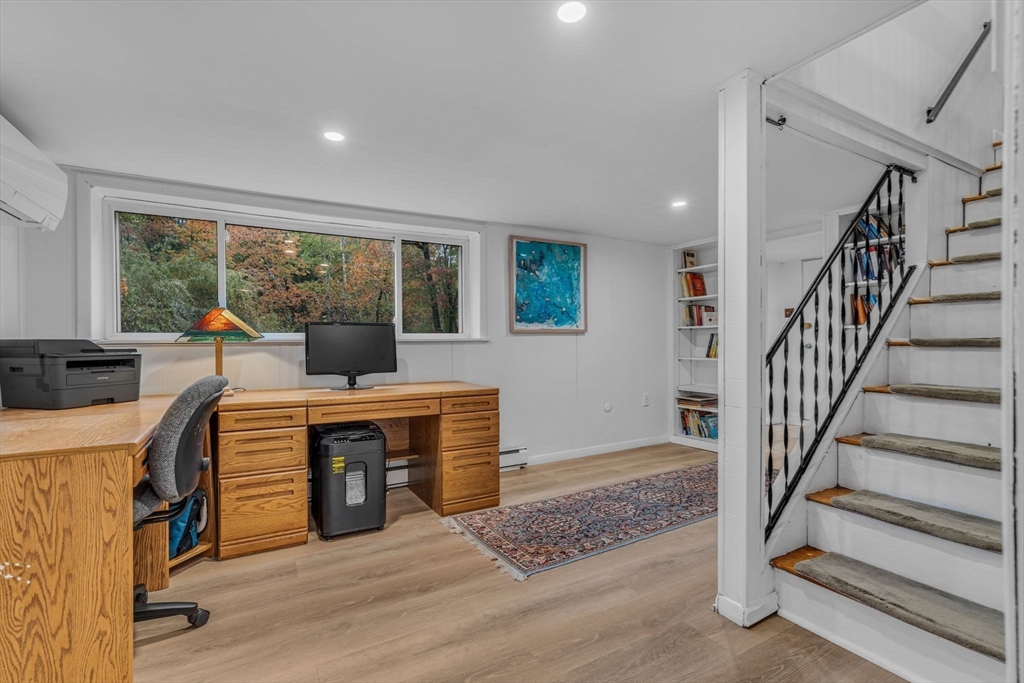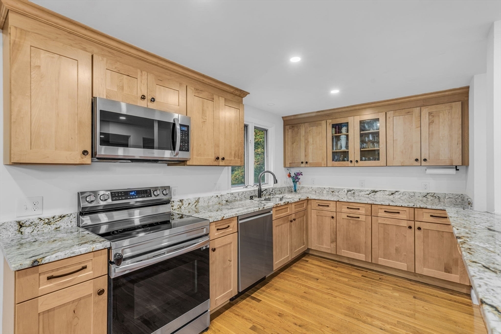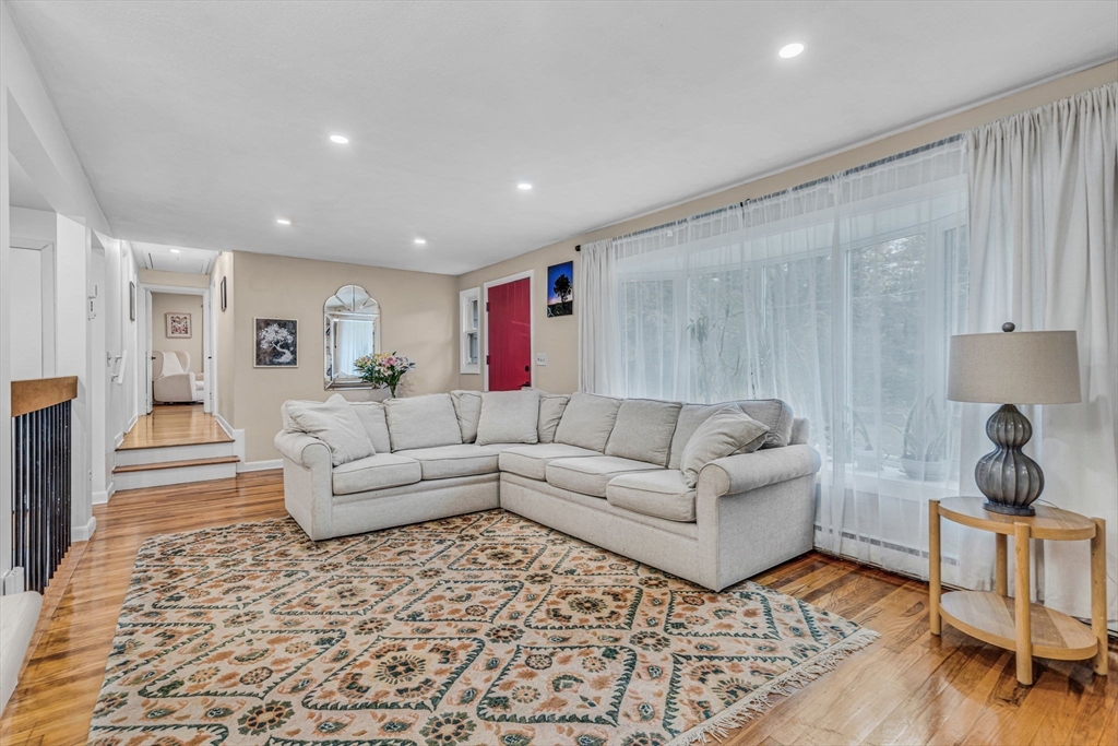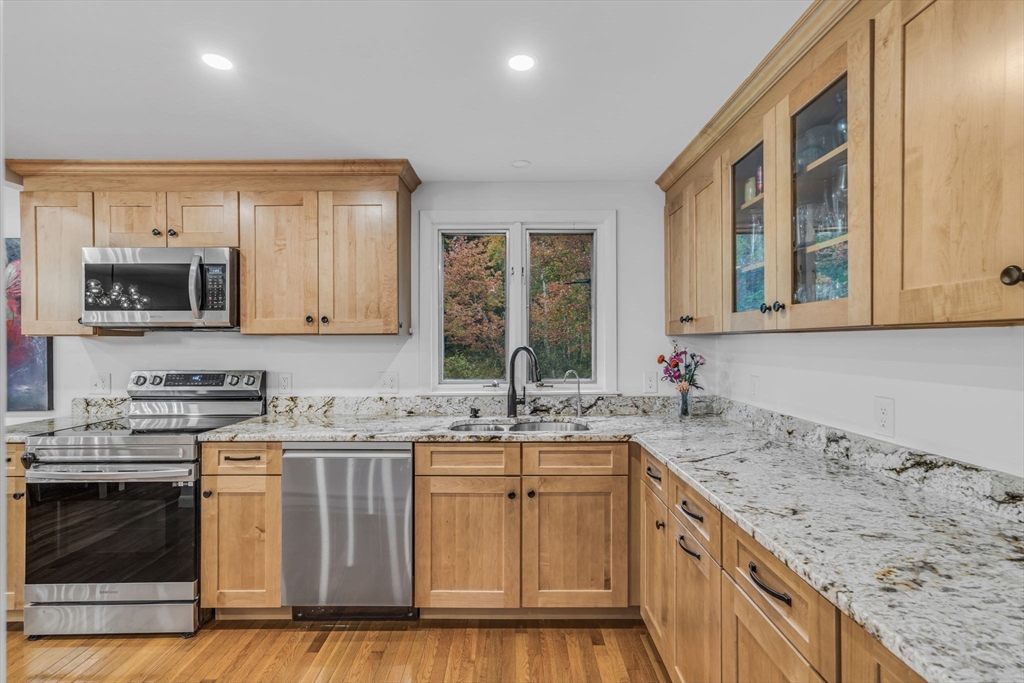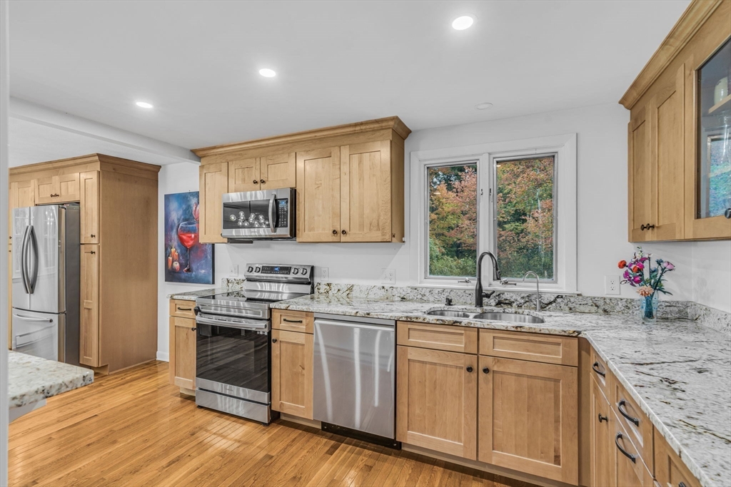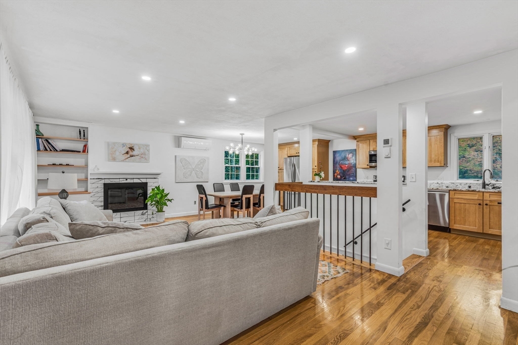 This beautifully renovated raised ranch is sure to delight! Nestled in a well-established, sought-after neighborhood, this three bedroom home offers convenience, comfort and charm. The upper level offers a flexible, open-plan living area, complete with a dining room, a newly renovated kitchen, and a living room with a beautiful fireplace. It’s ideal for hosting, relaxing and everyday living! Head up a few steps to find the main bath and three good sized bedrooms. The primary bedroom includes a full en suite bath. On the newly refinished lower level, there is even more living space! Currently configured as a home office and family room, the possibilities for this space are endless. There is an updated mudroom that provides walk-out access to the lovely backyard and two car garage. With neighborhood access to the Mass Central Rail Trail, you’ll have miles of scenic routes right at your doorstep. Ideally located for commuters with easy access to major routes and top-rated Wayland schools.