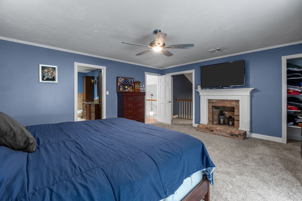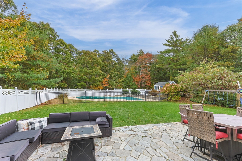 Nestled at the end of a quiet cul-de-sac shared by only four homes, this spacious property combines privacy, comfort, and exceptional entertaining space. The first floor offers a large vaulted living room with a double-sided propane fireplace shared with the formal dining room, creating a warm and inviting flow for gatherings. The kitchen features both a casual dining nook and a dedicated office, along with a half bath and convenient laundry area. Upstairs, three well-sized bedrooms share a full bath, while the expansive primary suite offers a true retreat with its own fireplace, full bath, and private balcony overlooking the natural wooded landscape. The finished lower level includes a half bath and provides the perfect space for a game room, media area, or guest overflow. Outside, the private fenced backyard is a true oasis — featuring a saltwater in ground pool, spacious patios for entertaining, a pool house, shed, additional storage building, outdoor shower, and hot tub hookup.