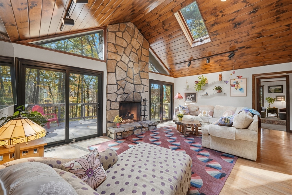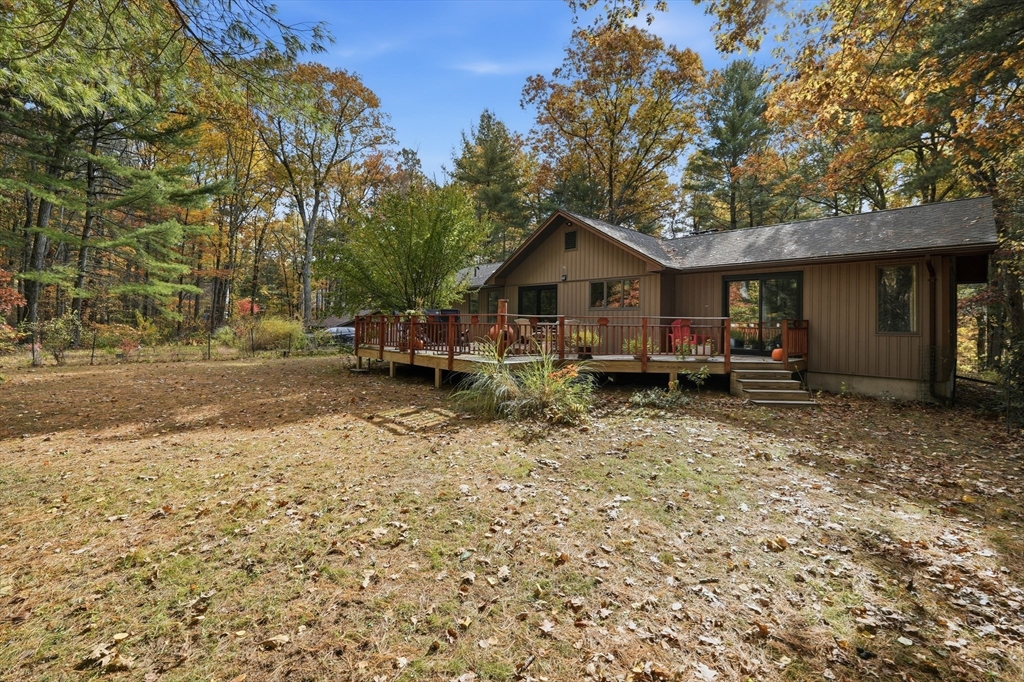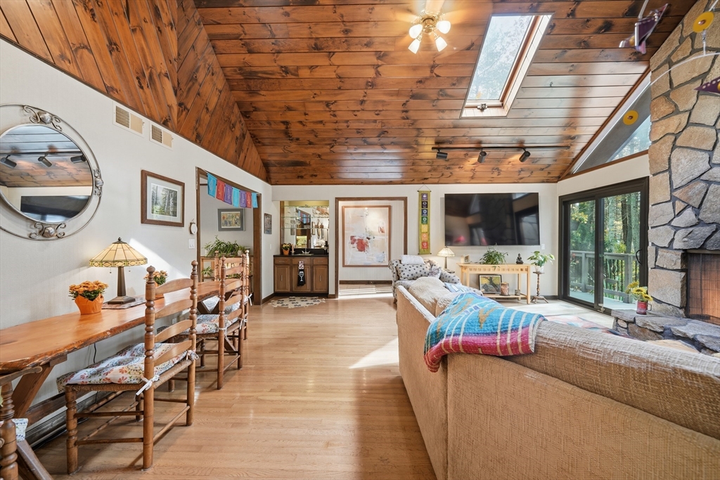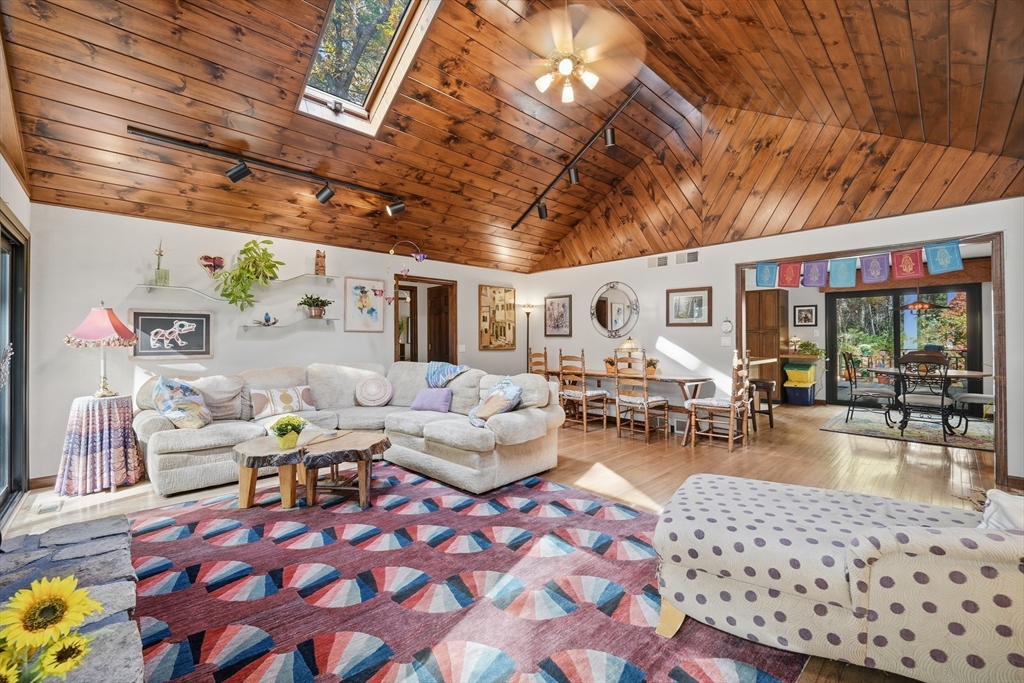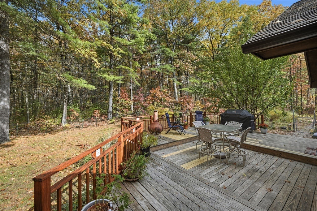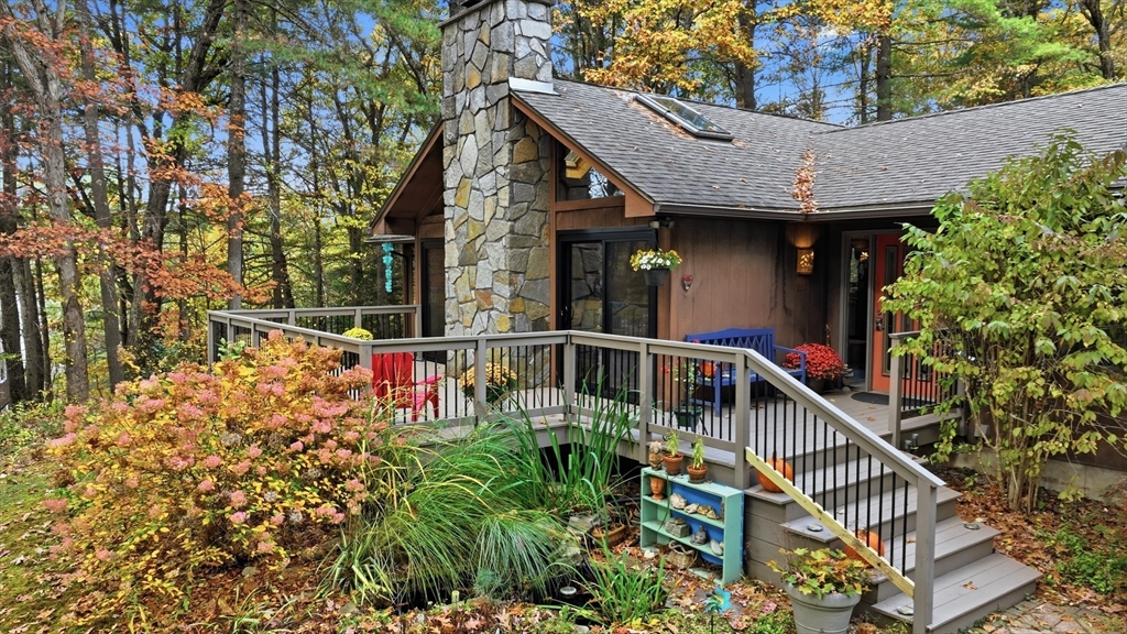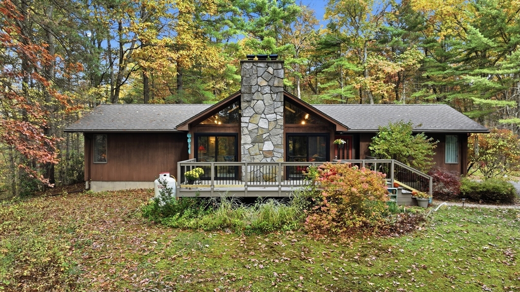 This one of a kind ranch is nestled in a private wooded setting on almost 5 acres! The walkway leads to a well maintained Coi Pond and generous decks on both the front and back of the home. (Brand new sliding glass doors.) The great room has stunning cathedral wood ceilings complete with floor to ceiling propane fireplace & wet bar. The open kitchen offers new appliances, ample storage, countertop space and a dining area. The guest bath with a soaking tub is off the living area. The large primary suite offers a walk in shower with double sinks. On the far side of the great room is the front to back versatile living space which was meant to be the 2nd & 3rd bedrooms should the buyer wants to pursue that option. The partially finished side of the basement is currently set up as another bedroom and the unfinished side has an impressive amount of space and ambience including a sauna & half bath. The laundry and office space complete the basement. This one is a must see!