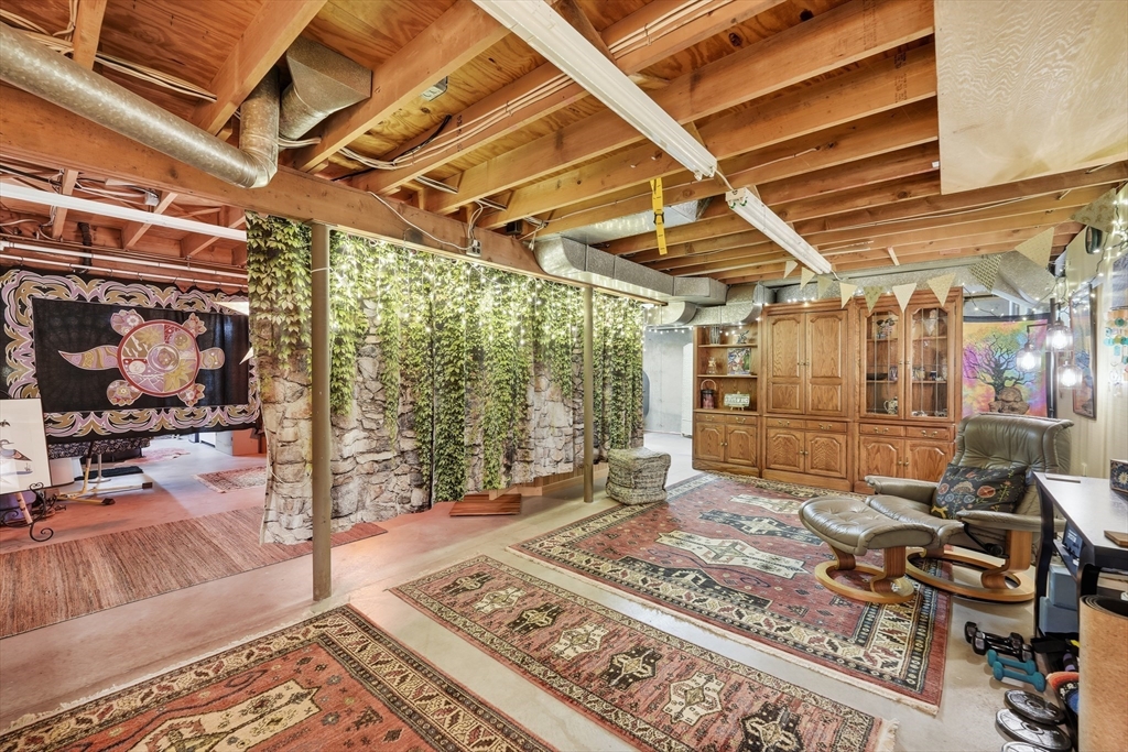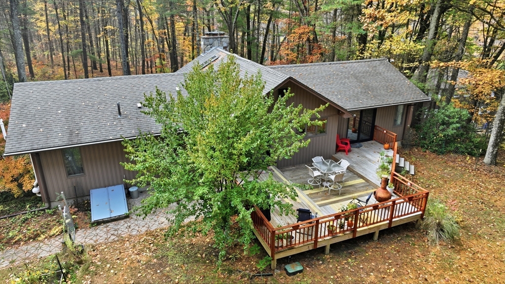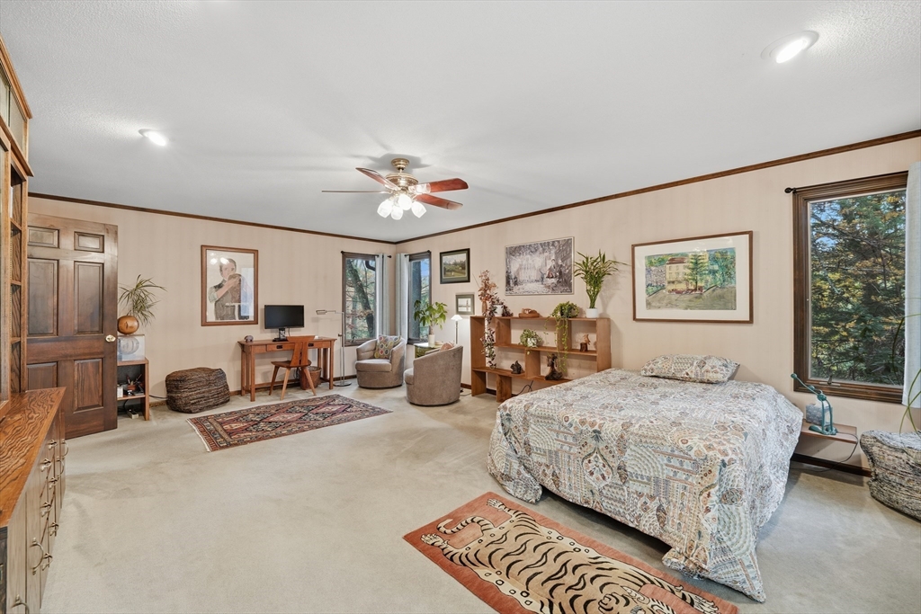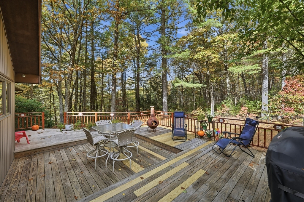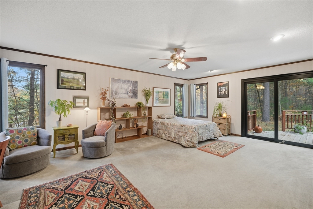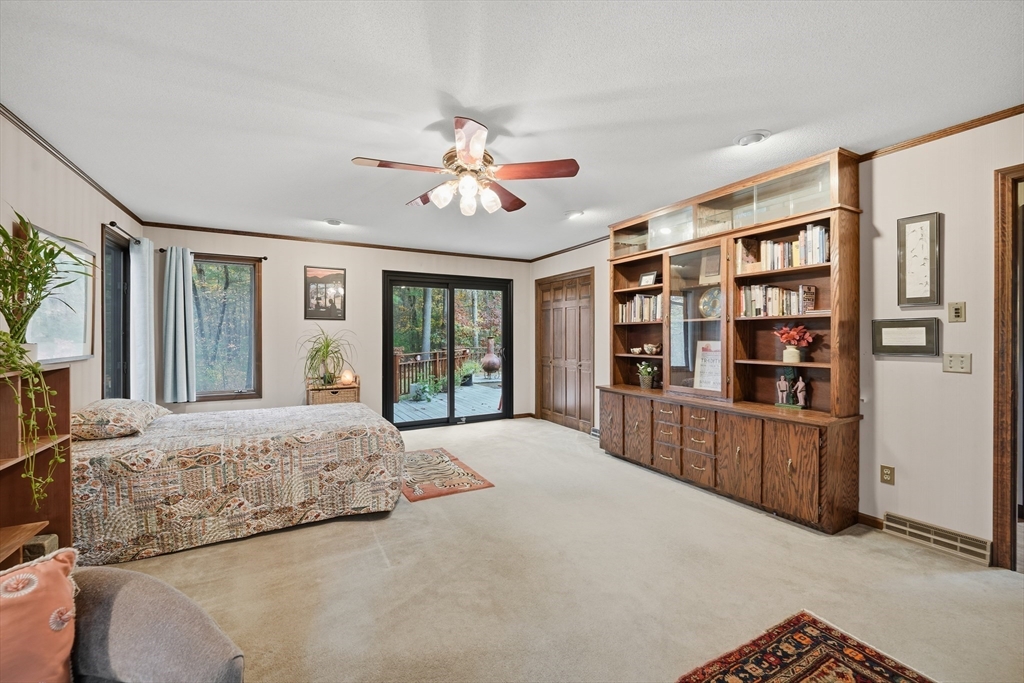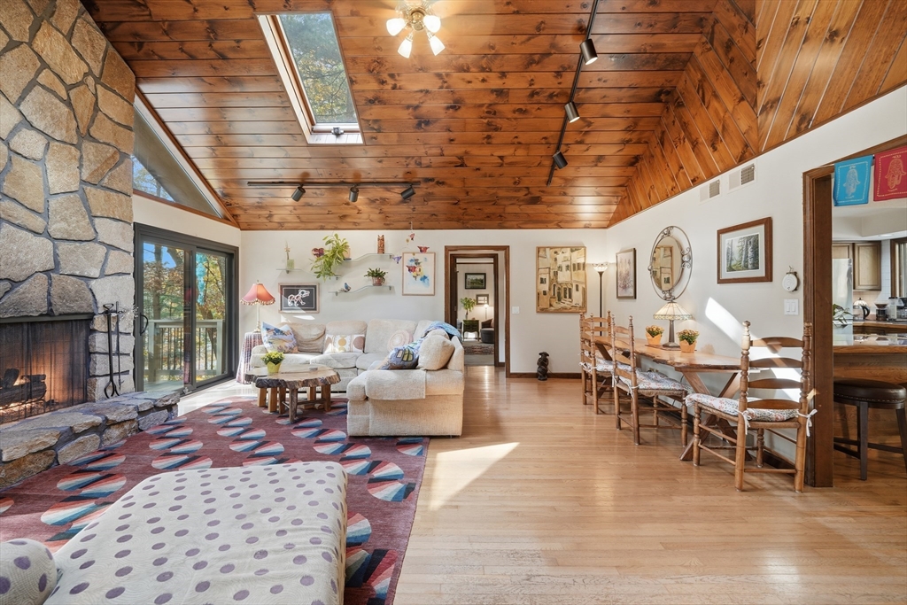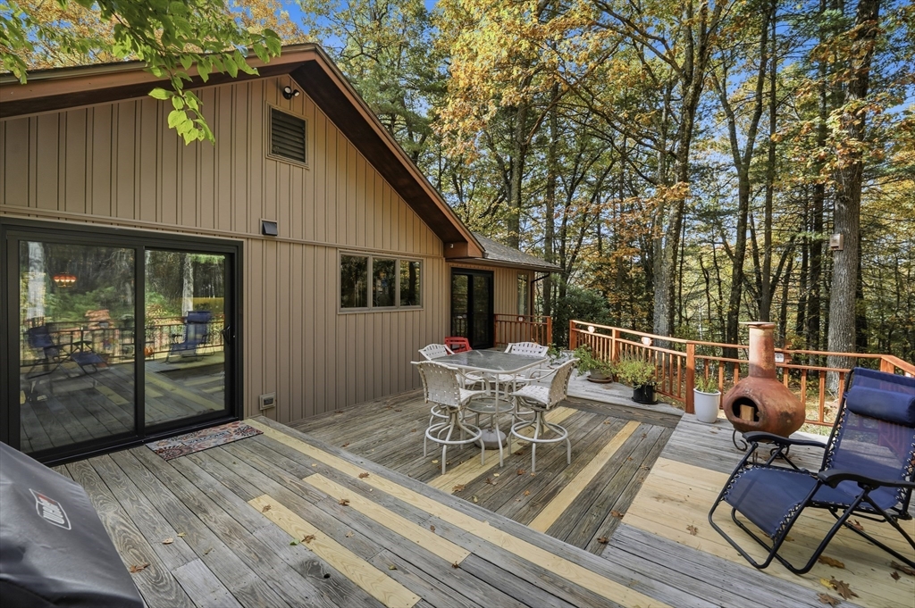 This one of a kind ranch is nestled in a private wooded setting on almost 5 acres! The walkway leads to a well maintained Coi Pond and generous decks on both the front and back of the home. (Brand new sliding glass doors.) The great room has stunning cathedral wood ceilings complete with floor to ceiling propane fireplace & wet bar. The open kitchen offers new appliances, ample storage, countertop space and a dining area. The guest bath with a soaking tub is off the living area. The large primary suite offers a walk in shower with double sinks. On the far side of the great room is the front to back versatile living space which was meant to be the 2nd & 3rd bedrooms should the buyer wants to pursue that option. The partially finished side of the basement is currently set up as another bedroom and the unfinished side has an impressive amount of space and ambience including a sauna & half bath. The laundry and office space complete the basement. This one is a must see!