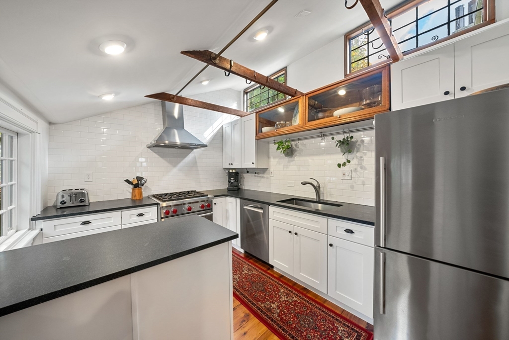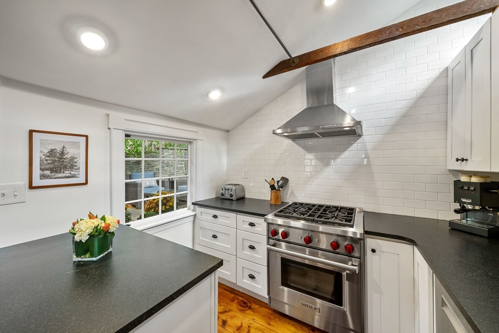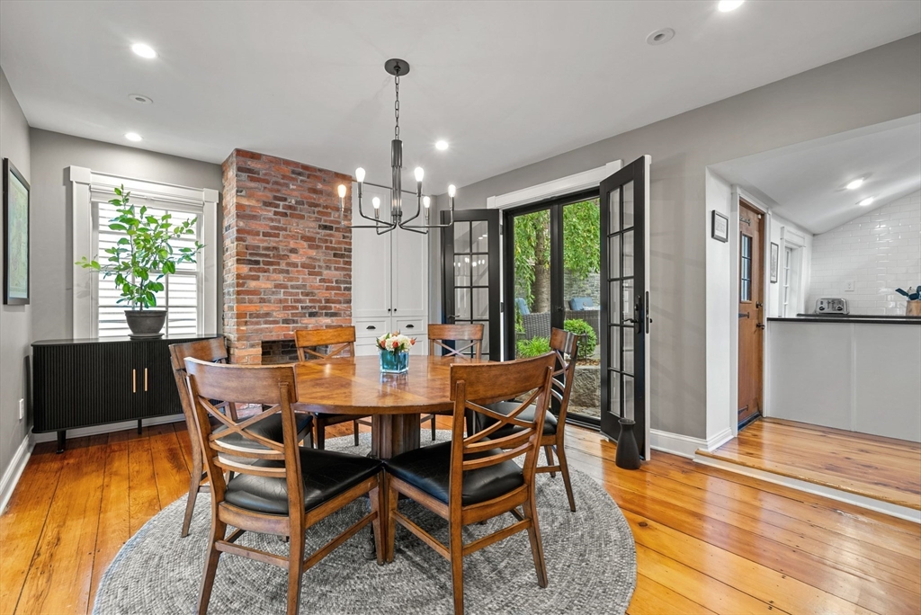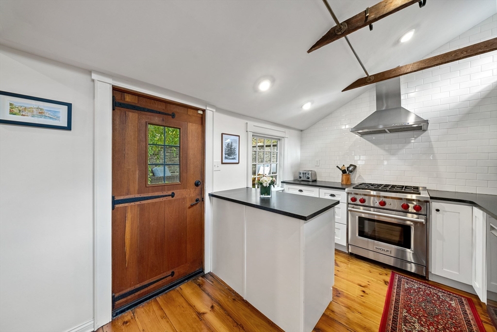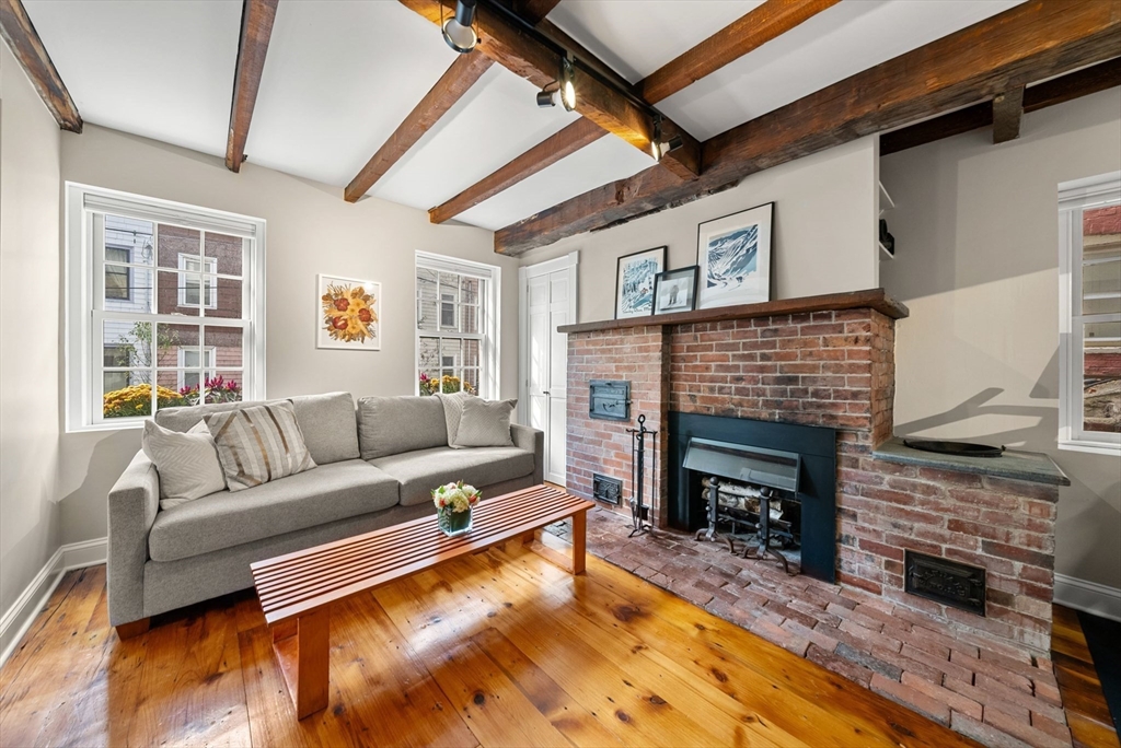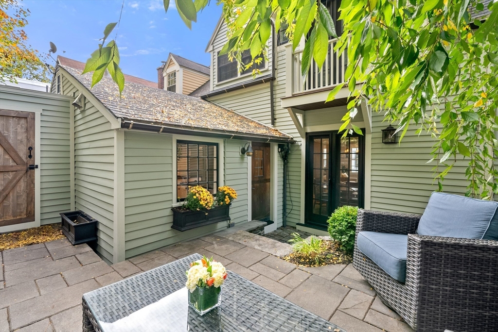 This lovingly restored, ca.1814, single family home features 4BR/2BA, 1480sf, and original historic details including 2 wood-burning FP's, exposed beams/brick, and pumpkin pine floors. The sun-filled main level features a spacious living room with corner exposure, that opens to an elegant dining room with French doors to a private garden patio with handsome stone wall, and chef's kitchen offering white shaker cabinetry, stainless professional appliances, including Wolf range, honed granite countertops, and vaulted ceiling. Nantucket dormered top level offers 3 bedrooms, including a primary w/balcony overlooking the patio and private grounds, and a luxurious full bath with Duravit soaking tub. An entryway w/custom built-in storage and bench seat, full bath w/marble mosaic floor and tub w/white subway tile surround, and family room/bedroom with 2 closets, are located on the first level. W/D, C/Air. The renovation of this classic cottage was designed by renowned architect, Patrick Ahearn.