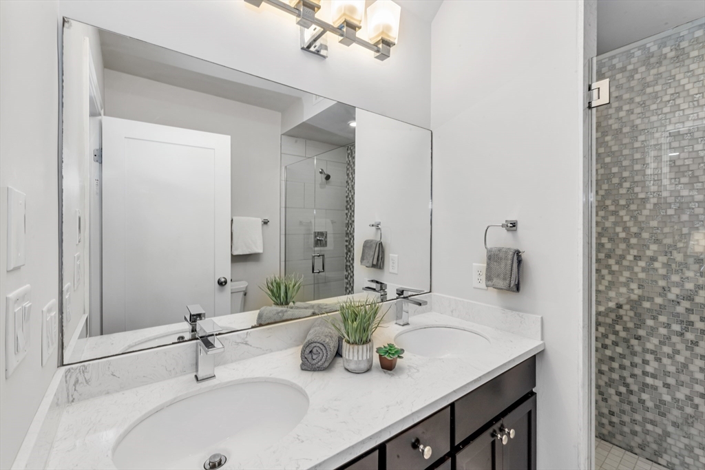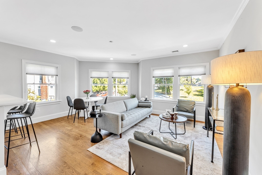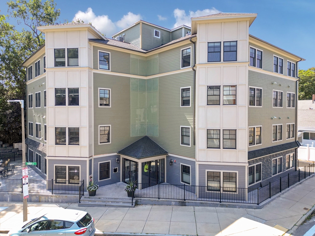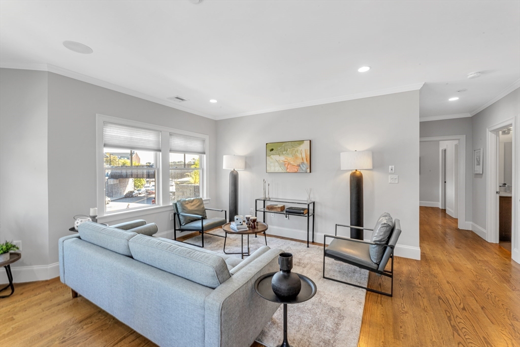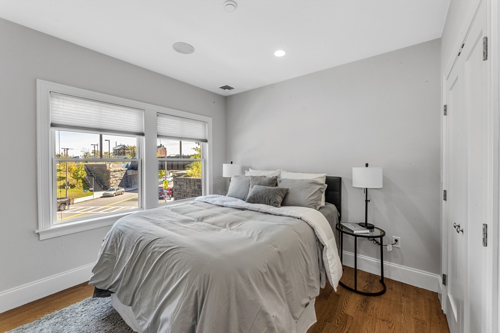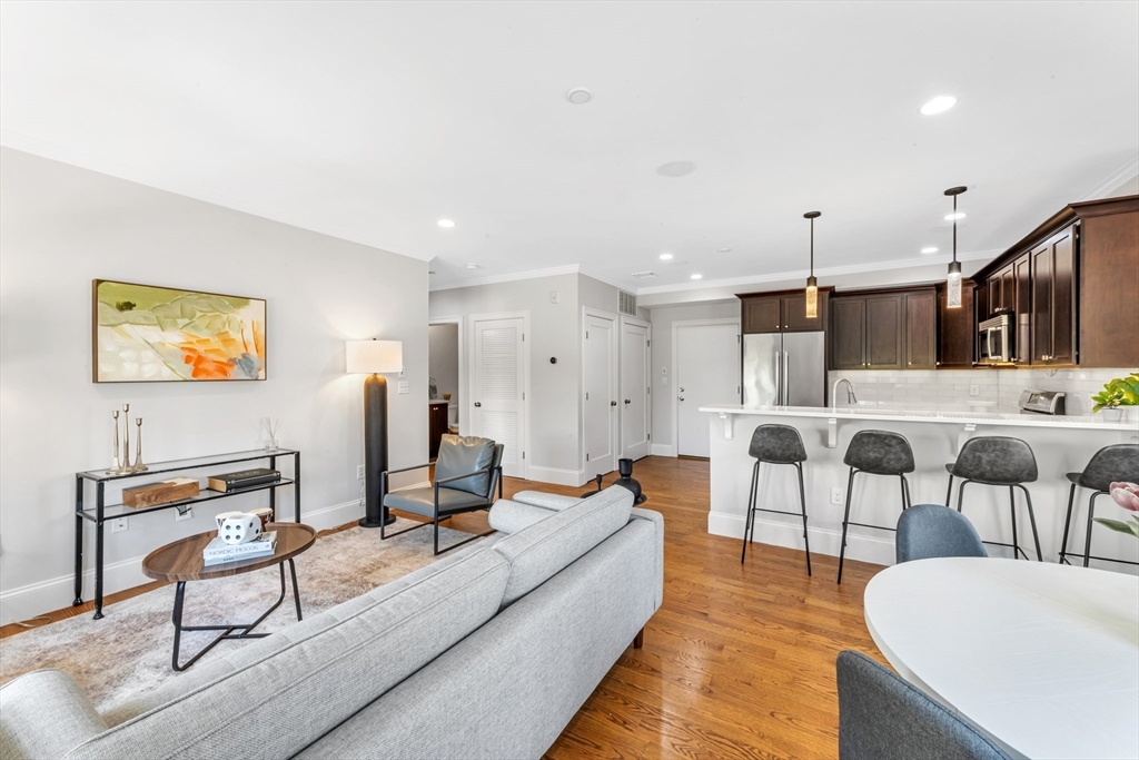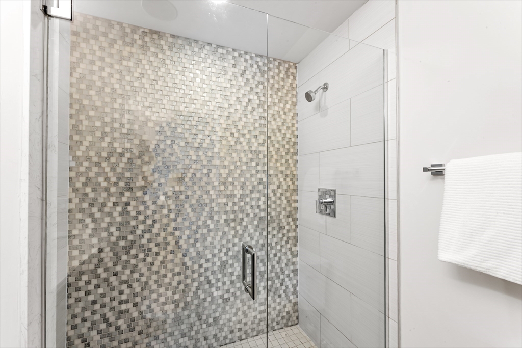 Feel connected to Roslindale Village—walls of windows in this sun-filled 2-bed, 2-bath condo bring the neighborhood’s energy right inside. This modern, professionally managed building offers elevator access for easy living. The open layout glows with recessed lighting, crisp moldings, and stylish finishes. Entertain in a sleek kitchen with quartz counters, stainless appliances, tile backsplash, and bar seating. Both bathrooms feature chic tile showers with glass doors—one en suite, one walk-in. The primary suite has a walk-in closet; the second bedroom is spacious and versatile. Enjoy central air, efficient HVAC, and built-in Bluetooth speakers throughout. Freshly painted and move-in ready. With Roslindale’s favorite restaurants—Delfino, Sophia’s Grotto, The Square Root—plus the Purple Line and Arnold Arboretum close by, urban living feels truly connected.