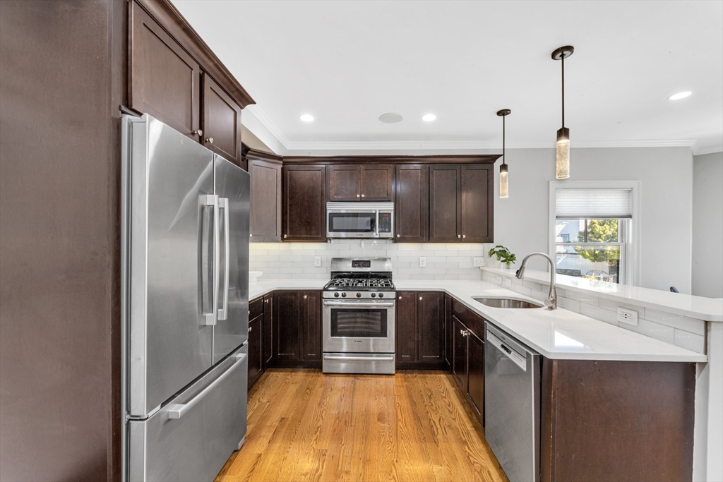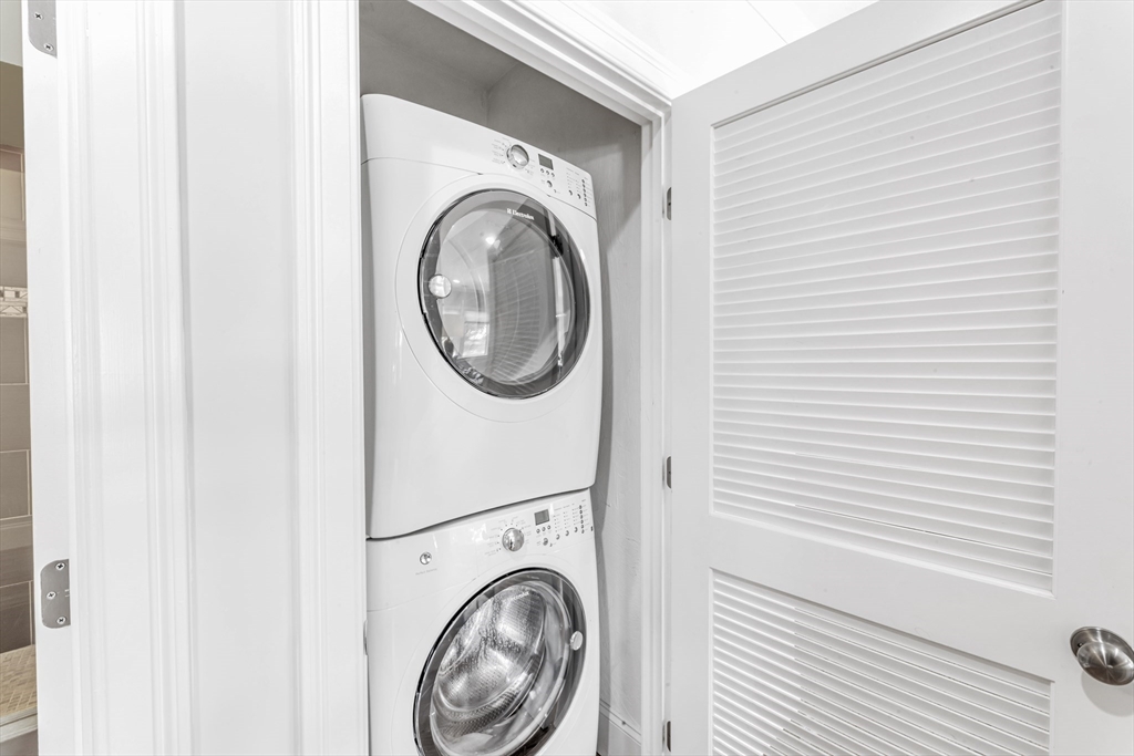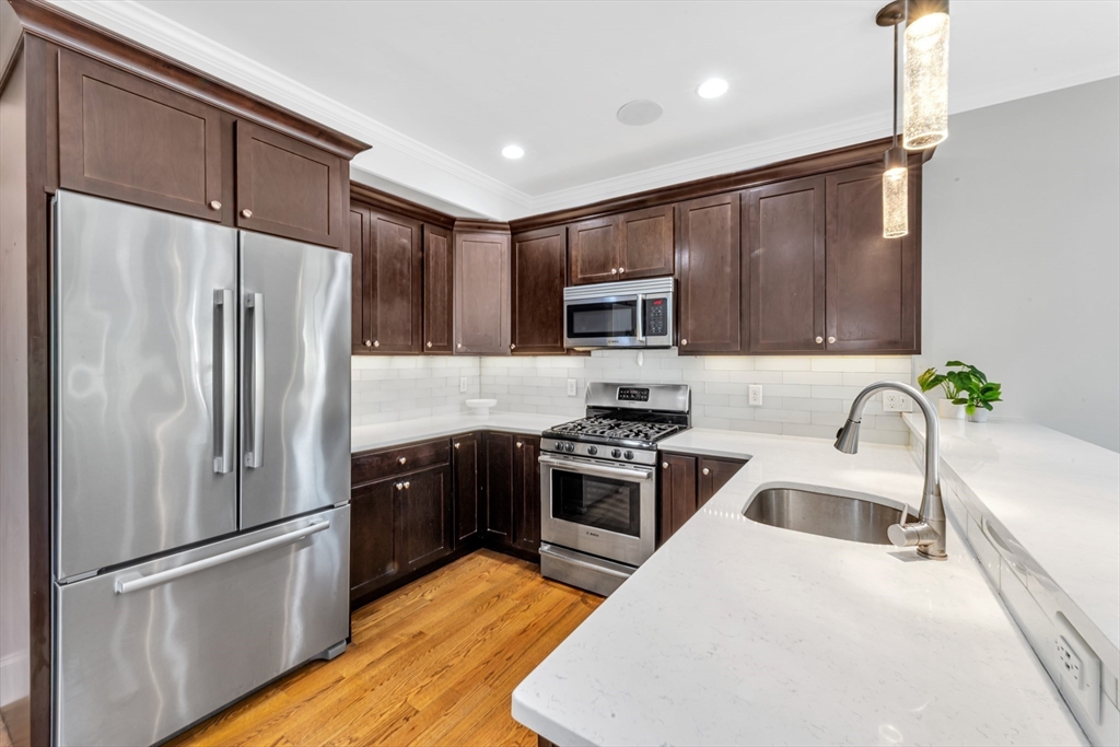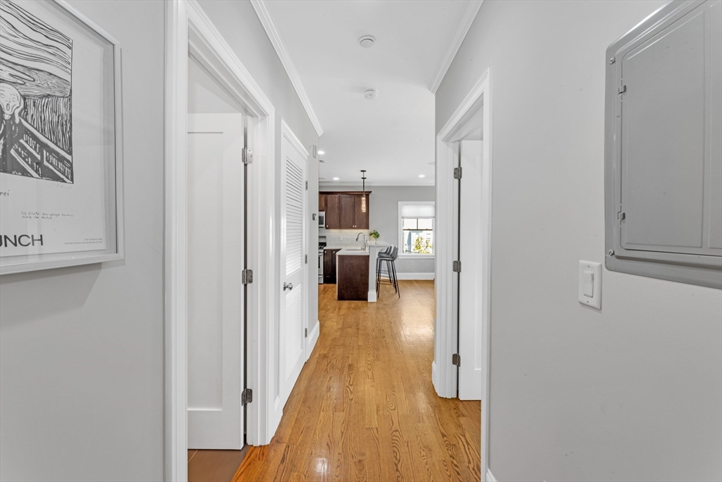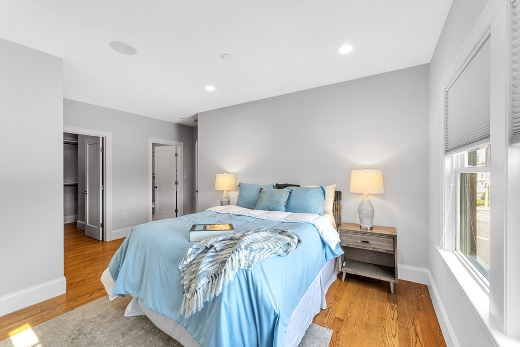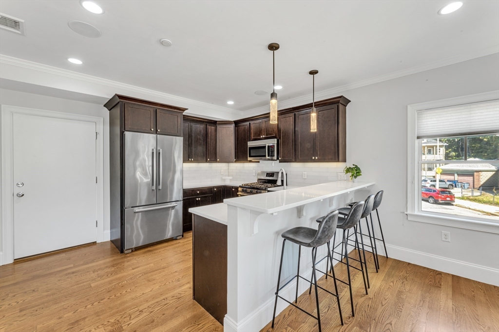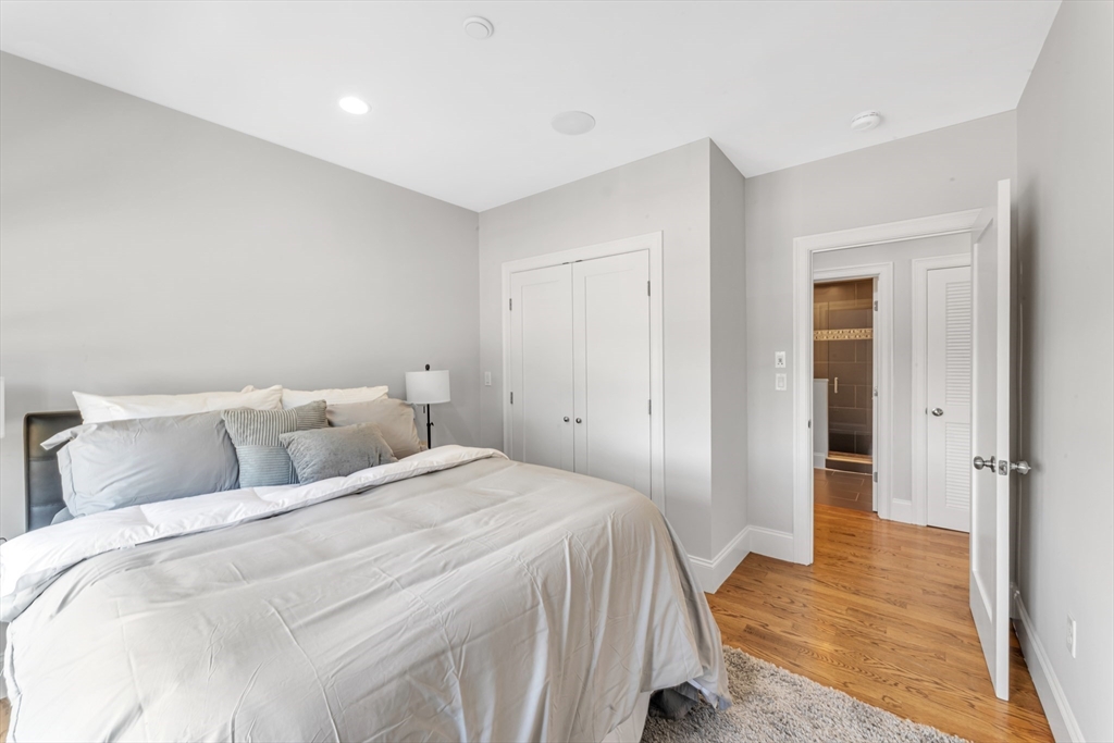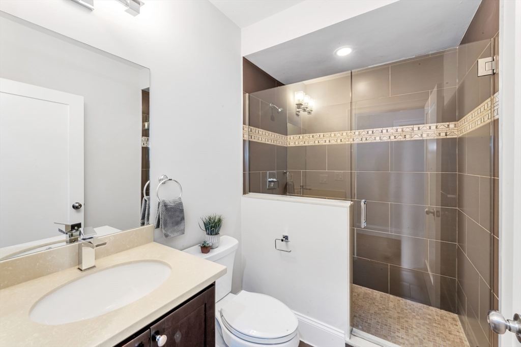 Feel connected to Roslindale Village—walls of windows in this sun-filled 2-bed, 2-bath condo bring the neighborhood’s energy right inside. This modern, professionally managed building offers elevator access for easy living. The open layout glows with recessed lighting, crisp moldings, and stylish finishes. Entertain in a sleek kitchen with quartz counters, stainless appliances, tile backsplash, and bar seating. Both bathrooms feature chic tile showers with glass doors—one en suite, one walk-in. The primary suite has a walk-in closet; the second bedroom is spacious and versatile. Enjoy central air, efficient HVAC, and built-in Bluetooth speakers throughout. Freshly painted and move-in ready. With Roslindale’s favorite restaurants—Delfino, Sophia’s Grotto, The Square Root—plus the Purple Line and Arnold Arboretum close by, urban living feels truly connected.