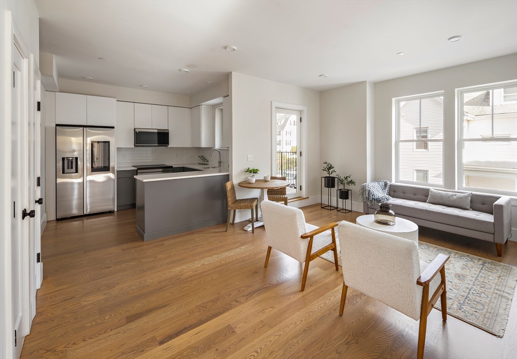 OPEN HOUSE Sunday 2-3:30! Welcome to The Doherty West Medford, a new era of contemporary living. This boutique 9-unit condo complex is designed for modern living, offering stylish residences with premium finishes throughout. This exceptional 2 bed, 1 bath south facing corner unit showcases a stunning kitchen with sleek white slab upper cabinets, contrasting gray lower cabinets, chrome hardware, and Samsung appliances including a refrigerator with screen and built-in microwave. The sun-filled living area opens to a private, covered deck, perfect for relaxing or entertaining. A ground level coffee shop brings convenience to your doorstep, plus one deeded parking spot. Nestled in a prime location just 0.1 miles from the West Medford MBTA station, enjoy convenient access to public transit, as well as local restaurants, shops, and parks. With major routes nearby, easily commute into Boston and the surrounding communities. Area amenities include The Middlesex Fells Reservation and Tufts.