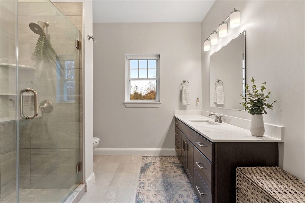 Welcome to The Woodlands! This beautifully maintained, single-level condo offers comfort, convenience, & modern style in a prime commuter location. The original owners have lovingly cared for this corner unit, ideally positioned on the quiet back side of the building. Enjoy peaceful views of trees and birds from your private balcony — the perfect spot to unwind. The open concept living area features a bright kitchen with quartz counters & upgraded cabinetry, seamlessly flowing into the dining & living room. The spacious primary suite includes a large walk-in closet and private bath. A second bedroom (or office) and another full bath are located on the opposite side of the unit, along with in-unit laundry for easy living. Garage parking for one car plus an exterior space for a second vehicle. The building includes an elevator for easy access. Conveniently located near major routes, shopping, restaurants, and a local gym.