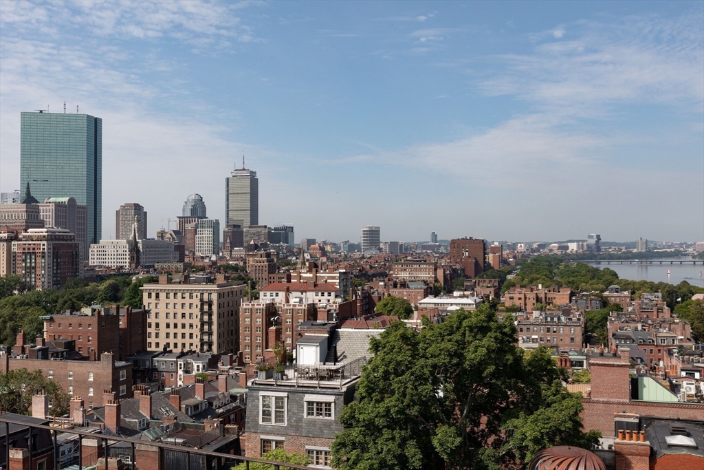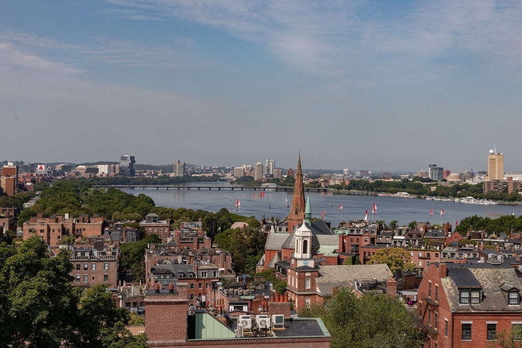 A-plus location. On upper Mt. Vernon Street is this spacious two-bedroom, one and a half bath garden level unit. Enter through a foyer with coat closet leading to an enormous living/dining room with parquet floor, built-in display cabinet with storage, and windows overlooking a charming, landscaped courtyard. U-shaped kitchen off foyer with wood cabinets, granite counters and pass-thru to the living room. Two bedrooms. Common outside areas include a pleasant courtyard and a beautiful roof deck with the most spectacular and far-reaching views of Boston. Located in an impressive pair of twin brownstone mansions circa 1840 on the Mt. Vernon Street side and a former chapel on the Chestnut Street side, this is an opportunity to customize the unit to your own standards in one of the most impressive building complexes on the Hill. Live-in superintendent, exercise room, professionally managed association.
