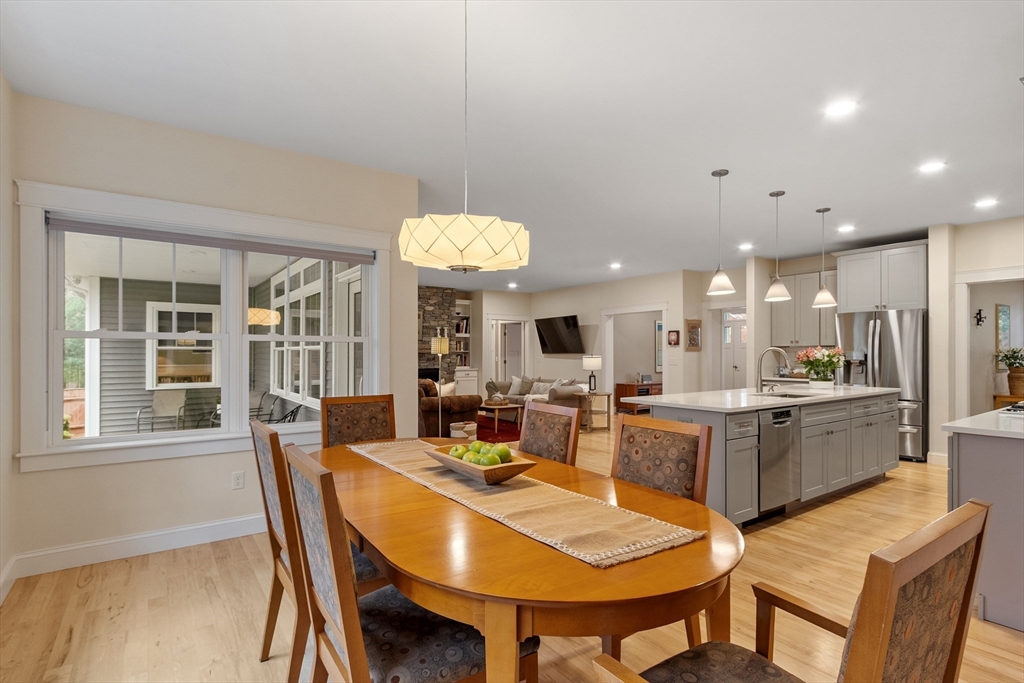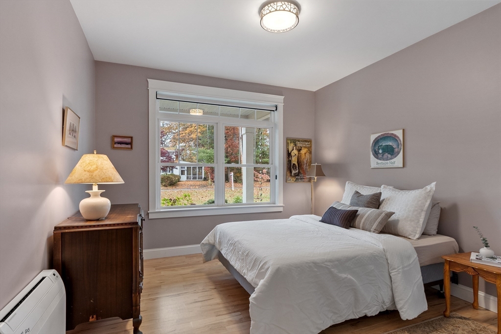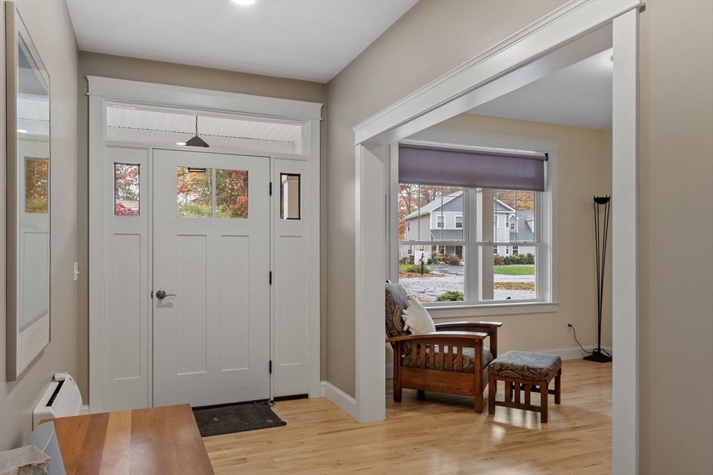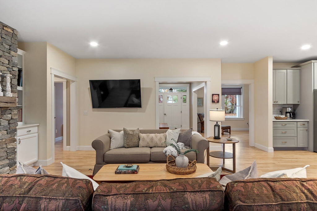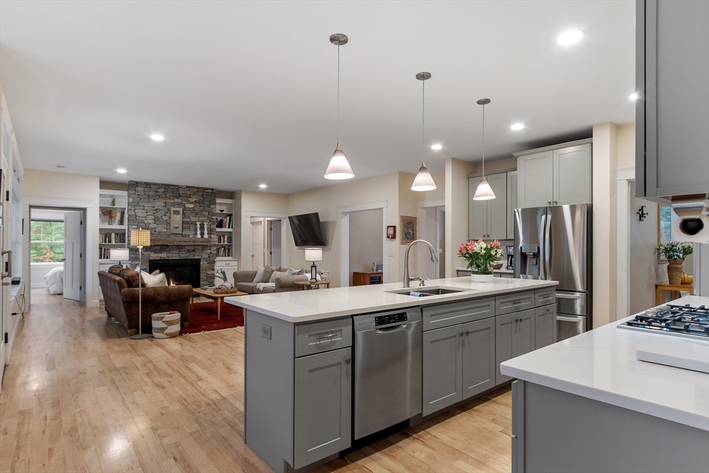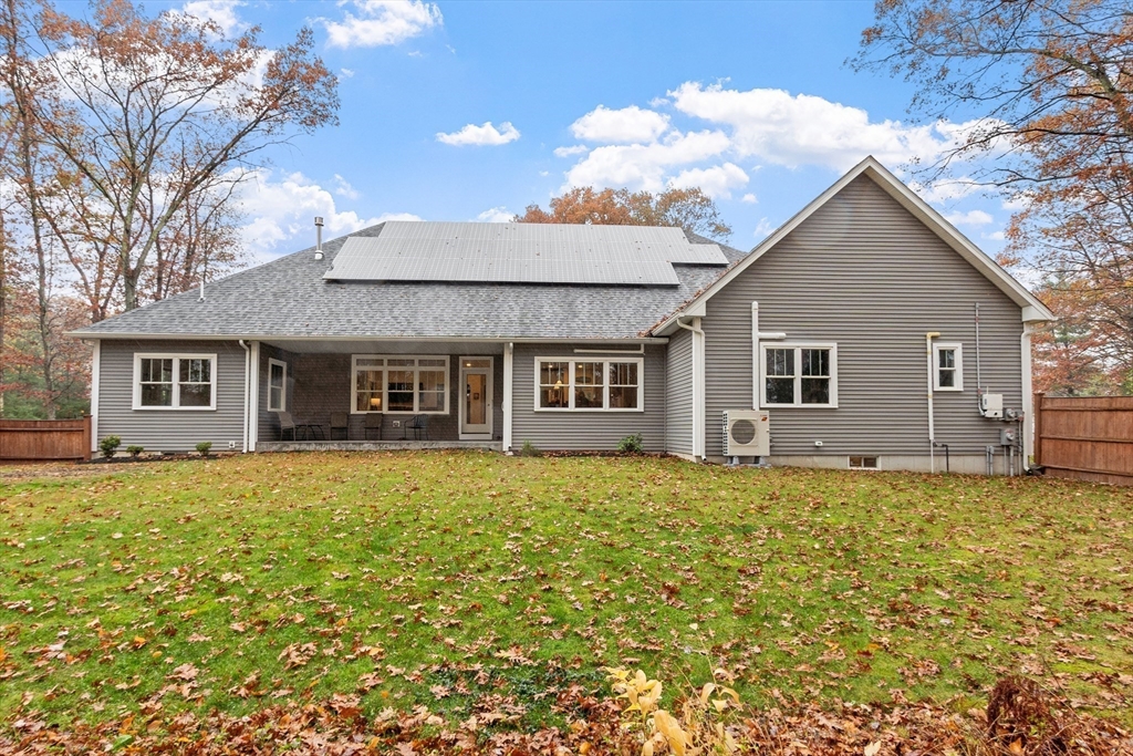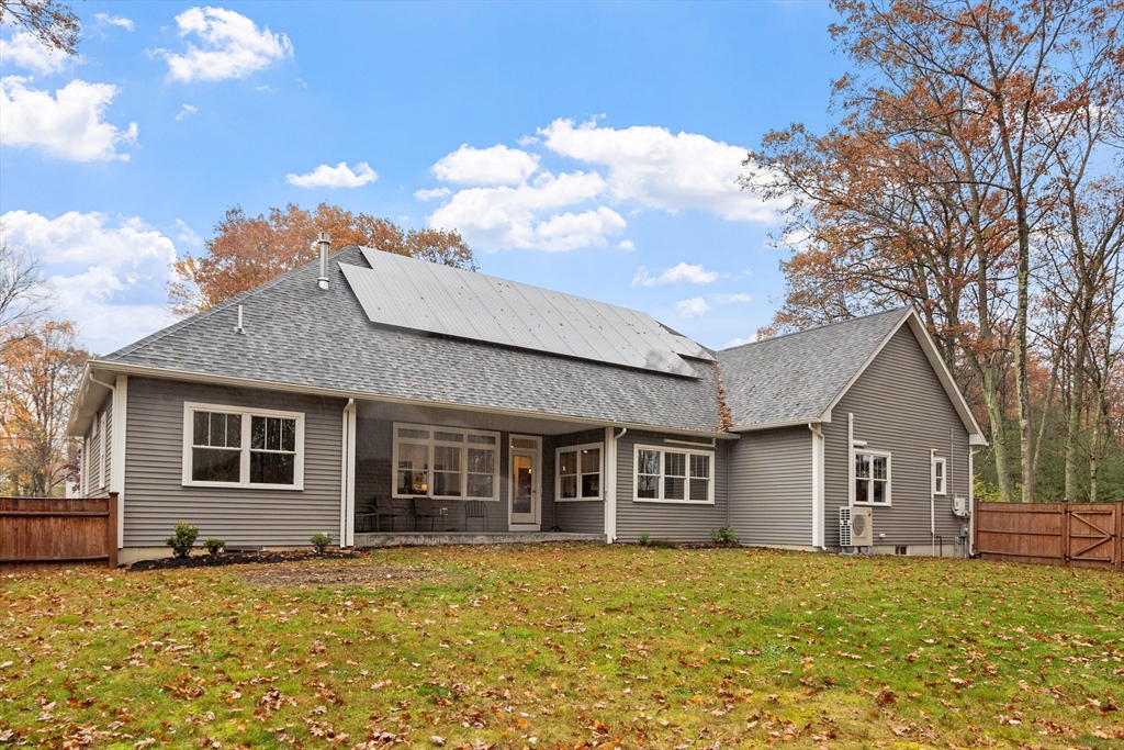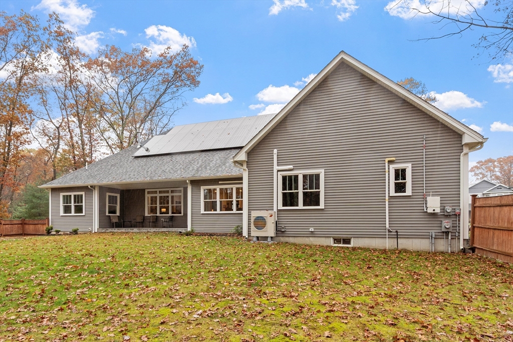 Rare opportunity! This 6-year-young custom ranch blends quality craftsmanship, energy efficiency, and modern comfort on a quiet country road. The covered porch welcomes you into a spacious mudroom that opens to a bright, open-concept living area with gleaming hardwood floors, large windows, and a cozy gas fireplace.The chef’s kitchen features quartz countertops, custom cabinets, and a large island. Sunlit dining and living spaces flow seamlessly to a private fenced backyard with a patio—ideal for relaxing or entertaining. The main suite includes a walk-in closet and a spa-like bath with double vanity and quartz finishes. Three additional bedrooms offer large closets, and the 2nd full bath has double sinks and separate tub area. A two-car garage and expansive unfinished basement provide excellent storage and expansion potential. Updates include mini-split systems, owned solar panels, water filtration, and a backup generator. Convenient to Hudson Center, Highland Commons, and I-495/I-290