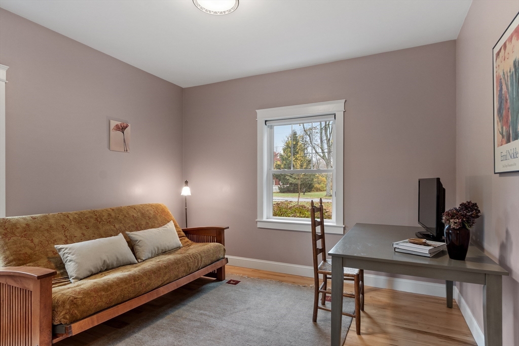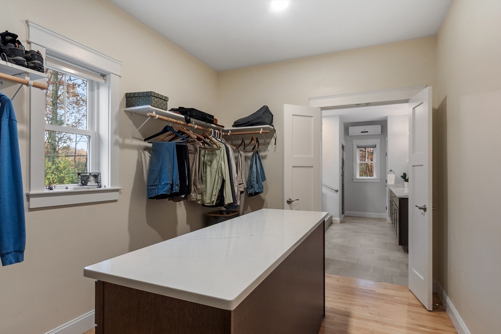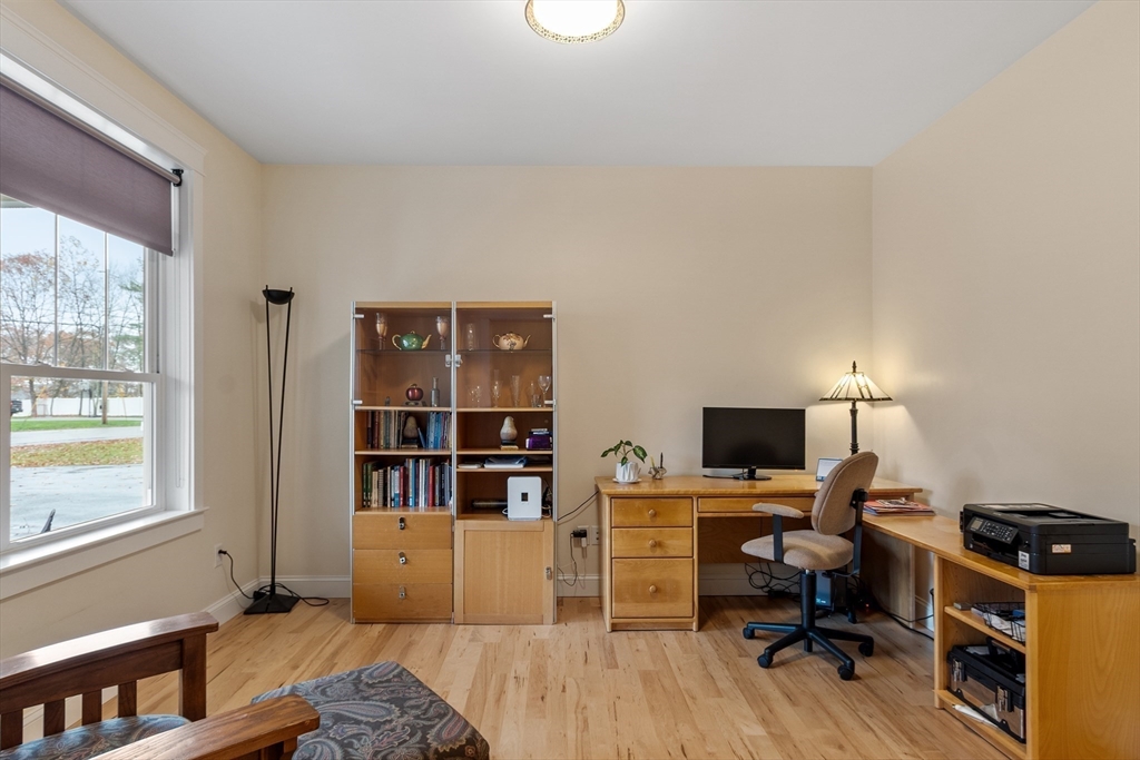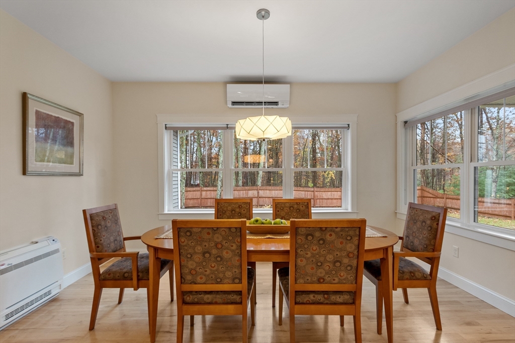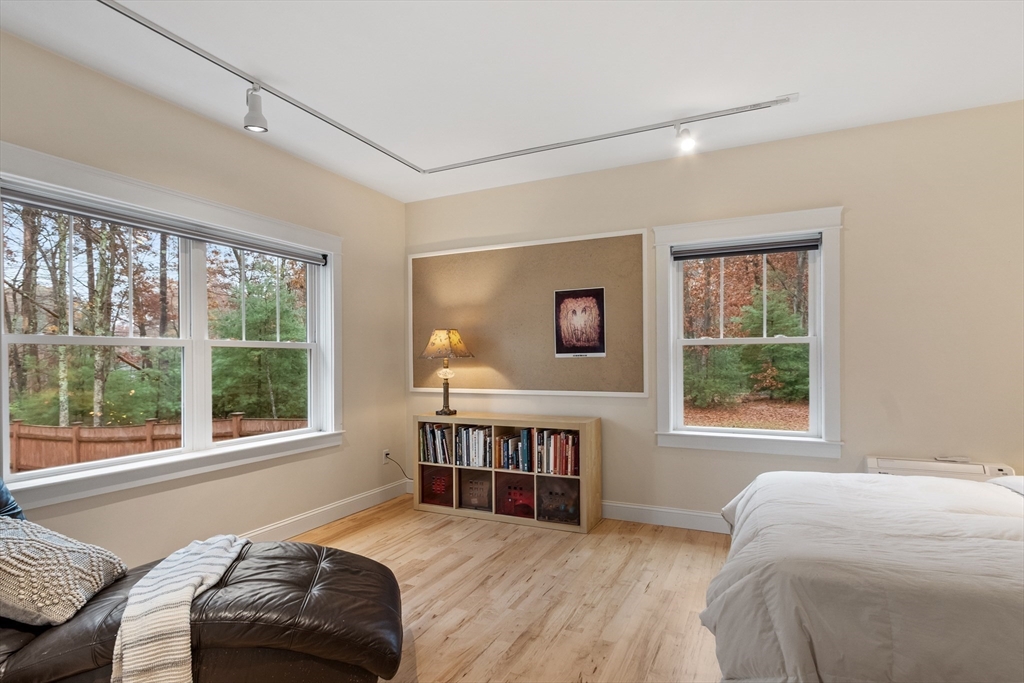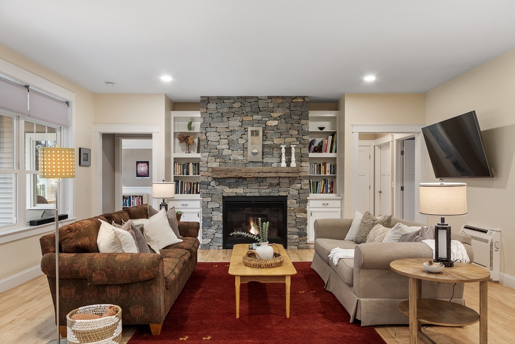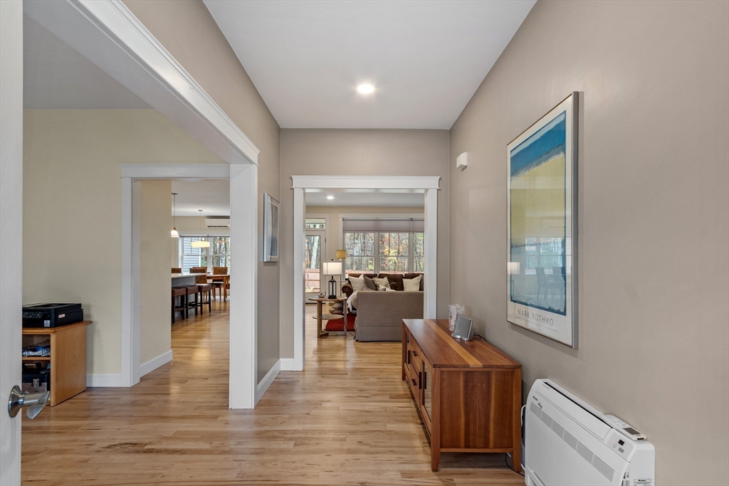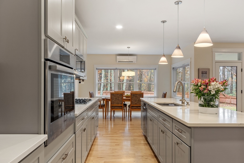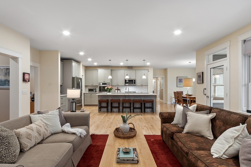 Rare opportunity! This 6-year-young custom ranch blends quality craftsmanship, energy efficiency, and modern comfort on a quiet country road. The covered porch welcomes you into a spacious mudroom that opens to a bright, open-concept living area with gleaming hardwood floors, large windows, and a cozy gas fireplace.The chef’s kitchen features quartz countertops, custom cabinets, and a large island. Sunlit dining and living spaces flow seamlessly to a private fenced backyard with a patio—ideal for relaxing or entertaining. The main suite includes a walk-in closet and a spa-like bath with double vanity and quartz finishes. Three additional bedrooms offer large closets, and the 2nd full bath has double sinks and separate tub area. A two-car garage and expansive unfinished basement provide excellent storage and expansion potential. Updates include mini-split systems, owned solar panels, water filtration, and a backup generator. Convenient to Hudson Center, Highland Commons, and I-495/I-290