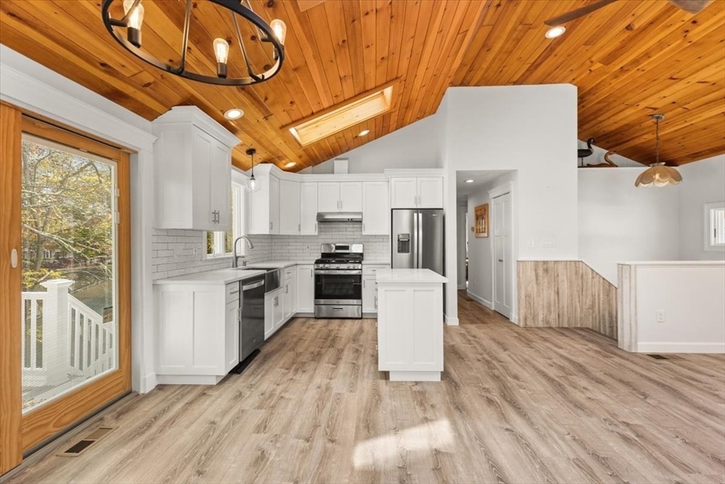 This beautifully maintained home features a glimpse of the Wareham River from both the deck and dining area. Enjoy the Open concept floor plan and all-new flooring, custom wood trim, interior doors, recessed lighting, and stunning wood cathedral ceilings. Natural light flows throughout from the multi skylights and sliding glass doors that open to the private deck. The custom kitchen has new appliances, gas cooking and gas heating & Central AC. Most windows and doors have been replaced, and roof & Hardie Board siding have been updated within the last seven years. The property is also insulated for efficiency. Walk out lower level includes a full bath and is partially finished, offering the opportunity to create your ideal space. Just a short walk to the Wareham River and the neighborhood playground, with easy access to highways, shopping and dining. Nearby to Onset Beach & Little Harbor Golf Course. The home offers the possibility of creating an accessory dwelling unit or in-law suite.