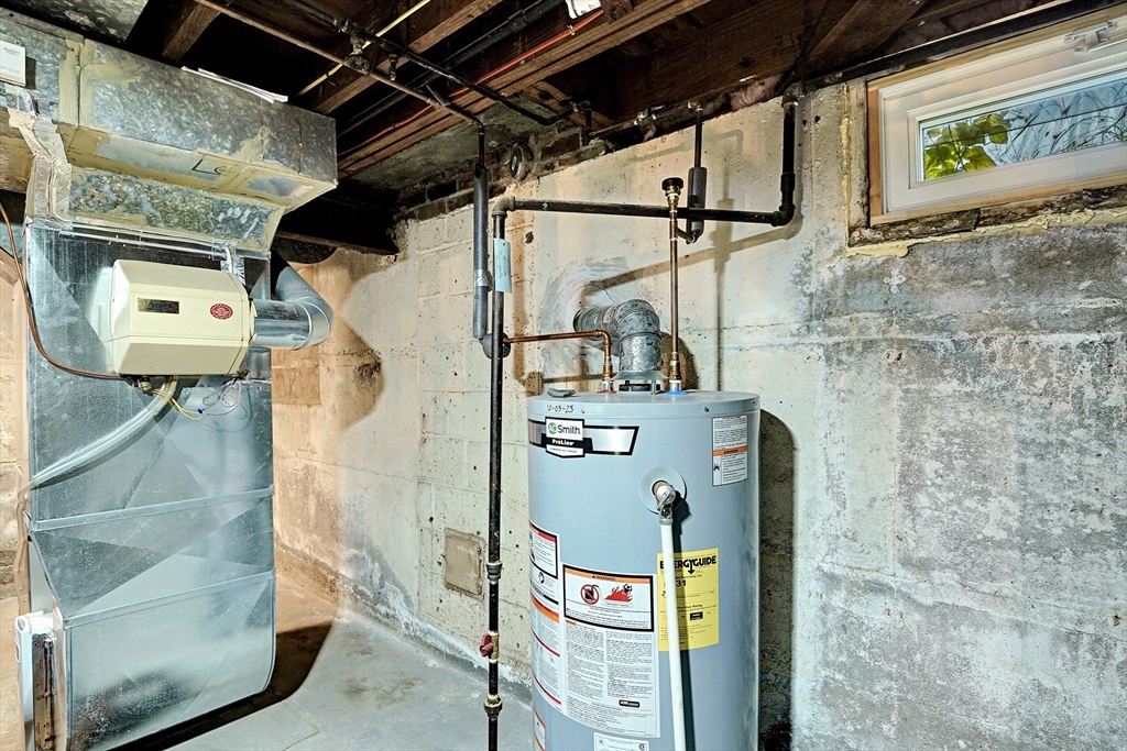 Updated 6+ room, 3 bdrm, 1.5 bath, centrally air conditioned Colonial offers1324 SF living area featuring an attractive remodeled kitchen w/updated cabinets, stainless steel appliances, gas cooking & dining area, step down Dining/family room w/sliders to fenced back yard & patio, living room w/fireplace/recessed LED lights & custom built-in bookshelves, guest lav & interior garage entrance all on the main level. Upstairs offers primary bedroom with walk in closet, updated full tub/shower bath/laminate floor/newer vanity sink/high rise commode, as well as 2 other bedrooms each with closets. Basement is great for storage, has a laundry area and space for a workshop. Home is well maintained and offers a circular driveway for safe & easy access to the street with plenty of room for guest parking. Great for entertaining! Level yard in back is fully fenced, great for pets.Leased solar panels keep energy costs low, only $59/month.