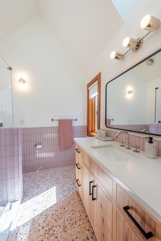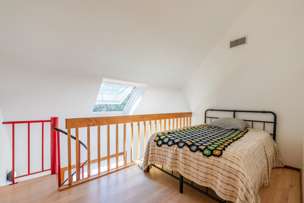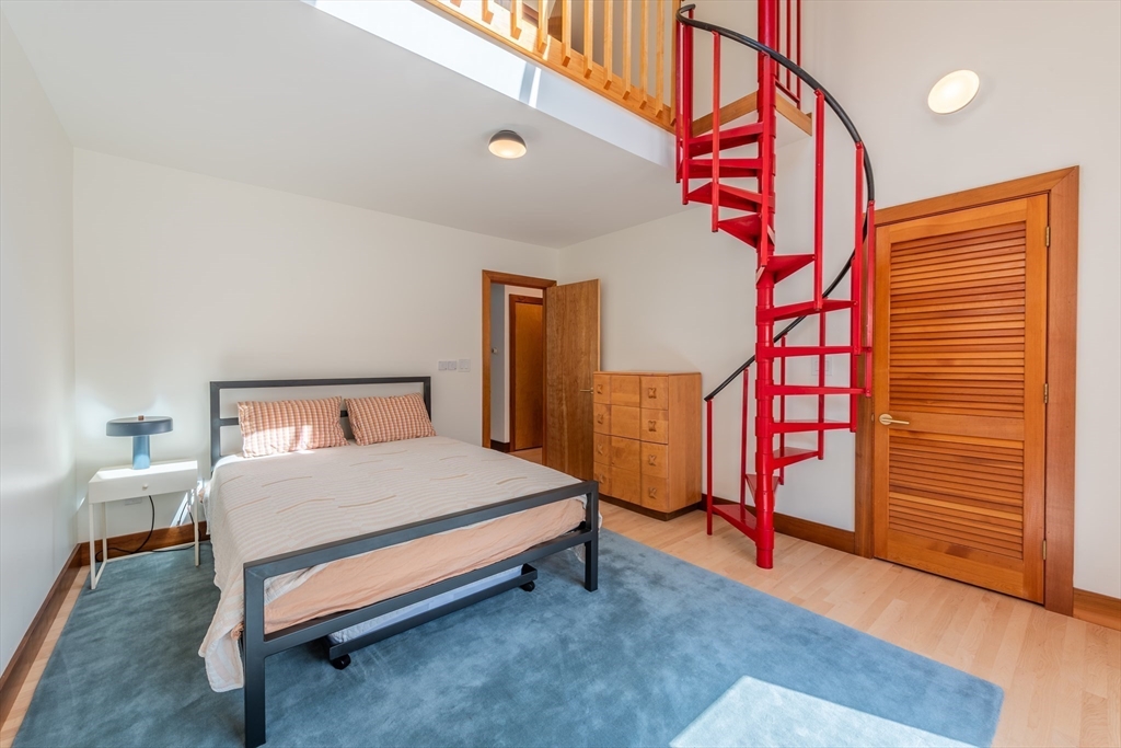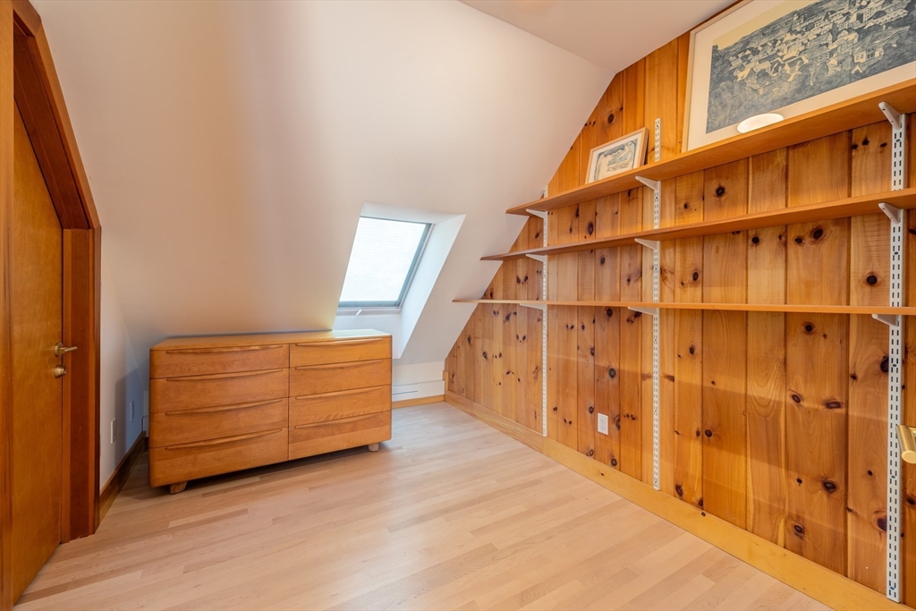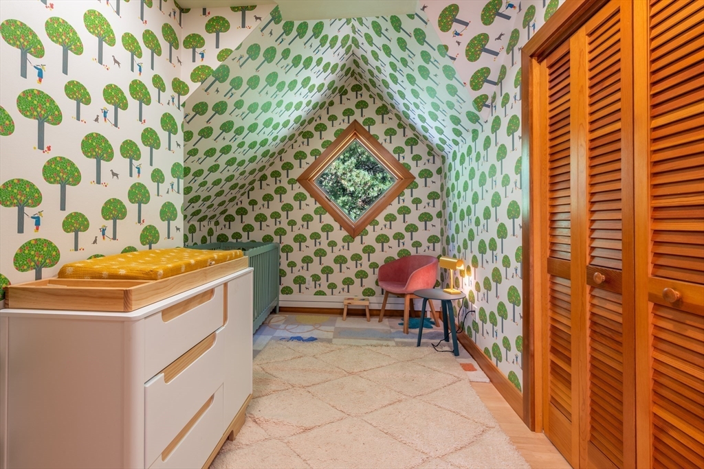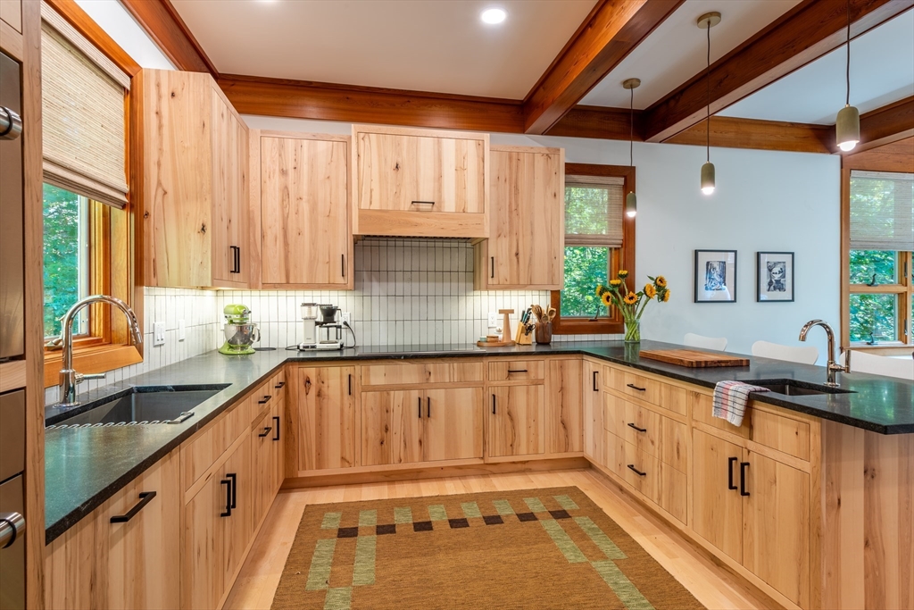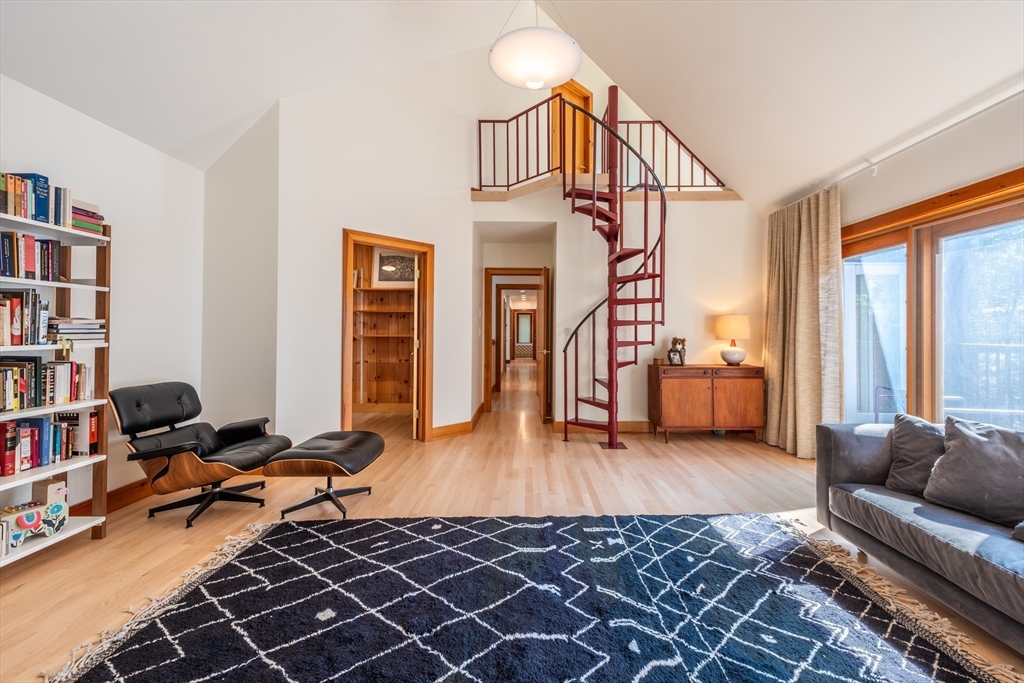 This spacious Amherst Woods contemporary has been thoroughly and tastefully updated in 2025 by the sellers in collaboration with Integrity. A southern exposure with expansive banks of windows combines with numerous skylights to fill the home with natural light. Main level offers living room with wood stove, family room, full bath, laundry, and kitchen/dining. The latter sports spacious pantry, Wolf wall oven and additional steam oven, Wolf induction range, and Sub-Zero refrigerator. Upstairs are primary suite and office (both adjoining a renovated balcony), three additional bedrooms, sitting room, and full bath. Multiple spiral stairs access partially finished attic/bonus space. In the lower level find den, full bath, studio, and entry hall with wet bar and wine storage. All bathrooms are fully renovated w/ heated floor tile and premium finishes. Spacious back yard includes extensive Goshen stonework and new composite deck. Owned solar & generator are additional perks. A rare find!