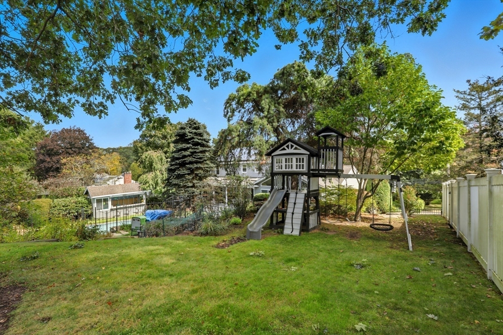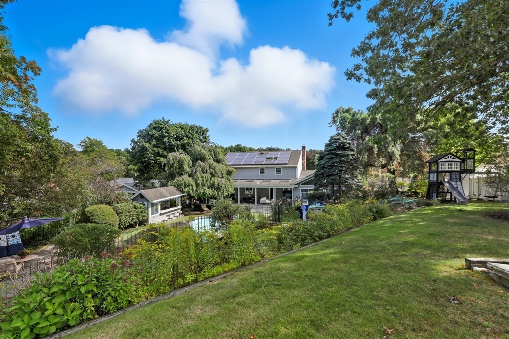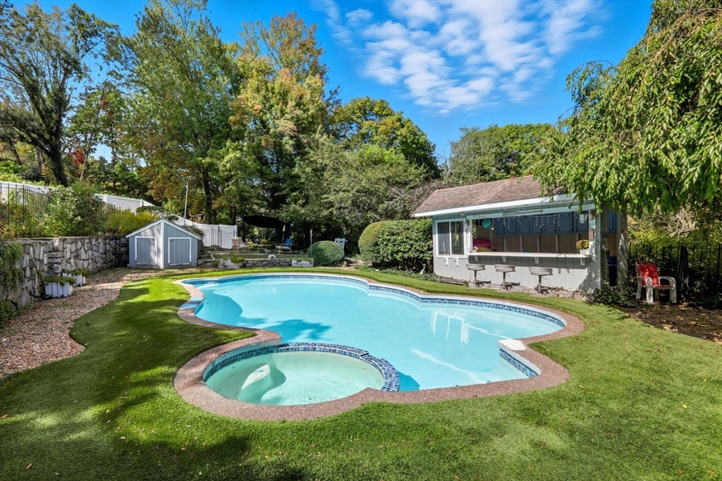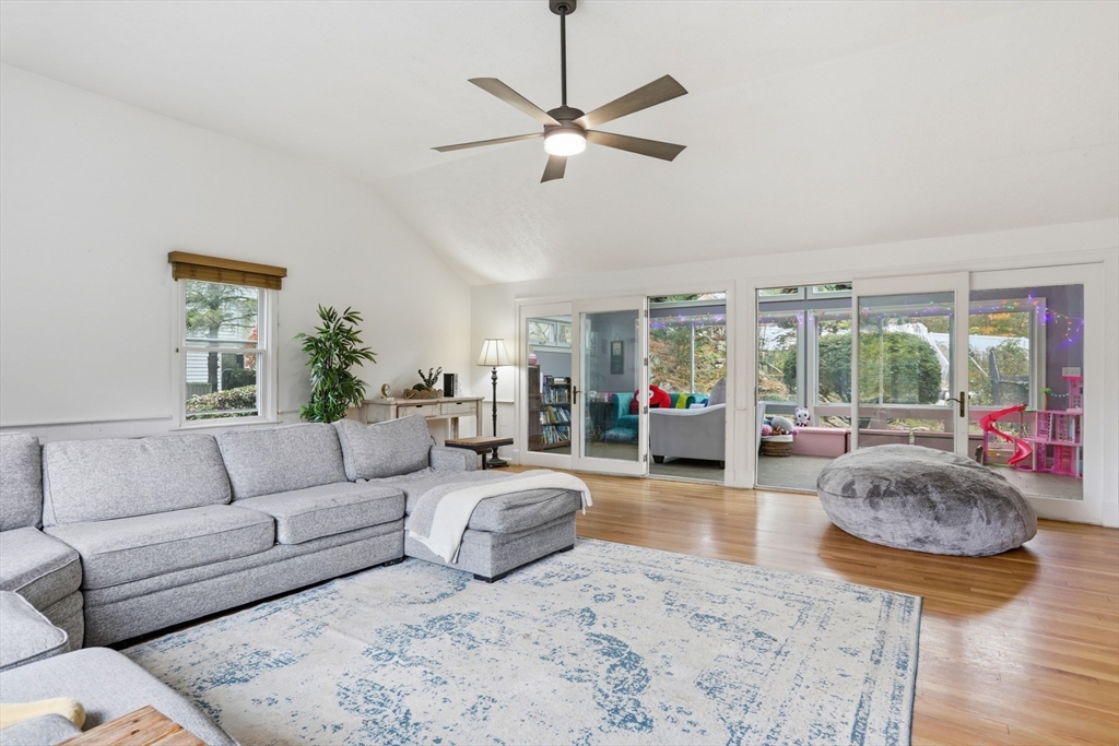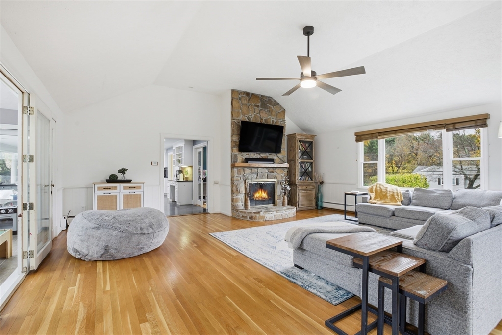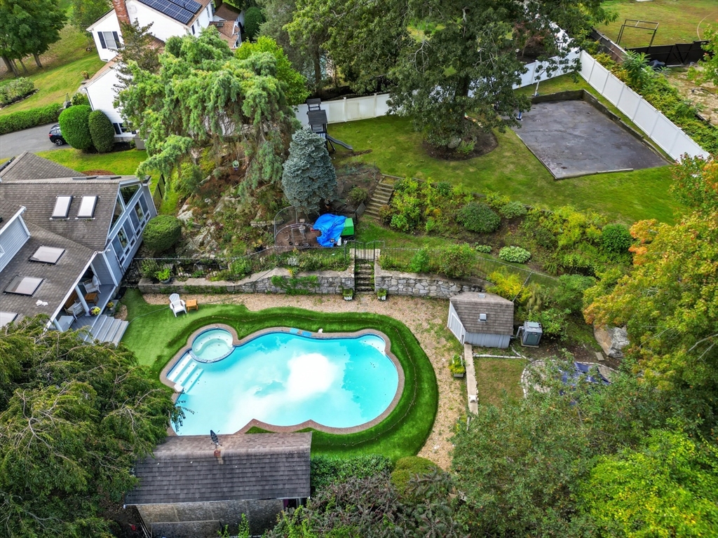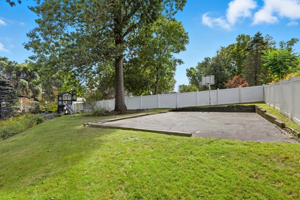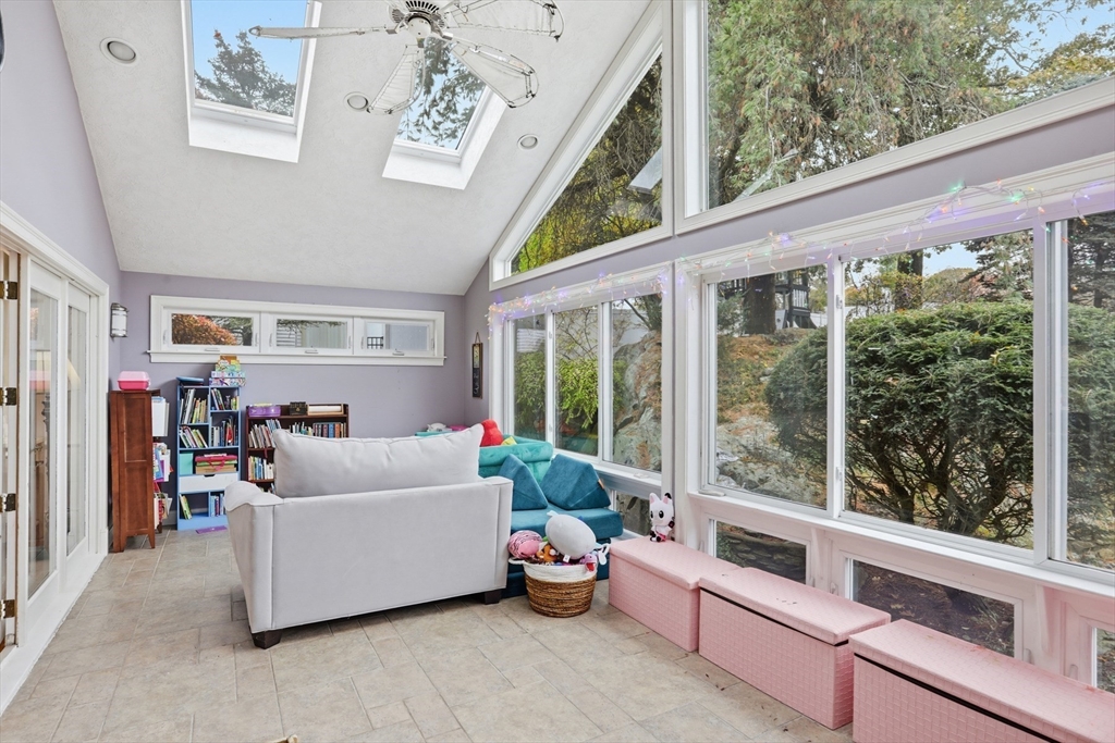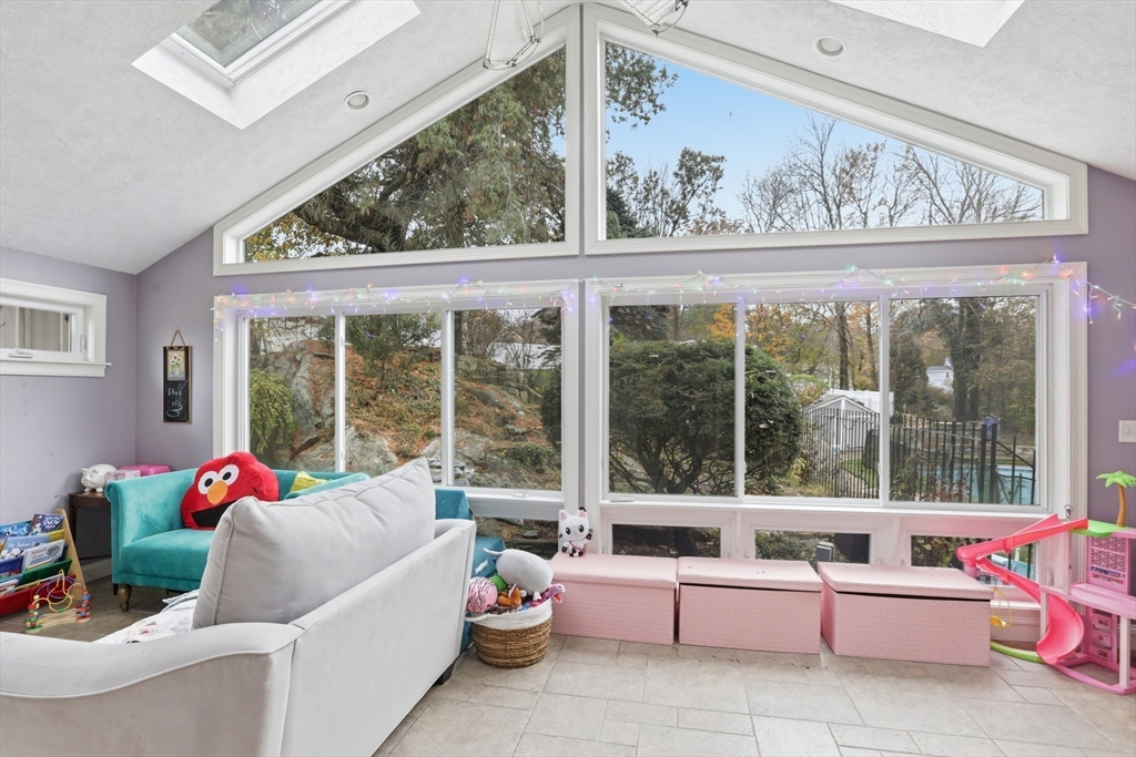 Welcome home to this picture-perfect 3-bedroom, 3-bath home that truly has it all! Step inside to find beautiful hardwood floors, a spacious family room with vaulted ceilings and a cozy wood-burning fireplace, and an eat-in kitchen perfect for family meals. The main level also offers a formal dining room, bright home office, and a half bath with laundry. A stunning sunroom overlooks your own backyard retreat — complete with a heated inground pool, relaxing spa, and covered patio with skylights, recessed lighting, and ceiling fans. Enjoy the cabana, playground, basketball court, chicken coop, and lush landscaping. Upstairs features three generous bedrooms, including a large primary suite with walk-in closet and private bath, plus a full hallway bath. The finished basement adds even more space for play, hobbies, or guests, and a two-car garage completes this beautiful home!