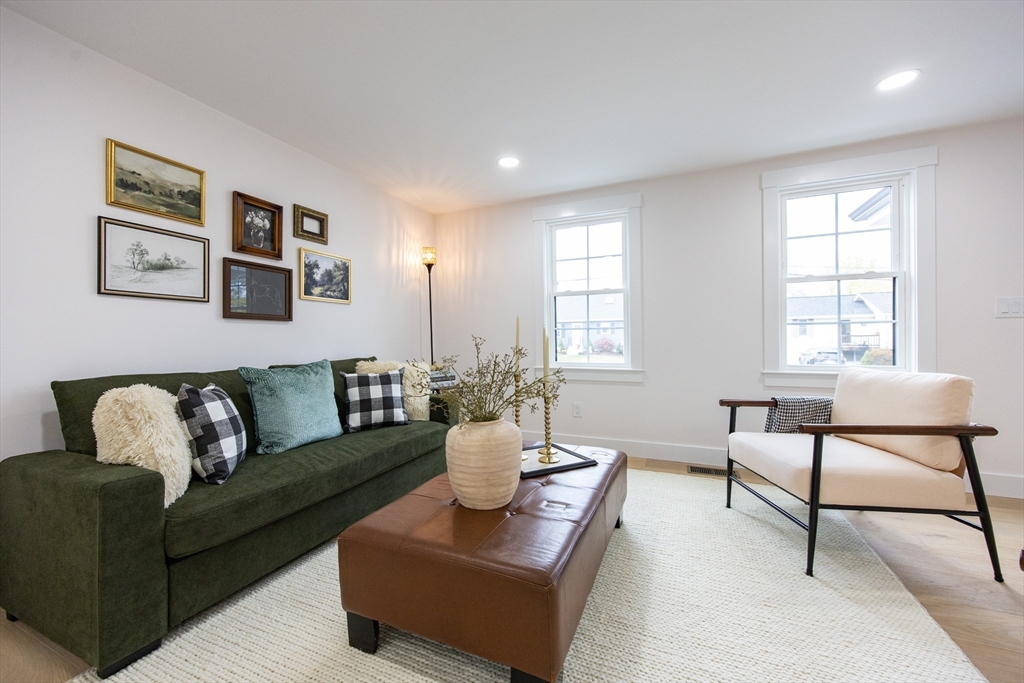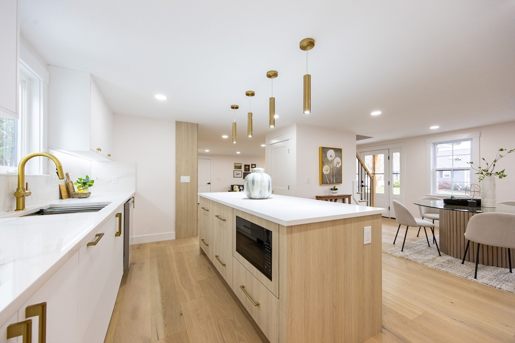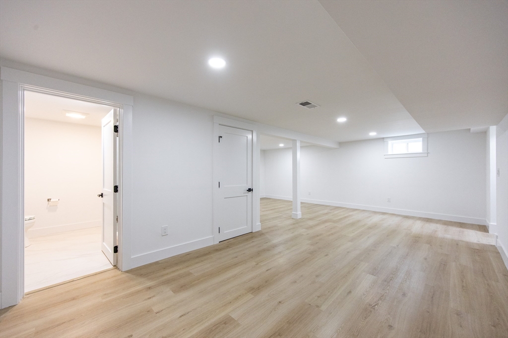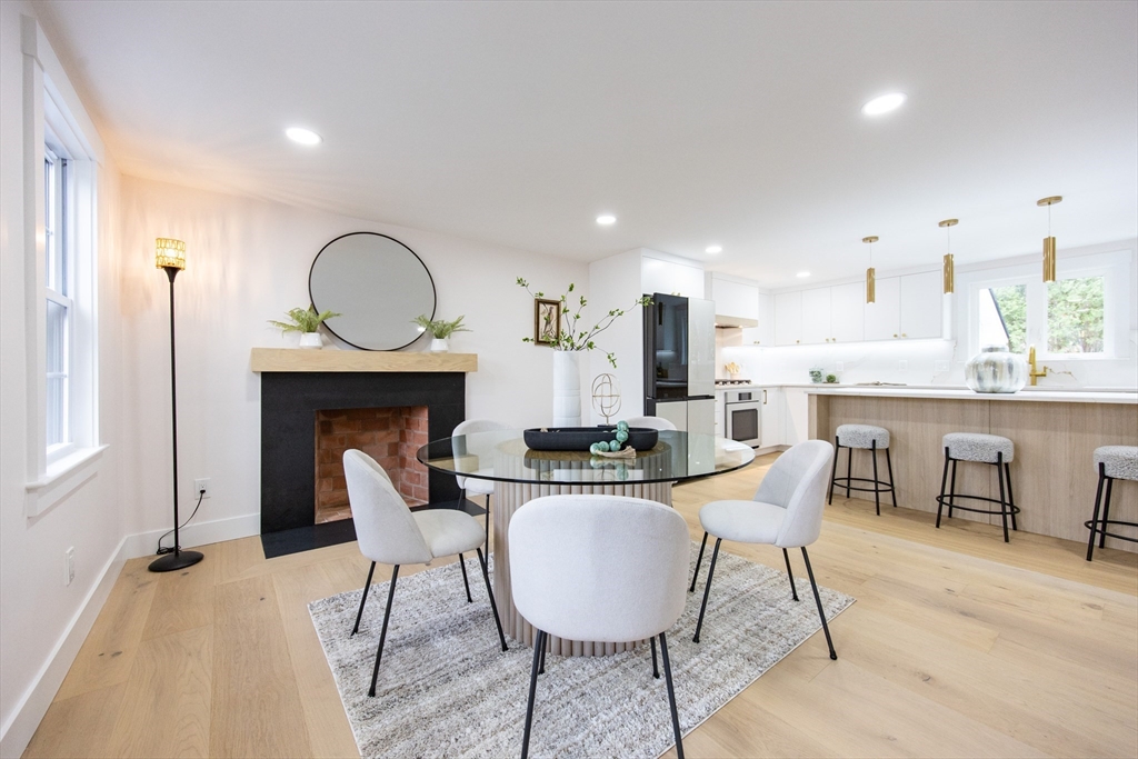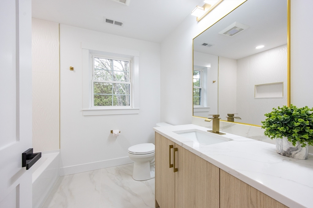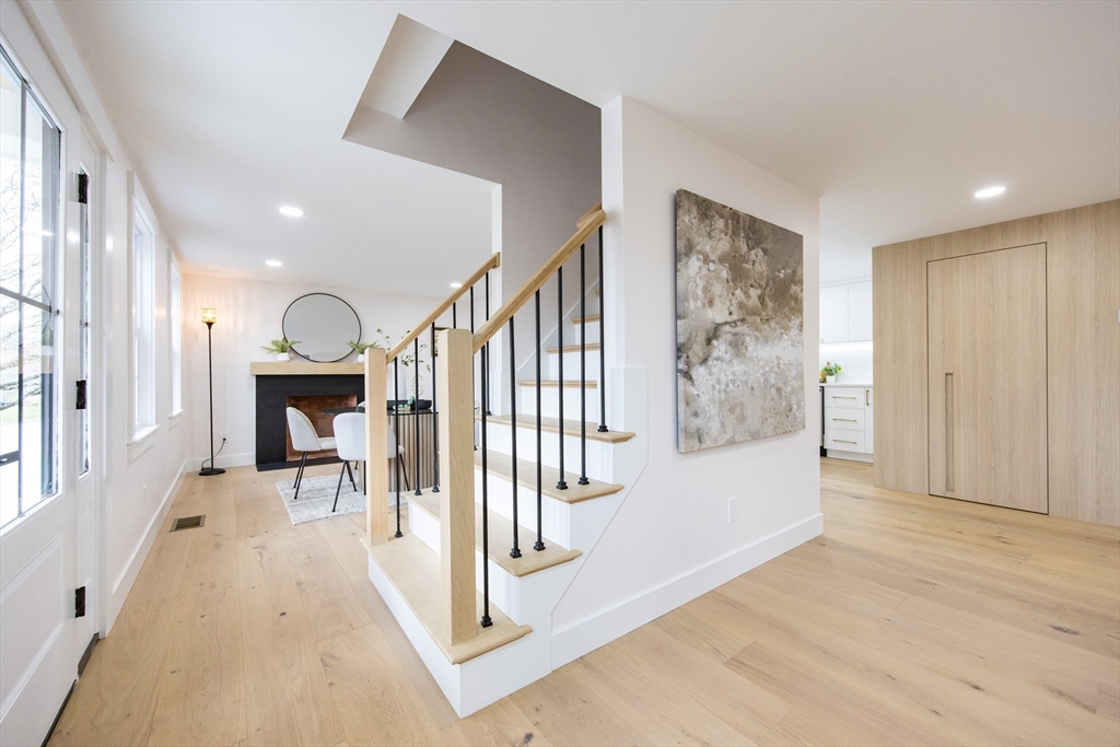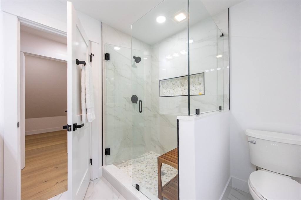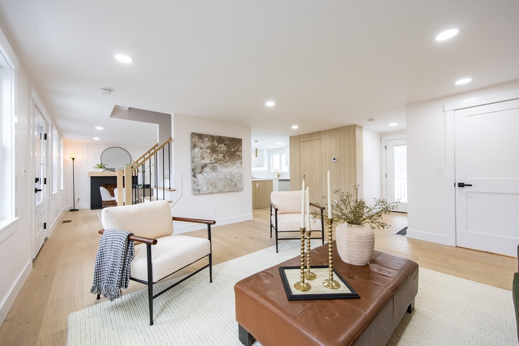Fully Renovated Colonial Farmhouse! This stunning 4-bedroom, 3.5-bath home has been completely rebuilt from the studs up, blending timeless farmhouse charm with modern design. The sun-filled, open-concept layout features engineered hardwood flooring and a spacious living room and dining room with a cozy wood-burning fireplace. The chef’s kitchen is cabinet-packed and showcases quartz countertops, a matching backsplash, and sleek modern appliances, plus a frameless door that leads to the pantry for additonal storage. Upstairs, the luxurious primary suite offers two expansive closets and a spa-like bath with a tiled stand-up shower. A full laundry room on the second floor adds convenience. All bedroom closets feature closet systems & lighting. The finished lower level includes a full bath and exterior access—perfect for a future ADU. Enjoy the fully vinyl-fenced yard ideal for pets and play. Every detail of this home has been thoughtfully designed for comfort, style, and functionality.