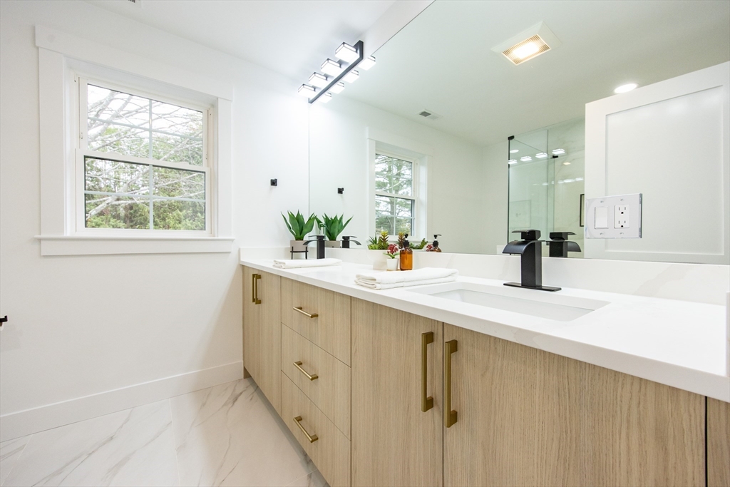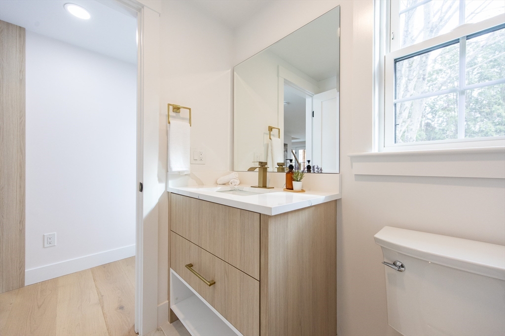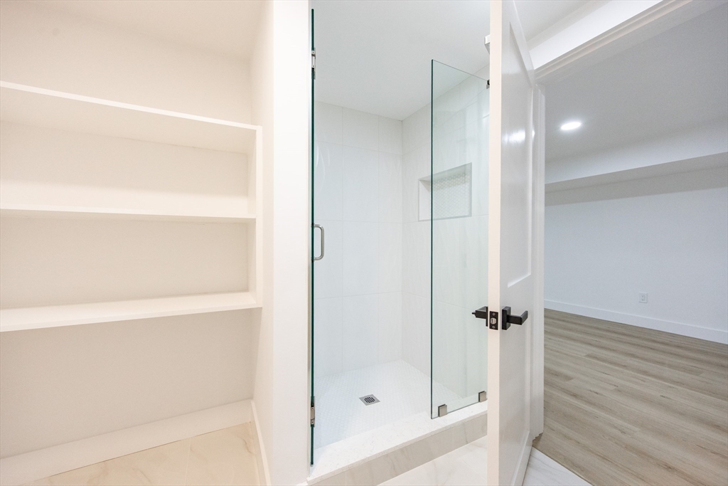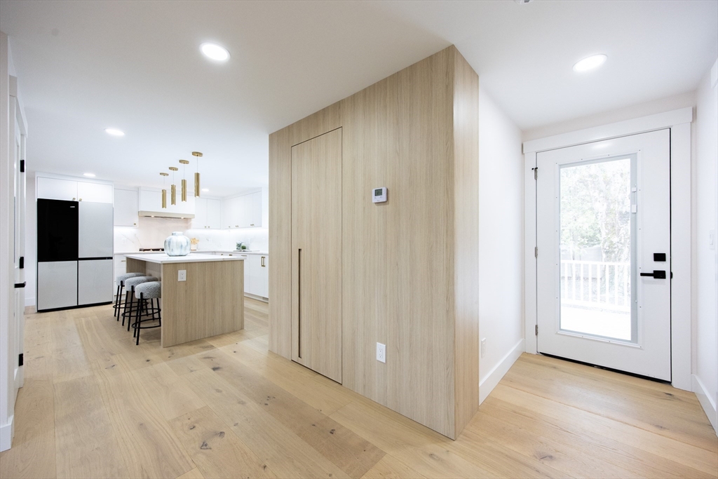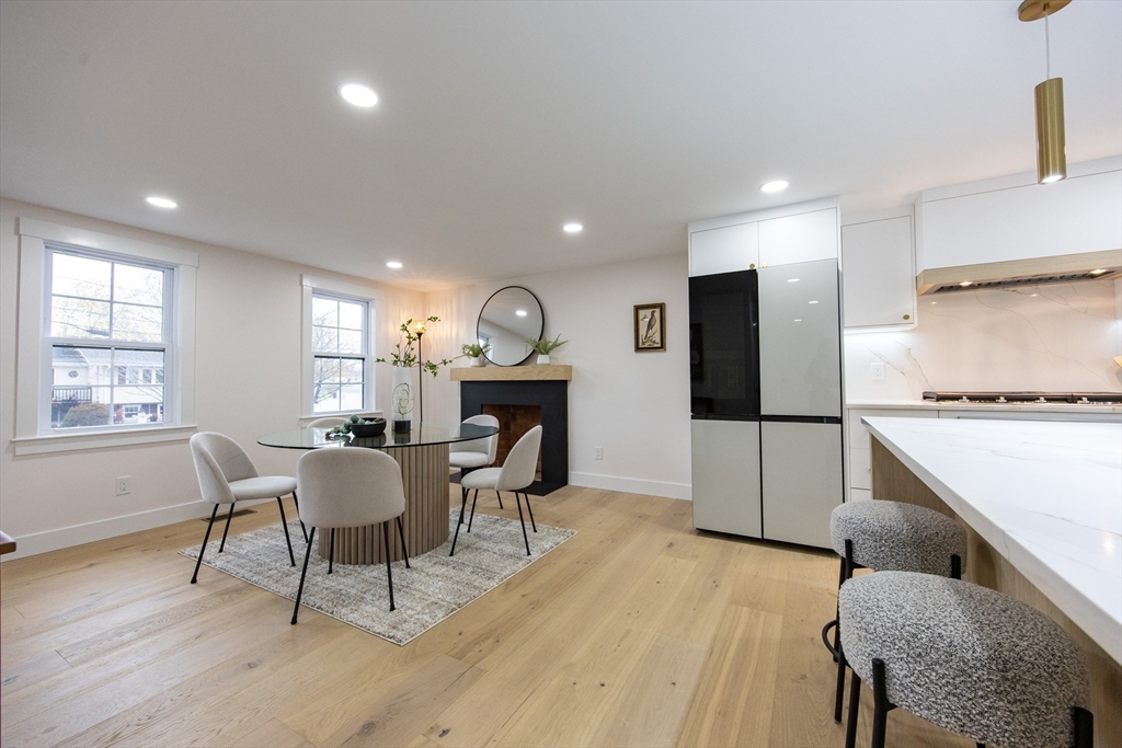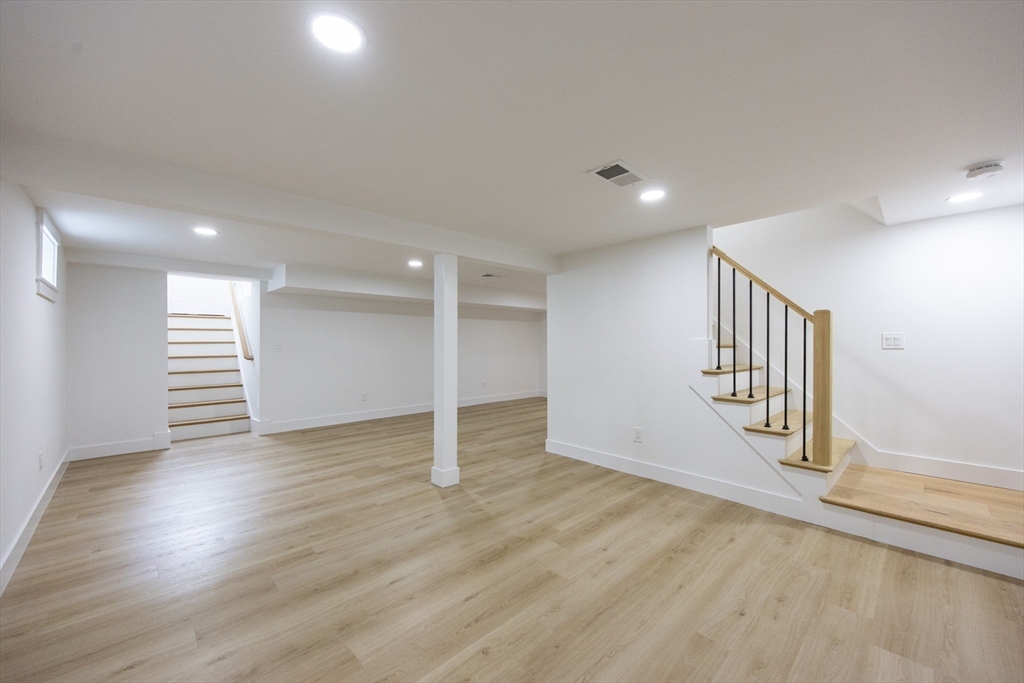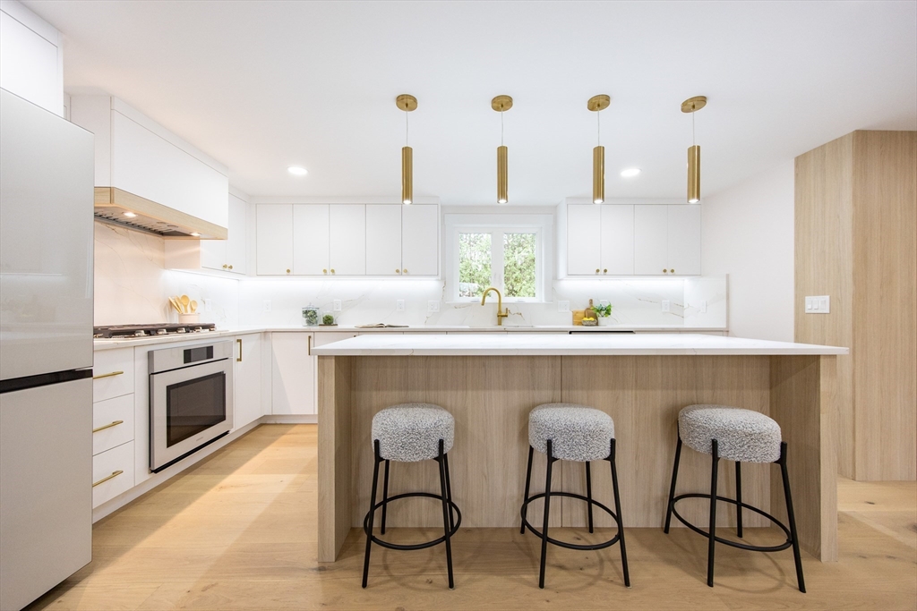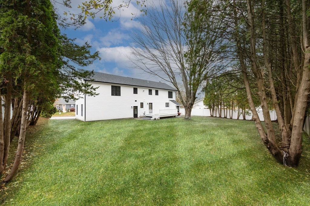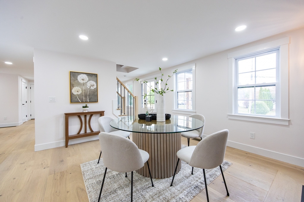 Fully Renovated Colonial Farmhouse! This stunning 4-bedroom, 3.5-bath home has been completely rebuilt from the studs up, blending timeless farmhouse charm with modern design. The sun-filled, open-concept layout features engineered hardwood flooring and a spacious living room and dining room with a cozy wood-burning fireplace. The chef’s kitchen is cabinet-packed and showcases quartz countertops, a matching backsplash, and sleek modern appliances, plus a frameless door that leads to the pantry for additonal storage. Upstairs, the luxurious primary suite offers two expansive closets and a spa-like bath with a tiled stand-up shower. A full laundry room on the second floor adds convenience. All bedroom closets feature closet systems & lighting. The finished lower level includes a full bath and exterior access—perfect for a future ADU. Enjoy the fully vinyl-fenced yard ideal for pets and play. Every detail of this home has been thoughtfully designed for comfort, style, and functionality.