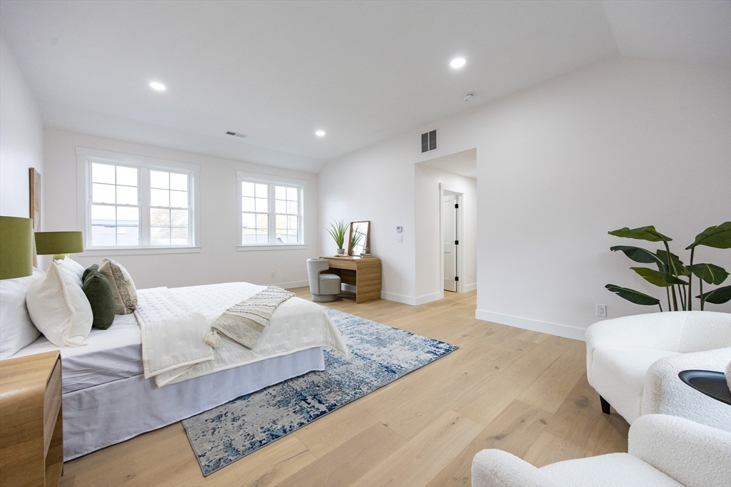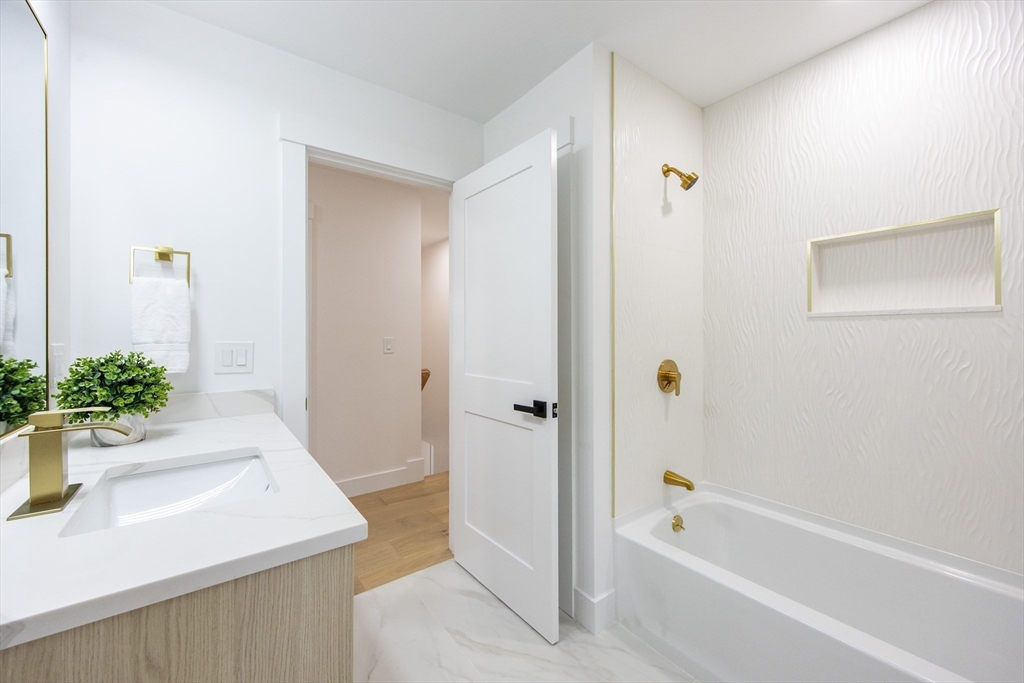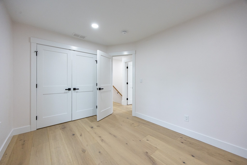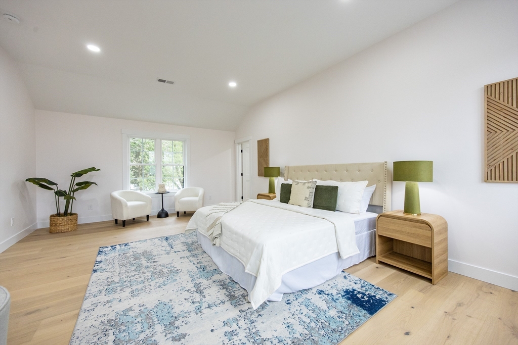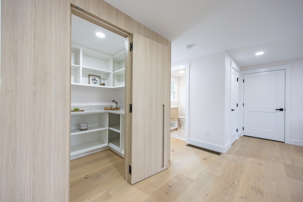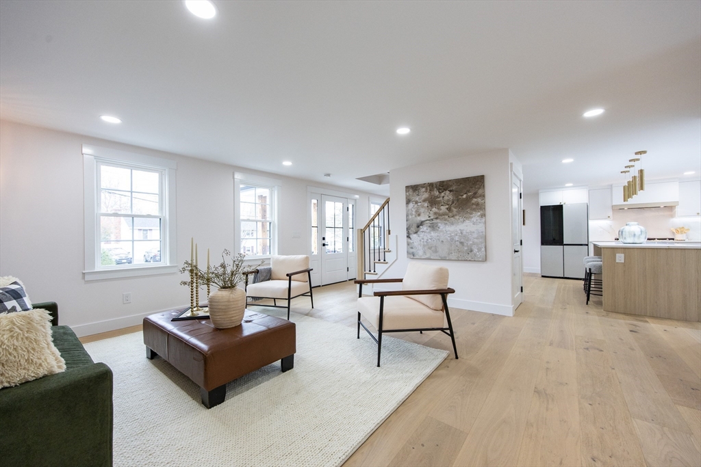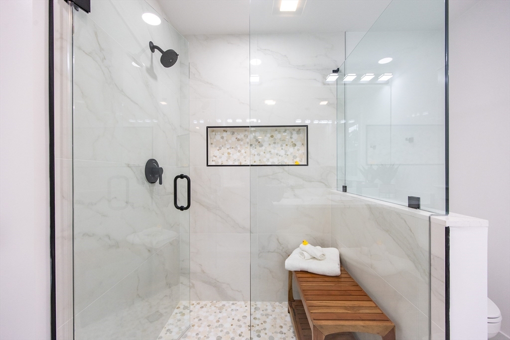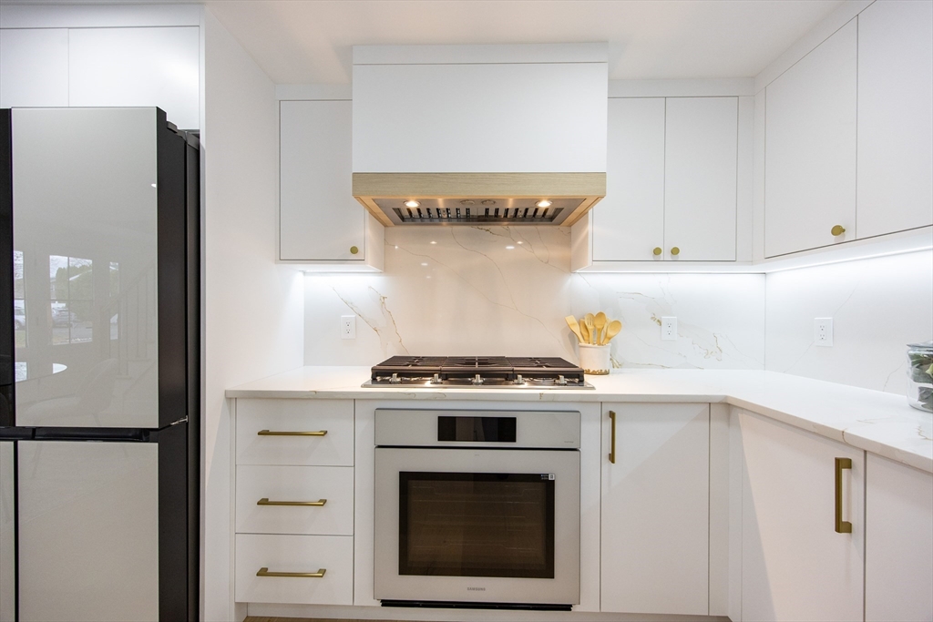 Fully Renovated Colonial Farmhouse! This stunning 4-bedroom, 3.5-bath home has been completely rebuilt from the studs up, blending timeless farmhouse charm with modern design. The sun-filled, open-concept layout features engineered hardwood flooring and a spacious living room and dining room with a cozy wood-burning fireplace. The chef’s kitchen is cabinet-packed and showcases quartz countertops, a matching backsplash, and sleek modern appliances, plus a frameless door that leads to the pantry for additonal storage. Upstairs, the luxurious primary suite offers two expansive closets and a spa-like bath with a tiled stand-up shower. A full laundry room on the second floor adds convenience. All bedroom closets feature closet systems & lighting. The finished lower level includes a full bath and exterior access—perfect for a future ADU. Enjoy the fully vinyl-fenced yard ideal for pets and play. Every detail of this home has been thoughtfully designed for comfort, style, and functionality.