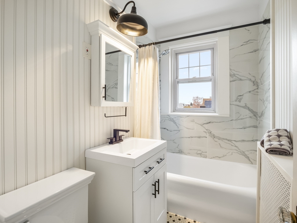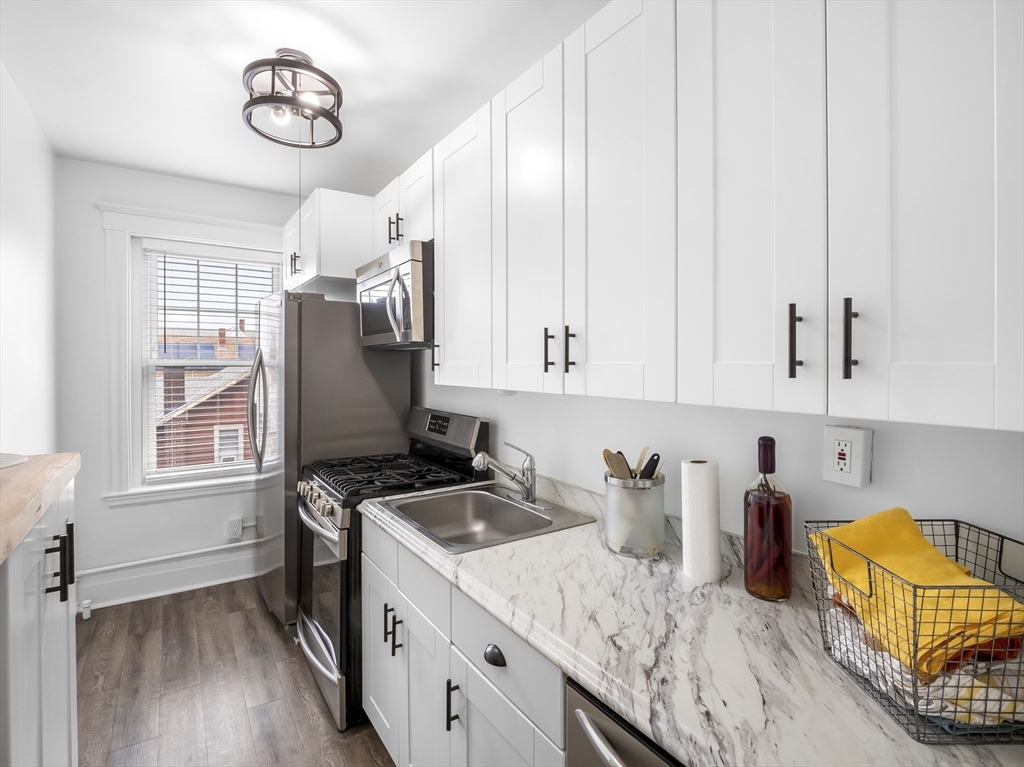 A perfect opportunity to own a modern and inviting one-bedroom condo in Everett! Why pay rent when you can own this beautiful third-floor unit, featuring a spacious layout with modern finishes throughout. A beautiful kitchen includes a gas stove, microwave, dishwasher, refrigerator with water & ice maker, breakfast bar, and sleek cabinetry. The open living room offers plenty of space for both lounging and a dining area. Hardwood floors, with vinyl in the kitchen and tile in the bath. The full bathroom features a tiled shower and tub. A generously sized bedroom offers two closets, plus an additional coat and linen closet for extra storage. Coin-operated laundry is available in the basement. Conveniently located near Boston, Charlestown, Cambridge, Medford, and Revere—just minutes to Encore Casino, shops, restaurants, grocery stores, and public transportation, including bus routes and the Malden T Station.