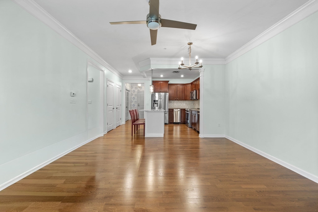 Welcome to Woodstone Crossing in the sought-after Union Point community! This stunning second-floor one-bedroom condo (with bonus space) perfectly blends comfort, style, and convenience. The upgraded kitchen features granite countertops, tiled backsplash, center island, wine fridge, glass pendants, stainless steel appliances, pantry, and crown molding. The open living area includes a custom ethanol fireplace with built-ins and a dining nook with chandelier — ideal for both relaxing and entertaining. The versatile bonus room makes a great home office, gym, or flex space. The spacious primary suite offers a walk-in closet and an updated bath with designer finishes. Enjoy your morning coffee or evening glass of wine on the private balcony overlooking peaceful views of nature. Additional highlights include 9-foot ceilings, in-unit laundry with storage, two parking spots, and a professionally managed building near the commuter rail and major highways. Come see all Union Point has to offer!