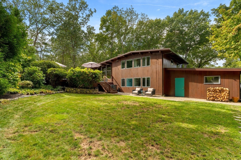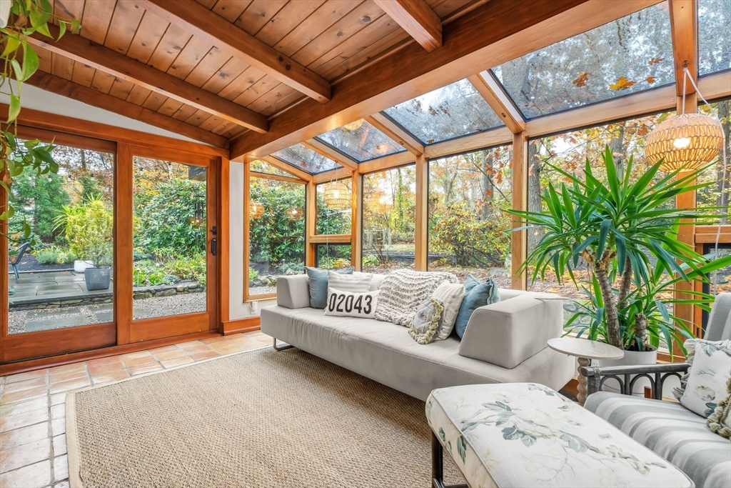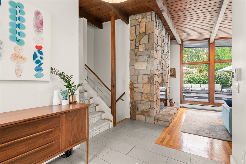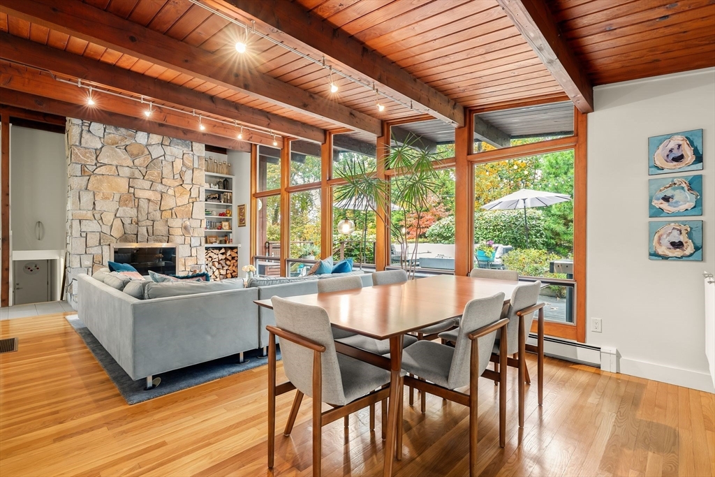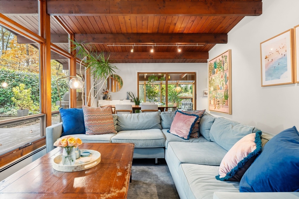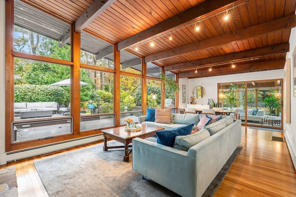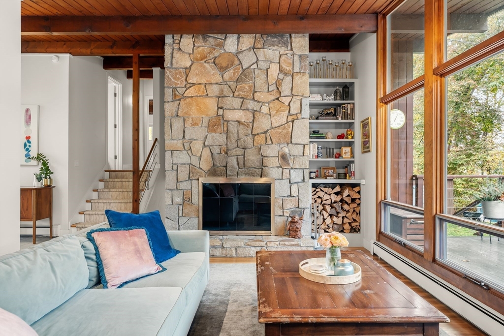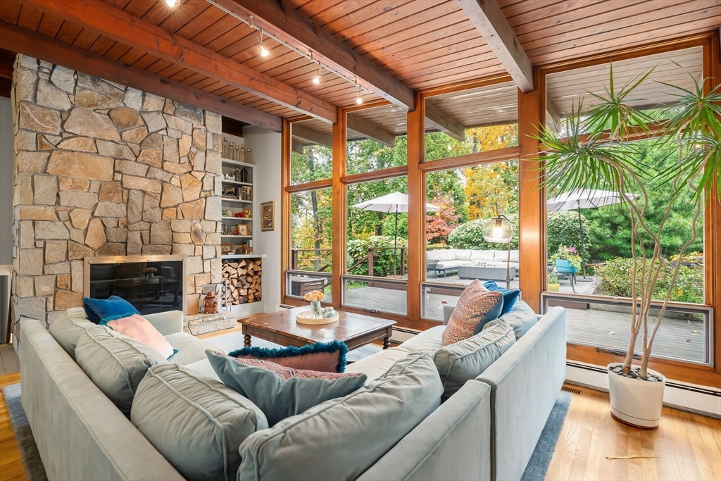 Stunning Mid-Century Modern Deck House set on over an acre in Hingham’s coveted Rockwood neighborhood. This architecturally distinctive home features vaulted wood-beamed ceilings, floor-to-ceiling stone fireplace, and a striking wall of windows overlooking a private deck and lush gardens. The gourmet Faneuil custom kitchen offers high-end appliances, induction cooktop and eat-in dining space opening to a window encompassed 3-season sunroom. The upper level includes a primary suite with an oversized closet and a spa-like bath featuring radiant floors, a soaking tub, and a newly updated walk-in shower. A versatile sitting room and office provide options for a workspace, playroom, or guest room. The lower level offers two add'l bedrooms, a full bath with radiant floors, an oversized laundry room, and access to the two-car garage. Recent updates include a new roof and AC (2021). Ideally located just minutes from Hingham Center, the harbor, downtown, library, and East School.