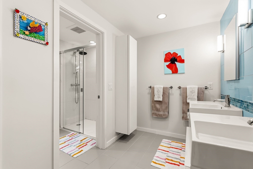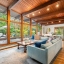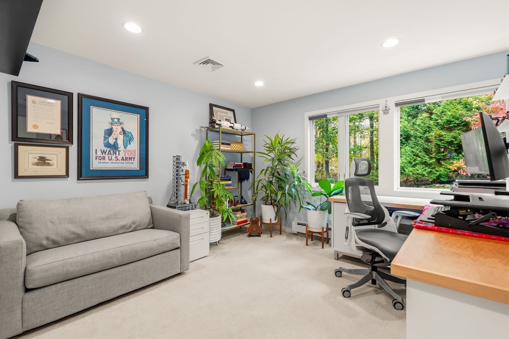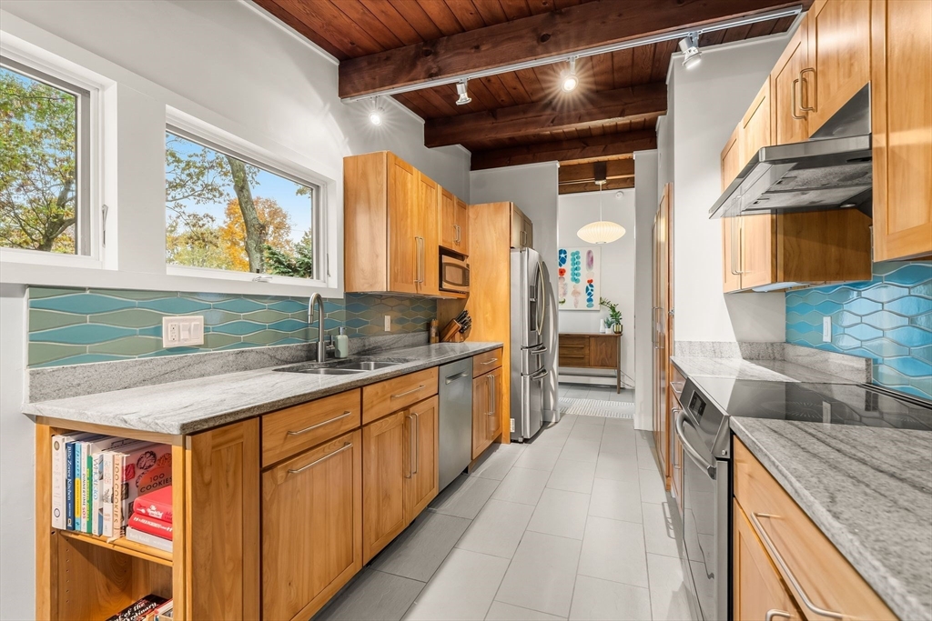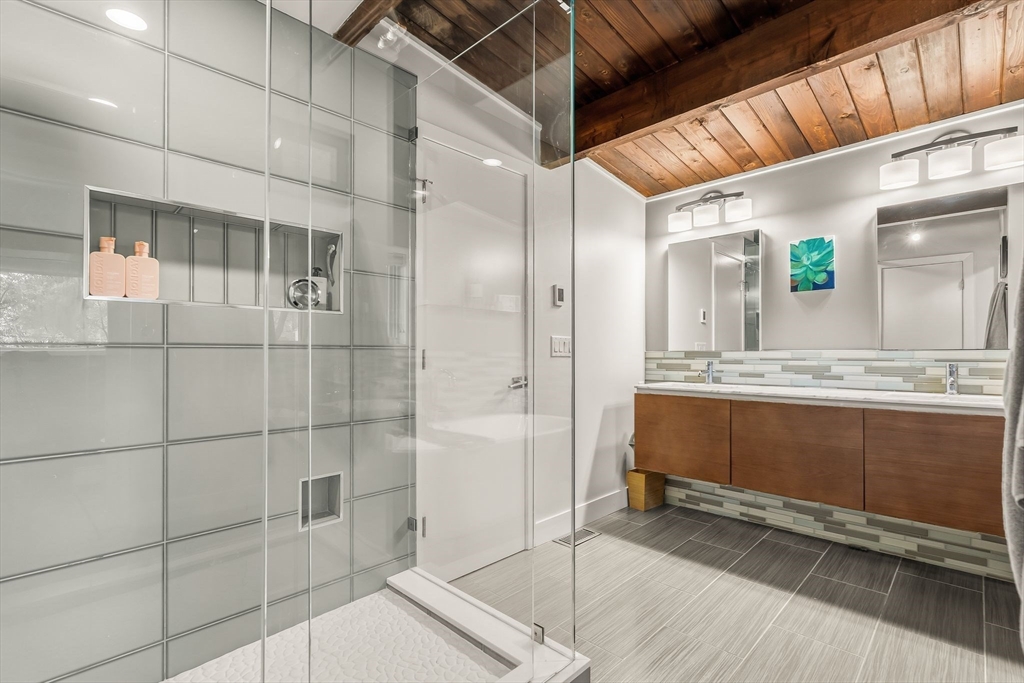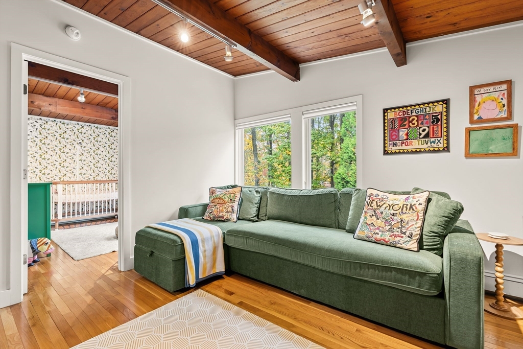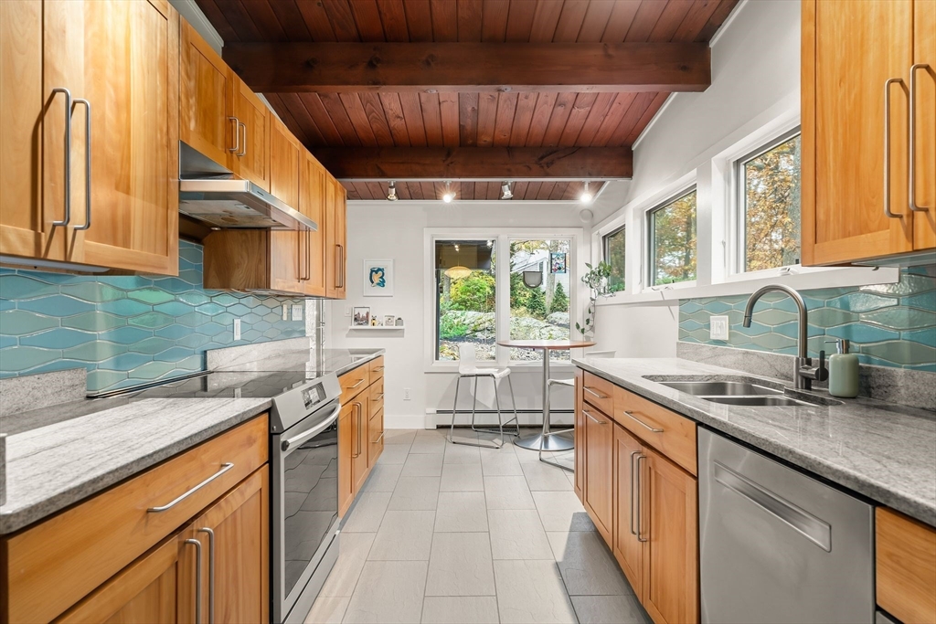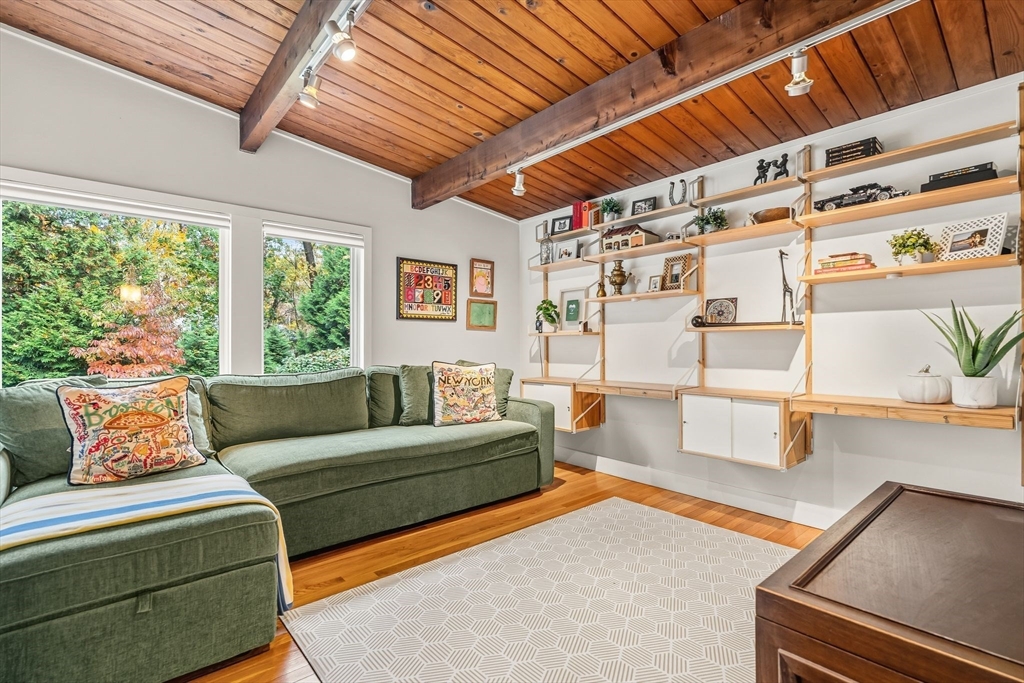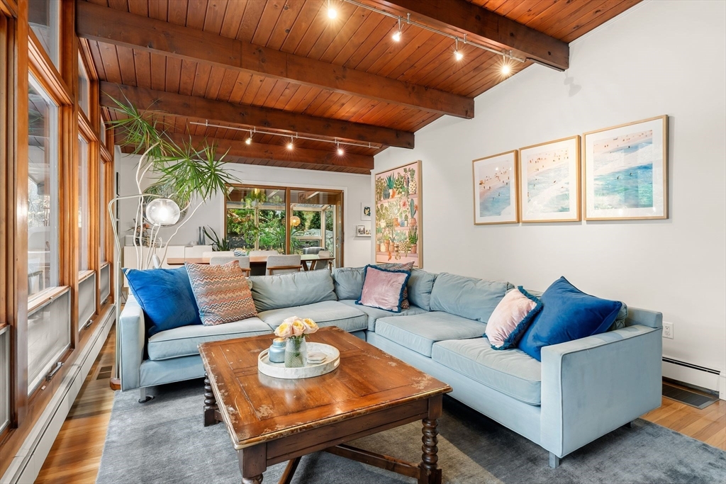 Stunning Mid-Century Modern Deck House set on over an acre in Hingham’s coveted Rockwood neighborhood. This architecturally distinctive home features vaulted wood-beamed ceilings, floor-to-ceiling stone fireplace, and a striking wall of windows overlooking a private deck and lush gardens. The gourmet Faneuil custom kitchen offers high-end appliances, induction cooktop and eat-in dining space opening to a window encompassed 3-season sunroom. The upper level includes a primary suite with an oversized closet and a spa-like bath featuring radiant floors, a soaking tub, and a newly updated walk-in shower. A versatile sitting room and office provide options for a workspace, playroom, or guest room. The lower level offers two add'l bedrooms, a full bath with radiant floors, an oversized laundry room, and access to the two-car garage. Recent updates include a new roof and AC (2021). Ideally located just minutes from Hingham Center, the harbor, downtown, library, and East School.