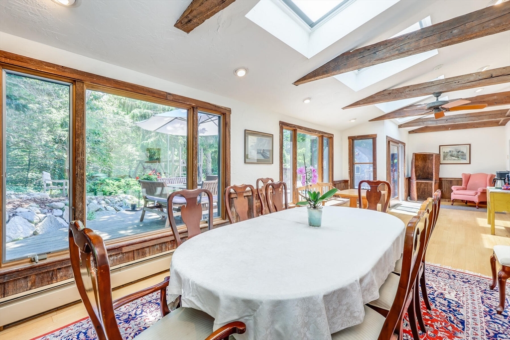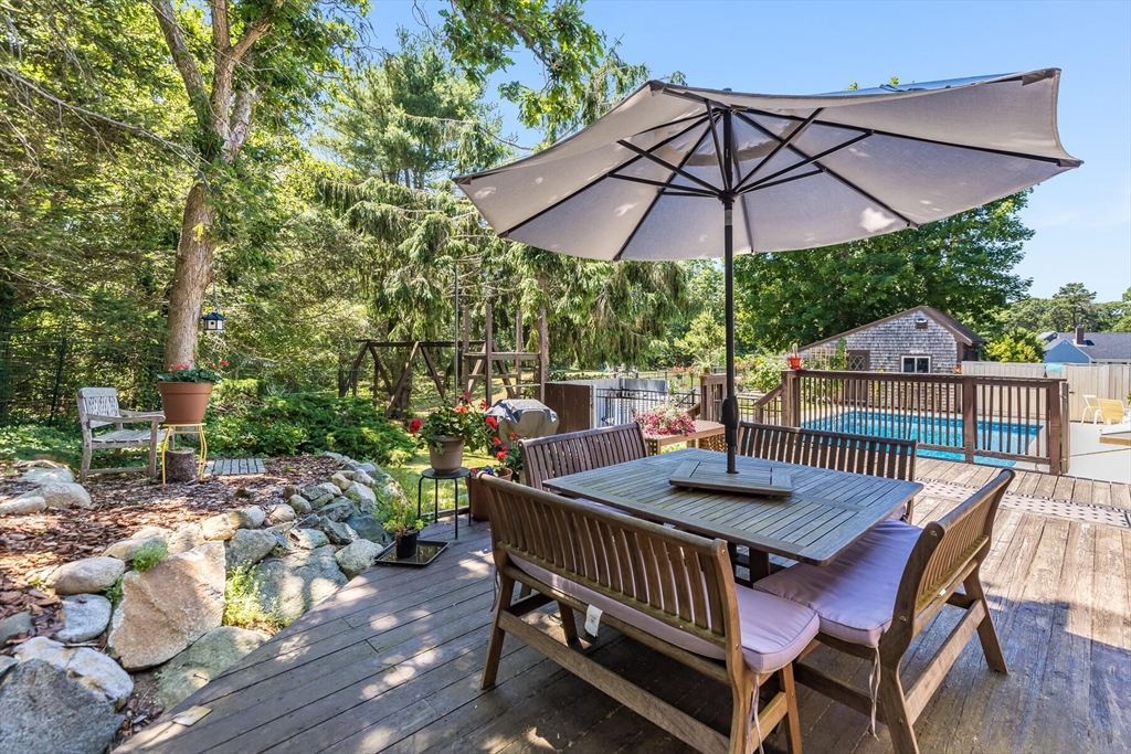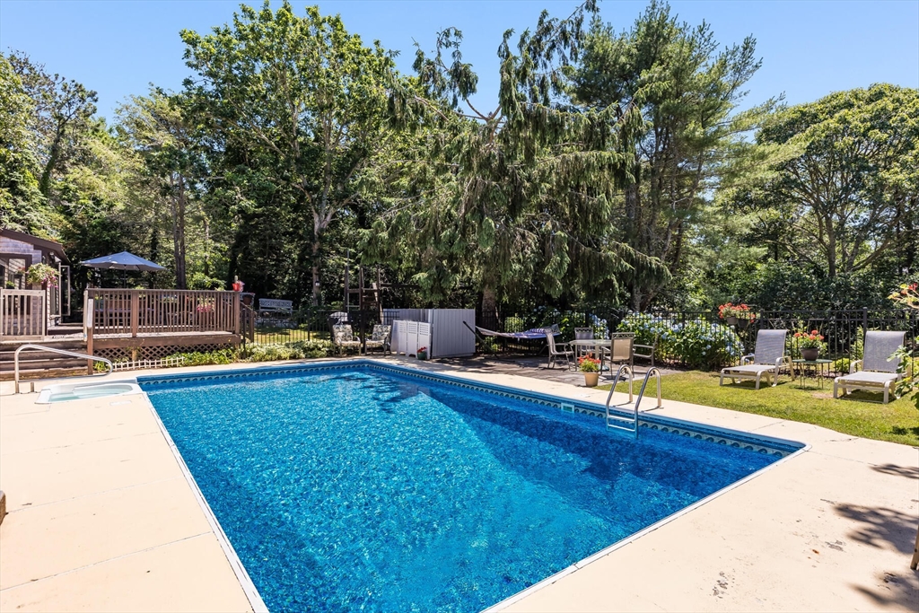 Discover this exceptional five-bedroom, six-full-bath residence perfectly situated on a large corner lot at the beginning of a desirable private neighborhood. Encompassing nearly an acre of lush plantings, mature trees, and beautifully landscaped gardens, this property offers privacy and comfort. Step inside to a thoughtfully designed floor plan featuring a first-floor primary suite, dedicated home office, and an inviting family room with a wood-burning fireplace and cathedral ceilings with an open-concept kitchen ideal for entertaining. Enjoy the best of indoor-outdoor living with a large salt water pool, expansive stone patio, and beautiful grounds, complete with a pool house and potting shed. Further amenities include an attached two-car garage, ample parking, finished lower level with a workshop, home gym, and abundant storage space. Multiple updates include a new heating system, roof, decking, shingles and trim. Located moments from downtown Harwich Port and Bank Street Beach.