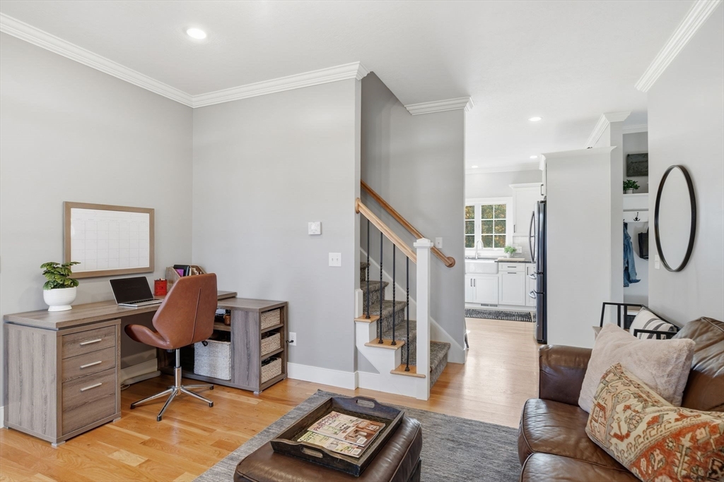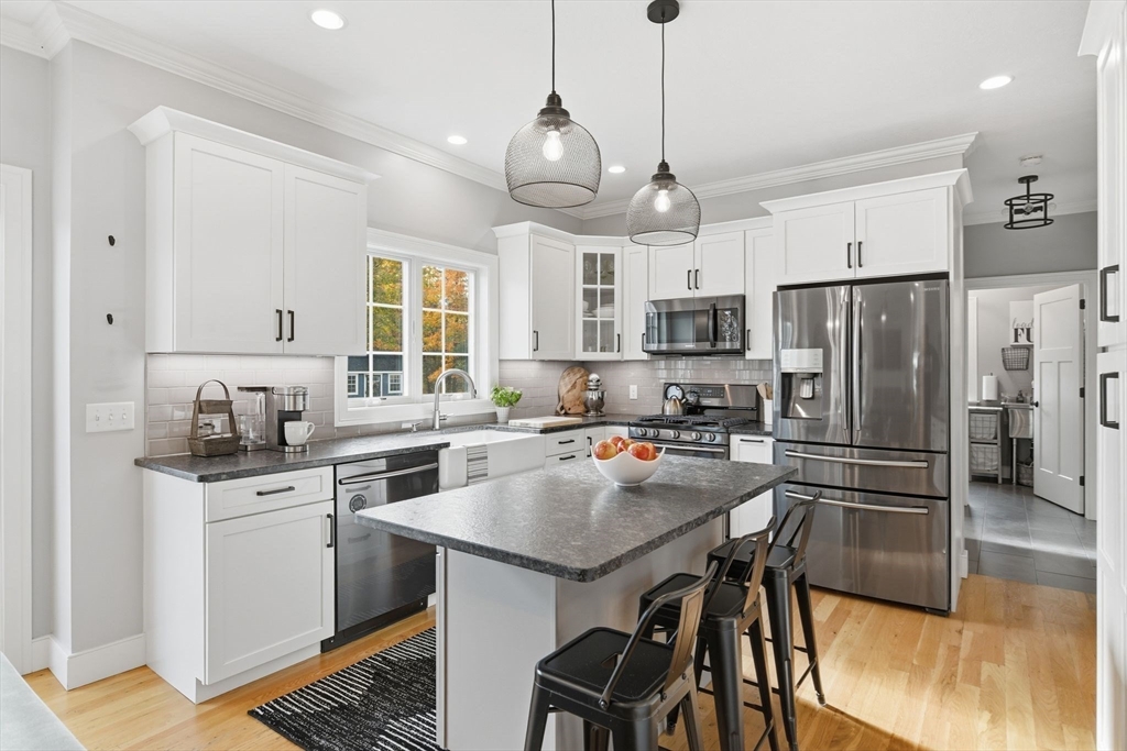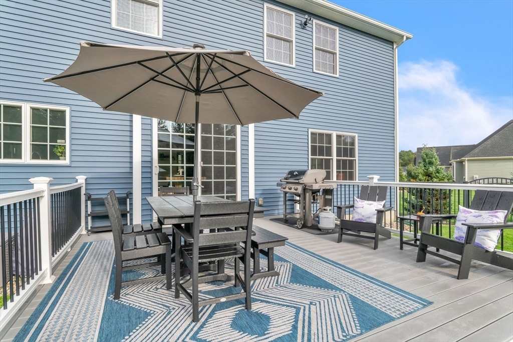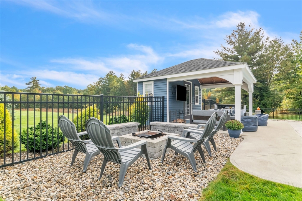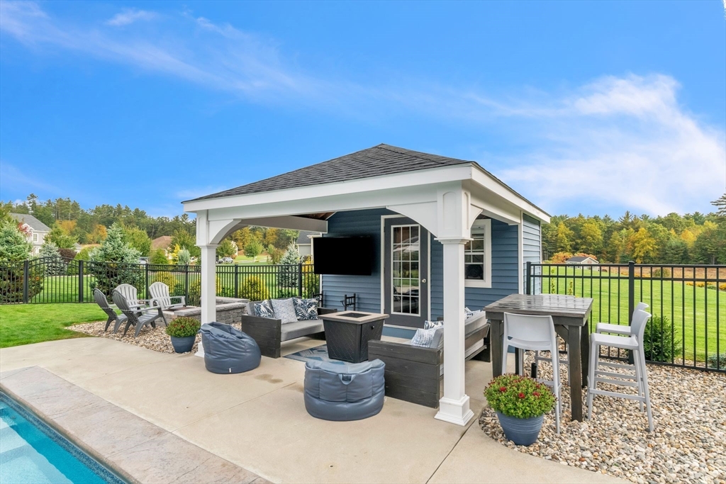 Tucked at the edge of the woods on over an acre of landscaped beauty, this 4-bedroom, 2.5-bath colonial offers the perfect blend of classic charm and modern ease. A heated in-ground pool anchors the backyard oasis—complete with sitting wall, fire pit, and fully outfitted pool house with half bath, fridge, and changing area. Inside, 9’ ceilings, hardwood floors, and abundant natural light create an open, airy flow. The cook’s kitchen features a leathered granite island, stainless appliances, and easy access to the composite deck overlooking the private grounds. In the living room, built-ins and window seats frame a cozy gas fireplace. Upstairs, the main suite impresses with a tray ceiling, double vanity, and walk-in closet. A thoughtful mudroom and immaculate garage add everyday function. Just eight years young, this serene retreat offers timeless design, effortless entertaining, and proximity to every convenience.