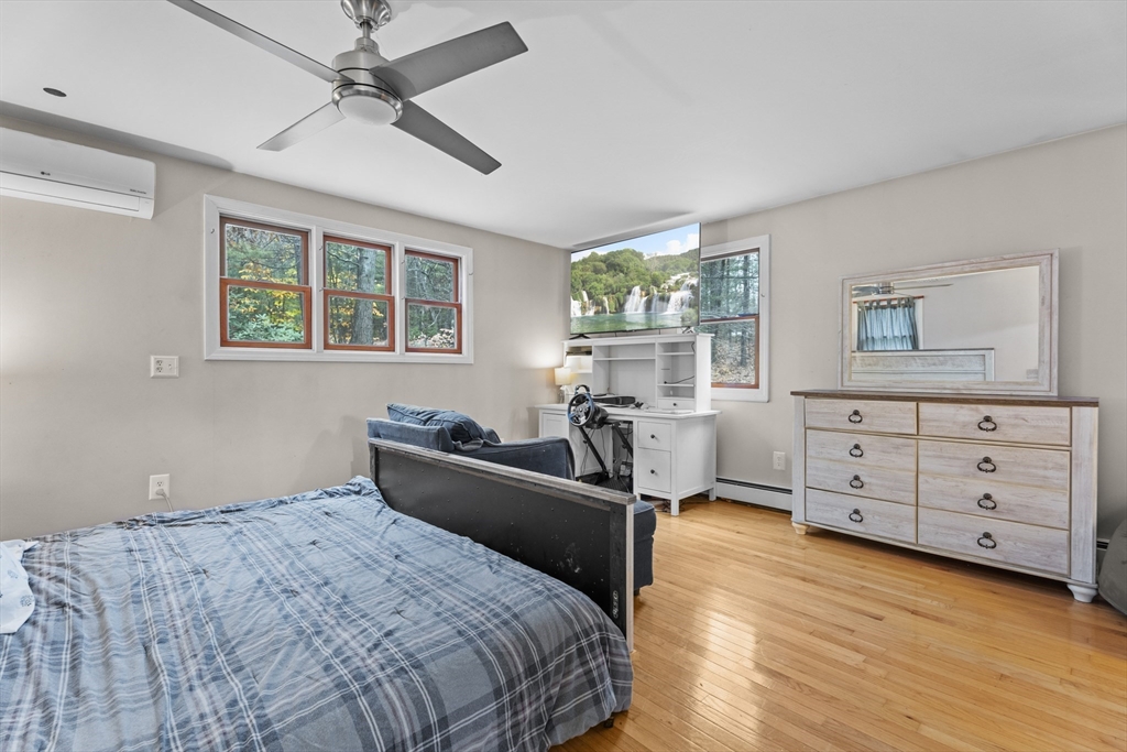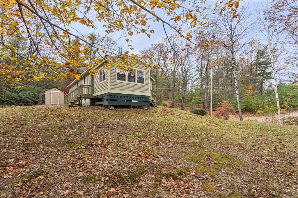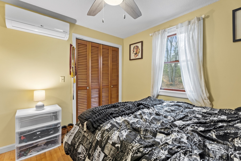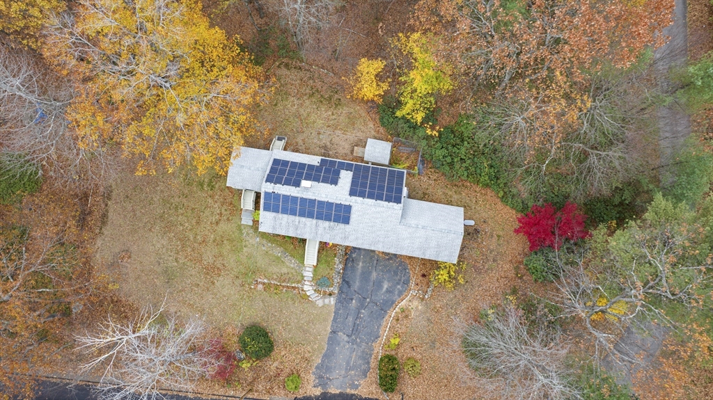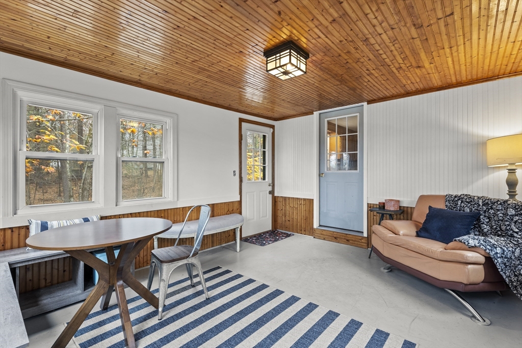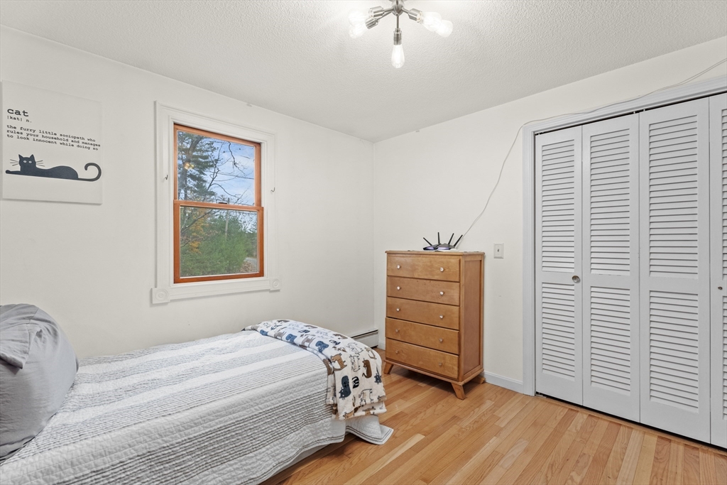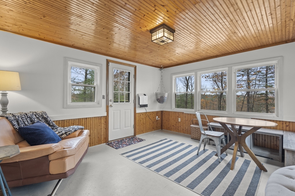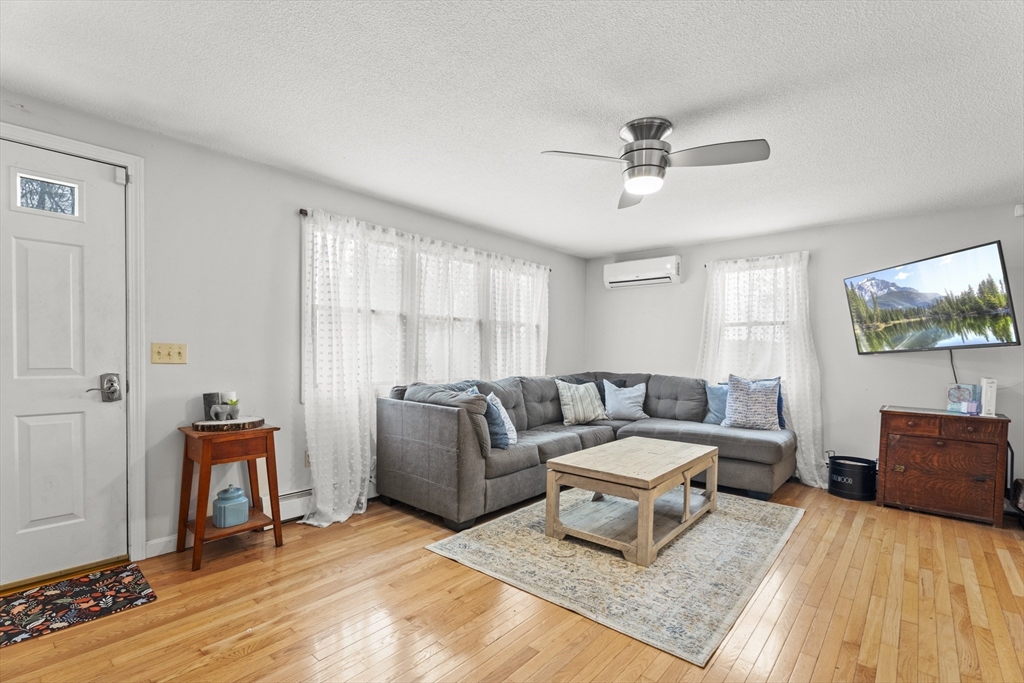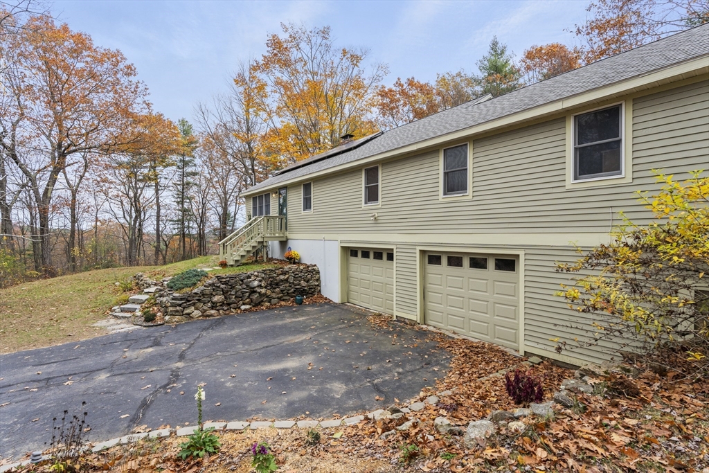 Spacious 3 bed 1 bath ranch with a private .78 acres, 2 car garage, & many updates! Single level living or utilize the partially finished basement area, flexible layout provides options with both levels. Enter into a spacious living room w/ cozy wood stove & oversized entry to kitchen area - beyond that is a heated three season room perfect for all the New England seasons, w/ exterior access. Hardwood floors thru living area & bedrooms all w/ great closet space. Ample sized bathroom w/ first floor laundry & double vanity. Primary bedroom has additional 8x8 office/closet/flex space. Partially finished basement can be used for additional living space & connects directly to left side garage stall, right side garage stall is accessed via exterior door. Commuter location w/ the MBTA, Route 2, 2A, 31, & 140 all just minutes away, tucked away but still close to local amenities. Roof 6 years old, solar (2020), electrical panel (2018), new water tank, new mini splits heat/ac (2025).