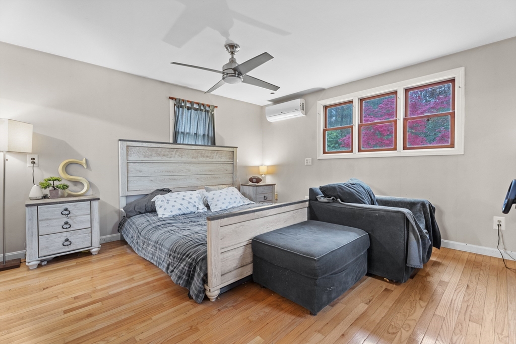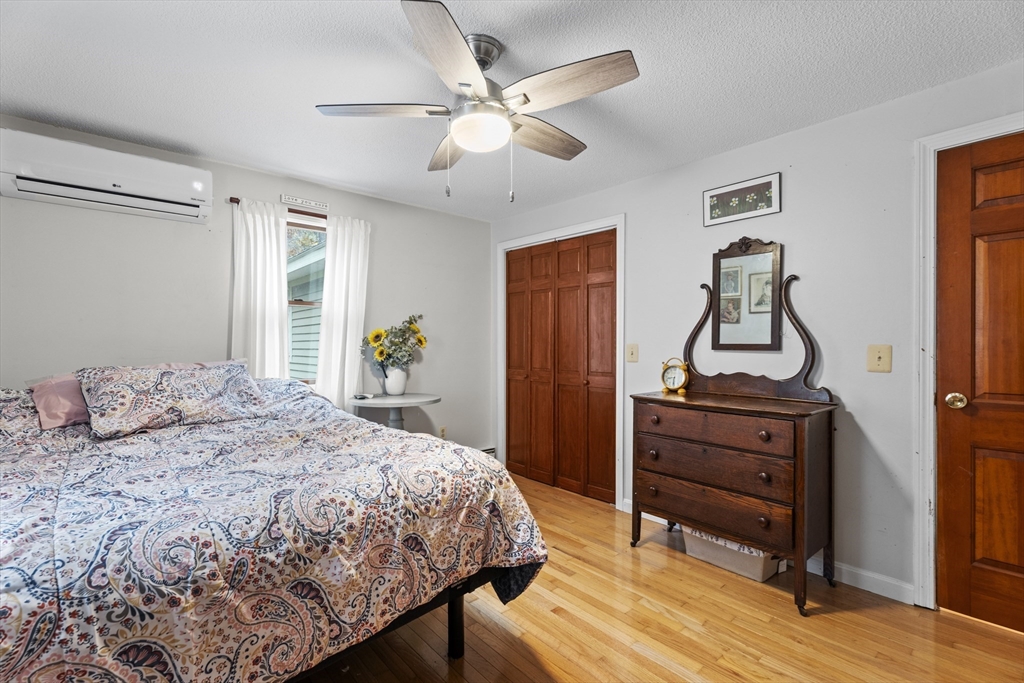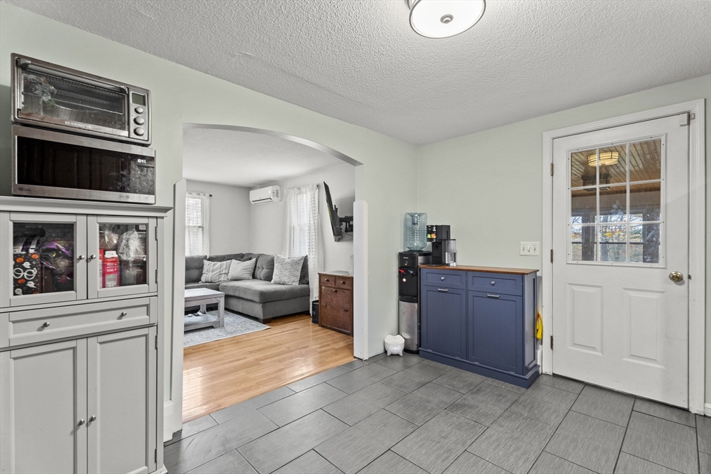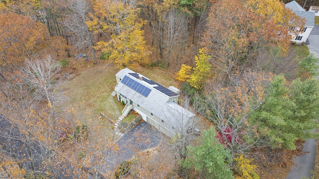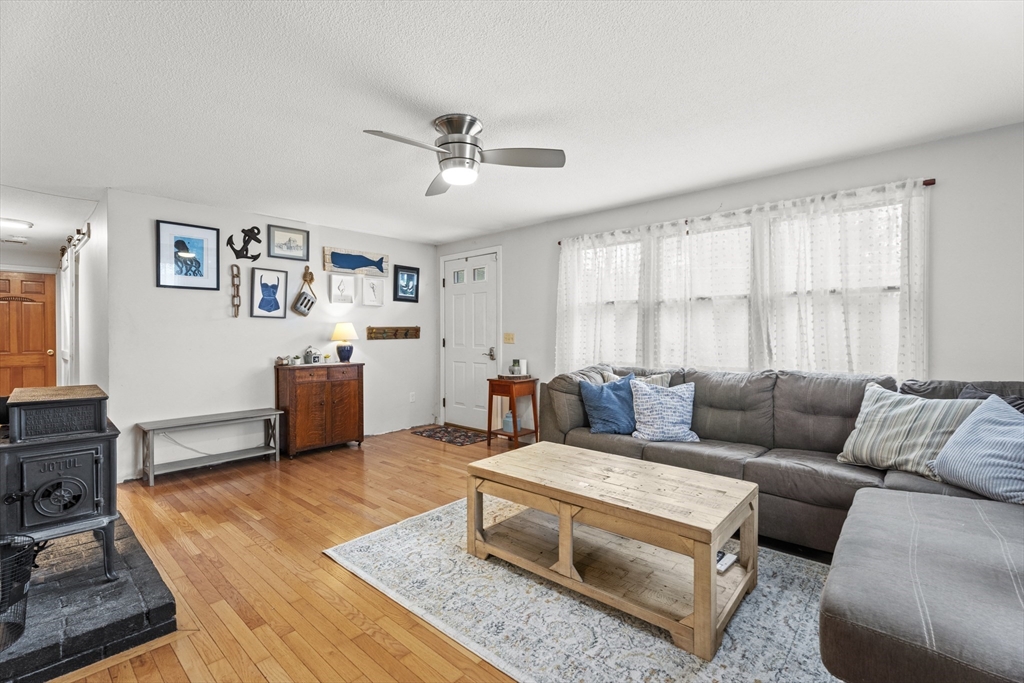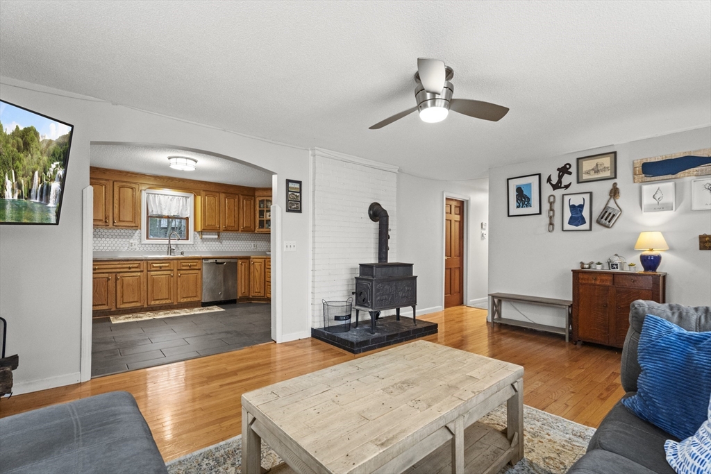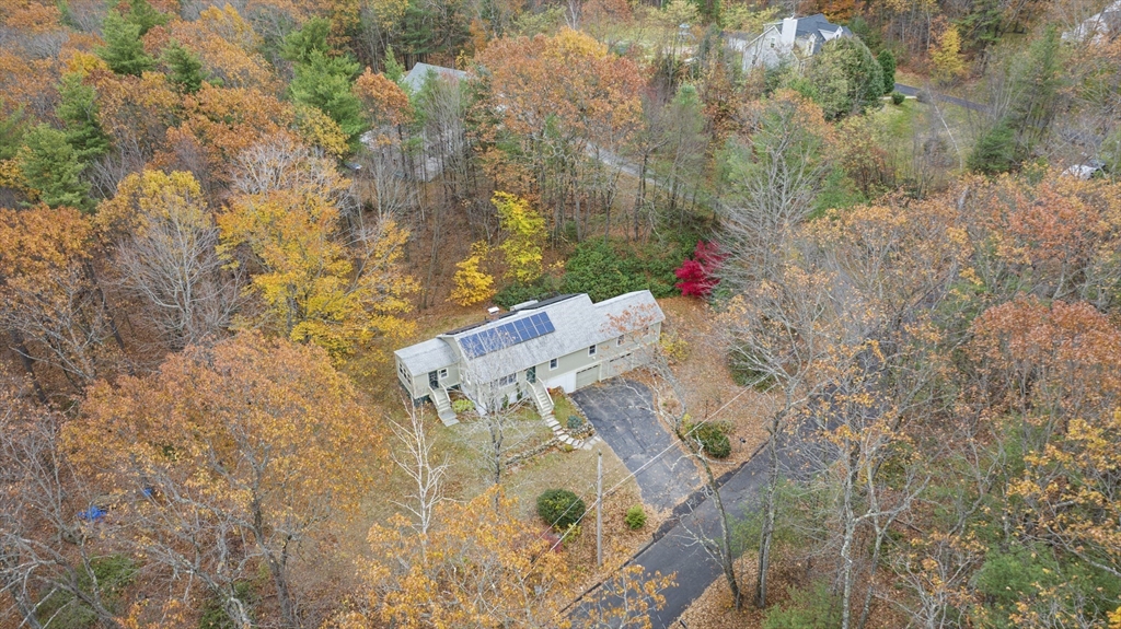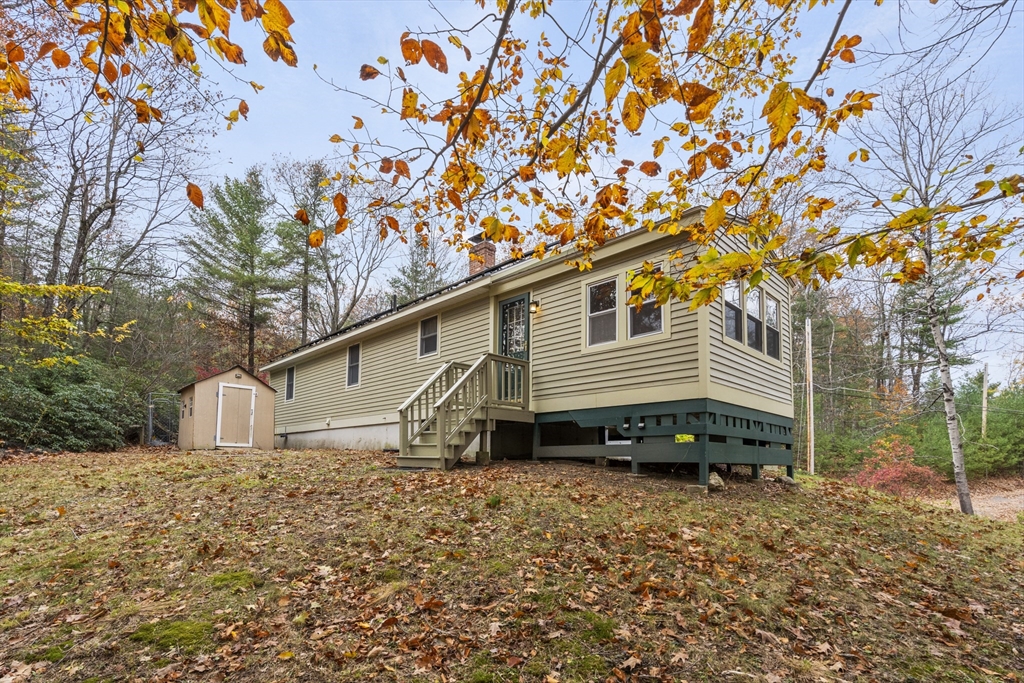 Spacious 3 bed 1 bath ranch with a private .78 acres, 2 car garage, & many updates! Single level living or utilize the partially finished basement area, flexible layout provides options with both levels. Enter into a spacious living room w/ cozy wood stove & oversized entry to kitchen area - beyond that is a heated three season room perfect for all the New England seasons, w/ exterior access. Hardwood floors thru living area & bedrooms all w/ great closet space. Ample sized bathroom w/ first floor laundry & double vanity. Primary bedroom has additional 8x8 office/closet/flex space. Partially finished basement can be used for additional living space & connects directly to left side garage stall, right side garage stall is accessed via exterior door. Commuter location w/ the MBTA, Route 2, 2A, 31, & 140 all just minutes away, tucked away but still close to local amenities. Roof 6 years old, solar (2020), electrical panel (2018), new water tank, new mini splits heat/ac (2025).