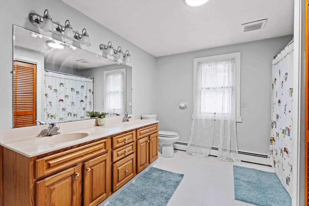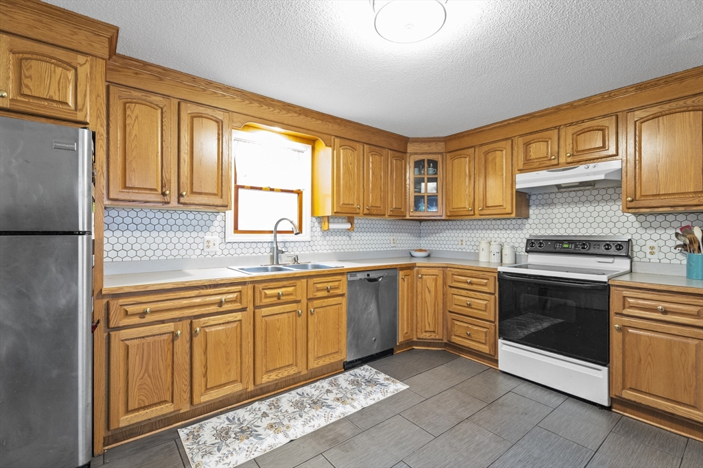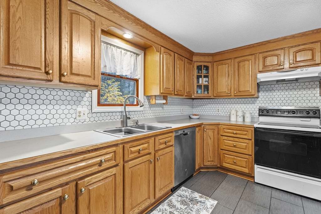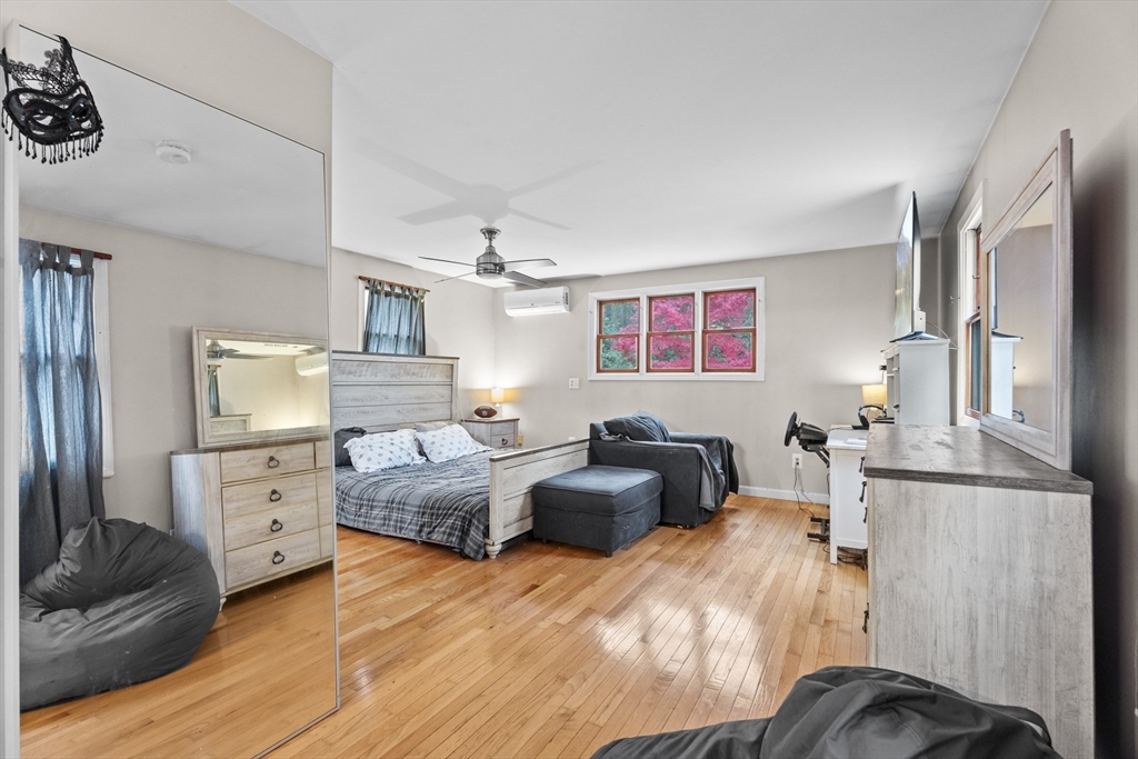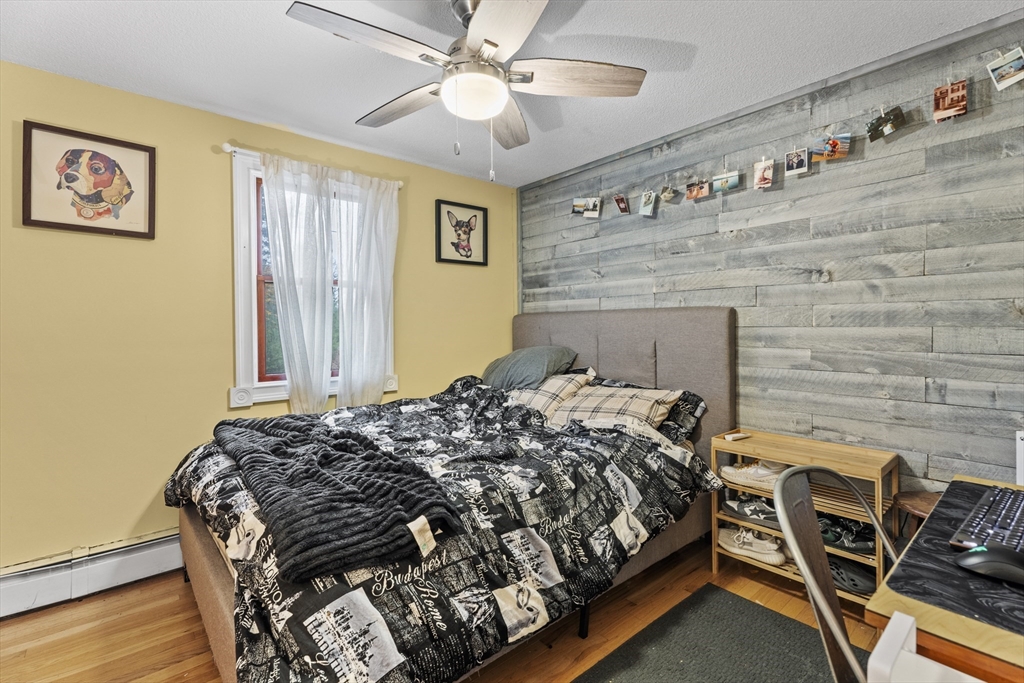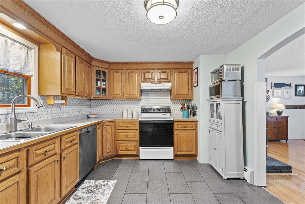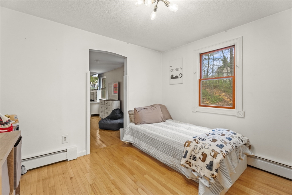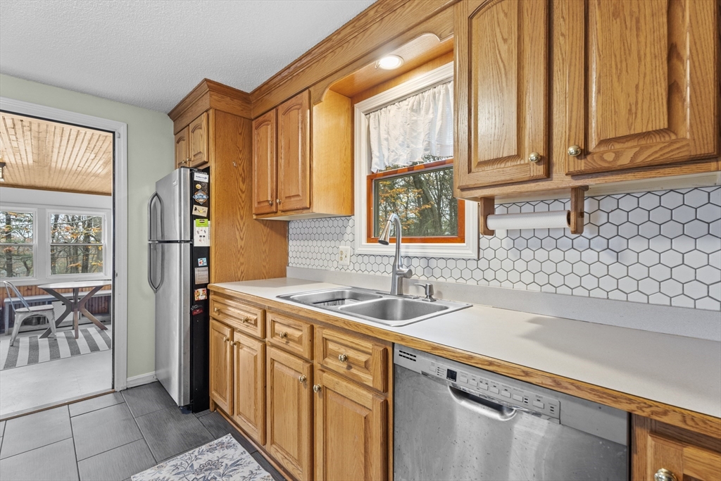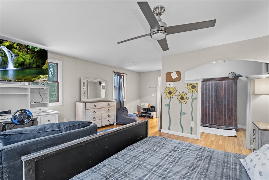Spacious 3 bed 1 bath ranch with a private .78 acres, 2 car garage, & many updates! Single level living or utilize the partially finished basement area, flexible layout provides options with both levels. Enter into a spacious living room w/ cozy wood stove & oversized entry to kitchen area - beyond that is a heated three season room perfect for all the New England seasons, w/ exterior access. Hardwood floors thru living area & bedrooms all w/ great closet space. Ample sized bathroom w/ first floor laundry & double vanity. Primary bedroom has additional 8x8 office/closet/flex space. Partially finished basement can be used for additional living space & connects directly to left side garage stall, right side garage stall is accessed via exterior door. Commuter location w/ the MBTA, Route 2, 2A, 31, & 140 all just minutes away, tucked away but still close to local amenities. Roof 6 years old, solar (2020), electrical panel (2018), new water tank, new mini splits heat/ac (2025).
