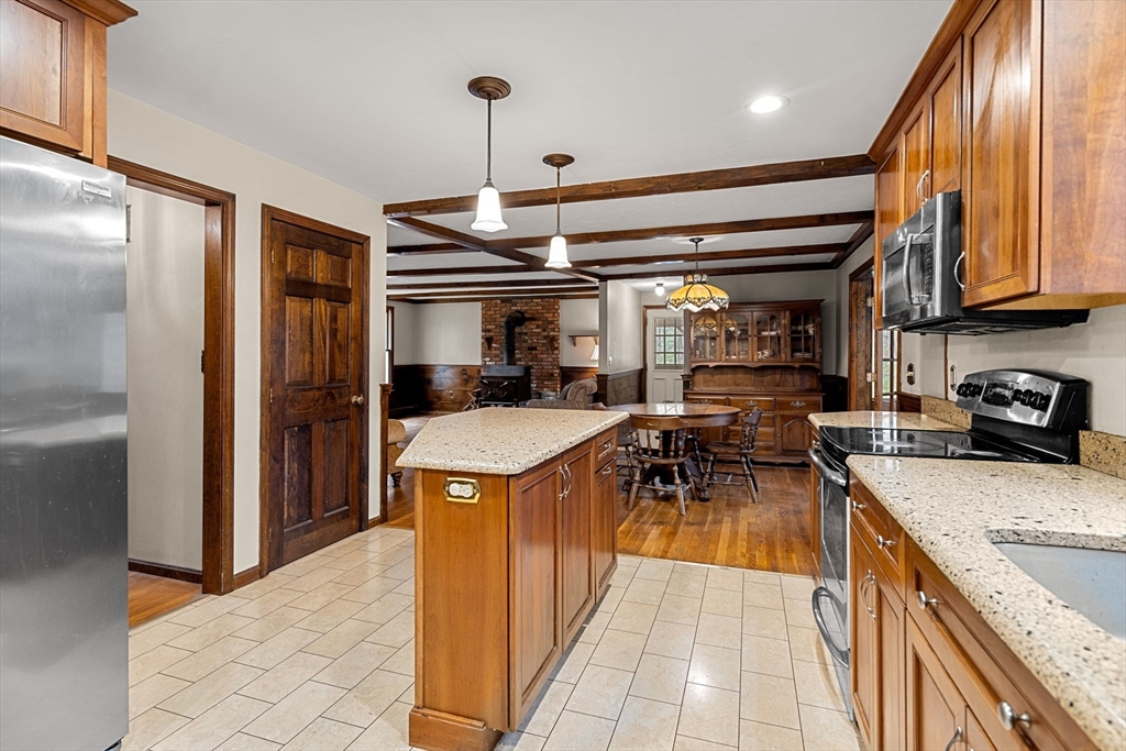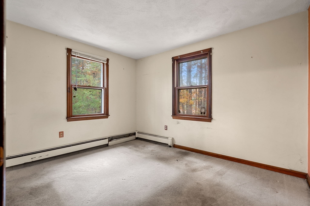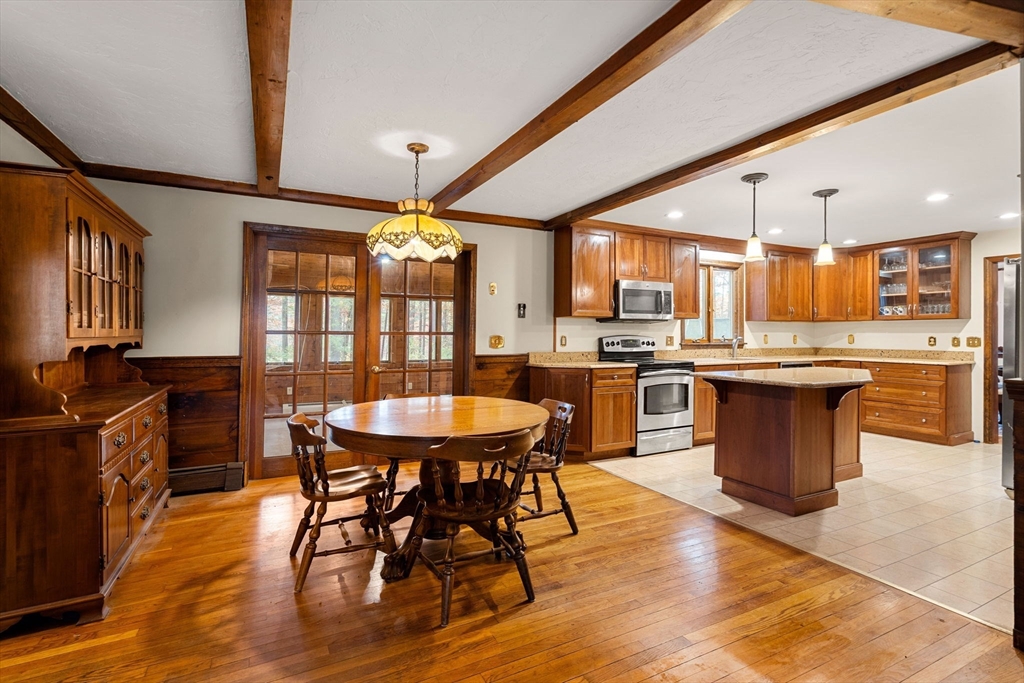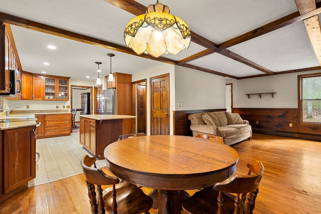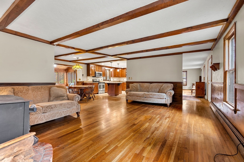 Opportunity in knocking! Nestled at the end of Off Groton School Road in Ayer, this single-family residence in Middlesex County presents an inviting home, ready to move in and begin its next chapter. The large family room w/ woodstove stands as a testament to comfort and style, inviting relaxation beneath a beamed ceiling, complemented by a distinctive wood wall that adds warmth and character. The eat-in kitchen, designed with functionality in mind, features a large kitchen island, perfect for meal preparation and casual dining, SS appliances & ample counter space. Heated sunroom/enclosed porch, half bath w/ laundry, formal dining room and formal living room complete the first floor. This property offers four spacious bedrooms and two full bathrooms on the second floor. Privacy abounds in the wooded backyard. Lots to love!